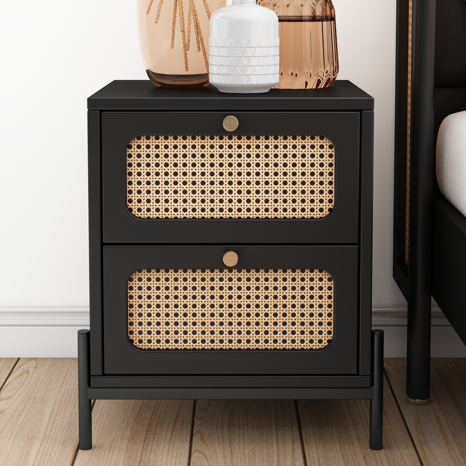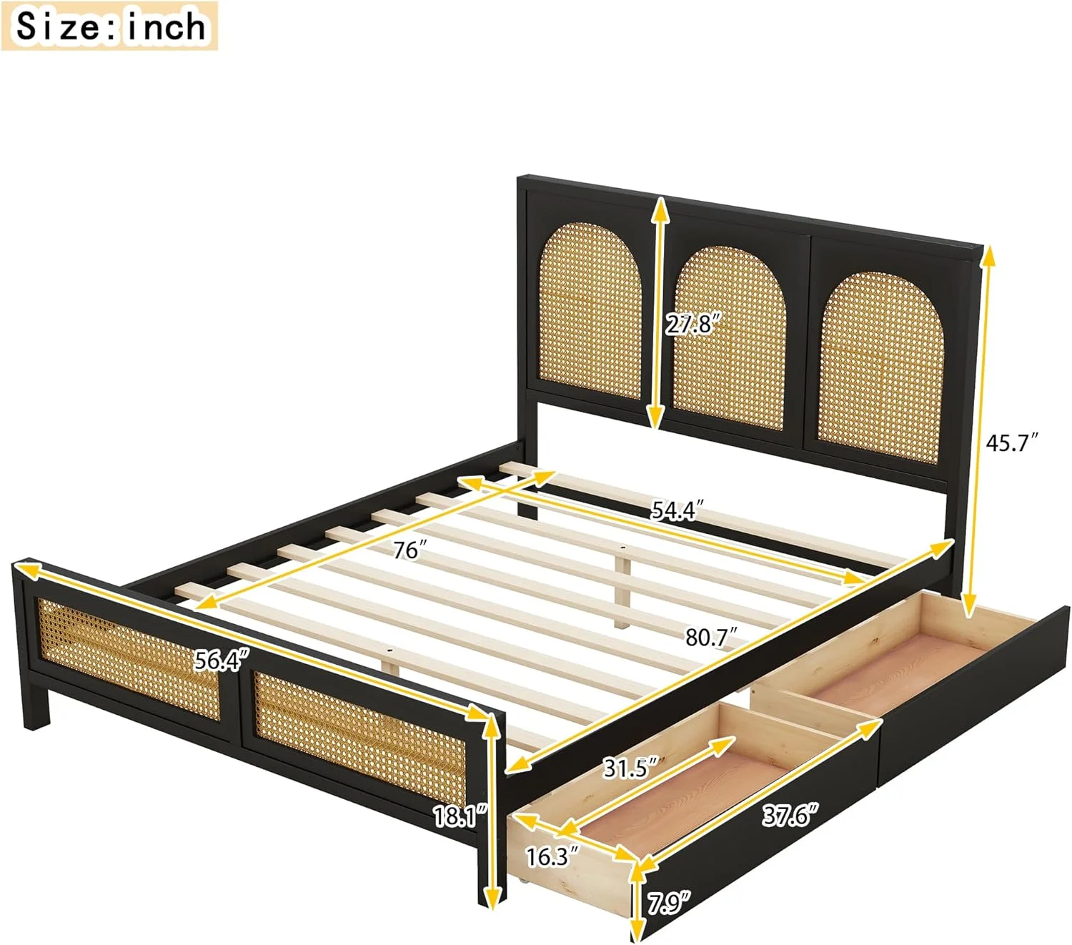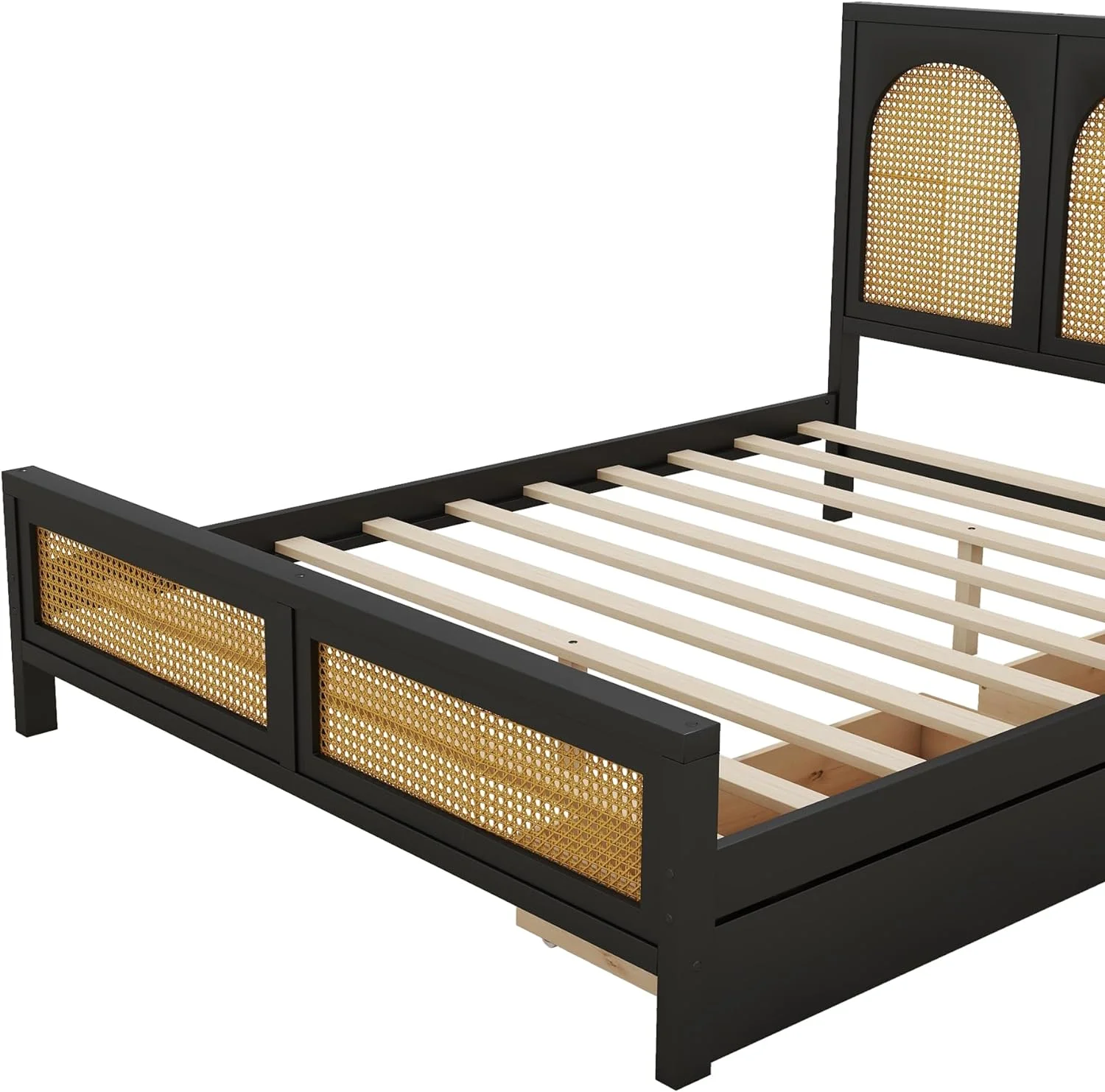 Queen Size Wood Storage Platform Bed with 2 Drawers, Rattan Headboard and Footboard, Black