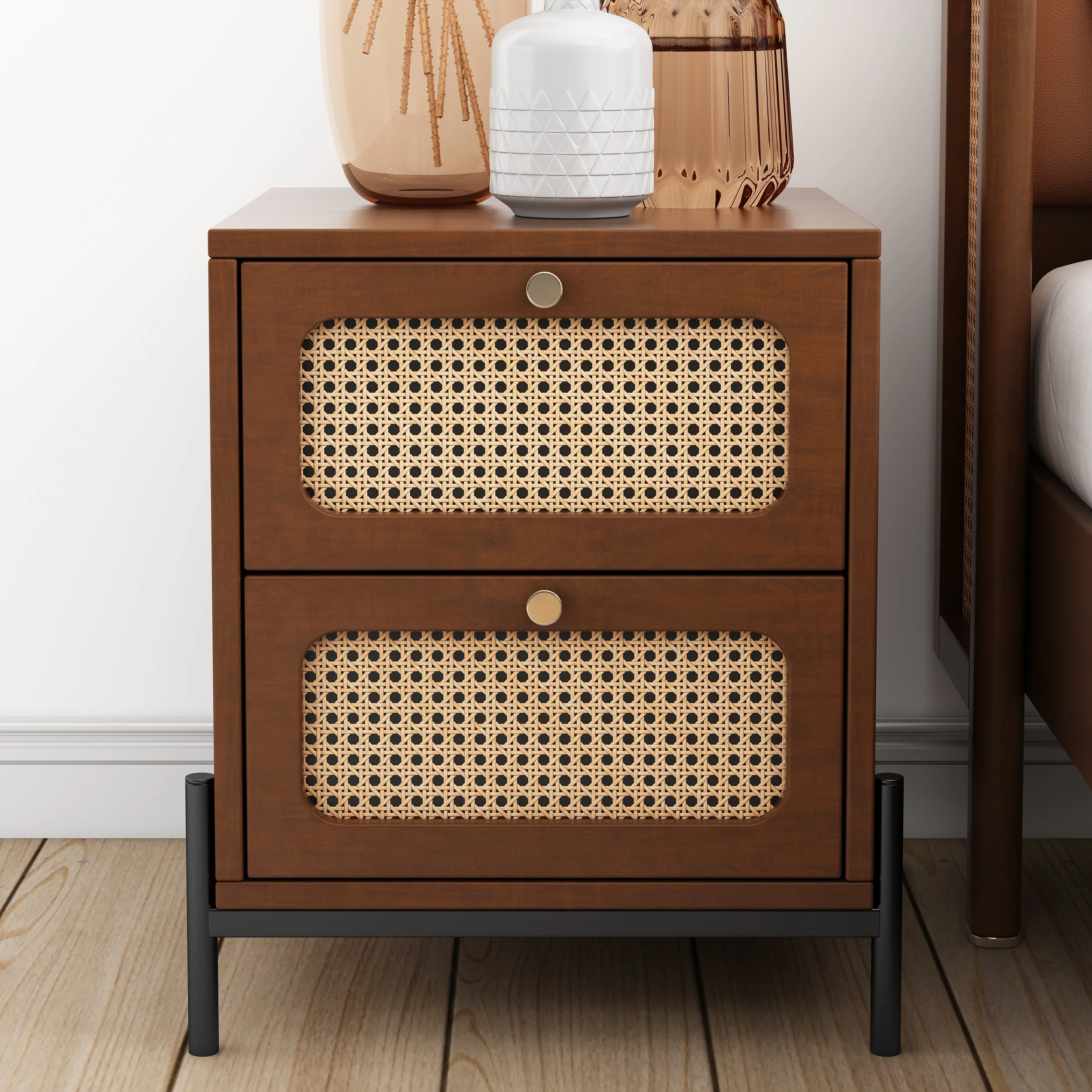 CoSoTower 3 Pieces Modern Cannage Rattan Platform Queen Bed + Nightstand*2, Walnut