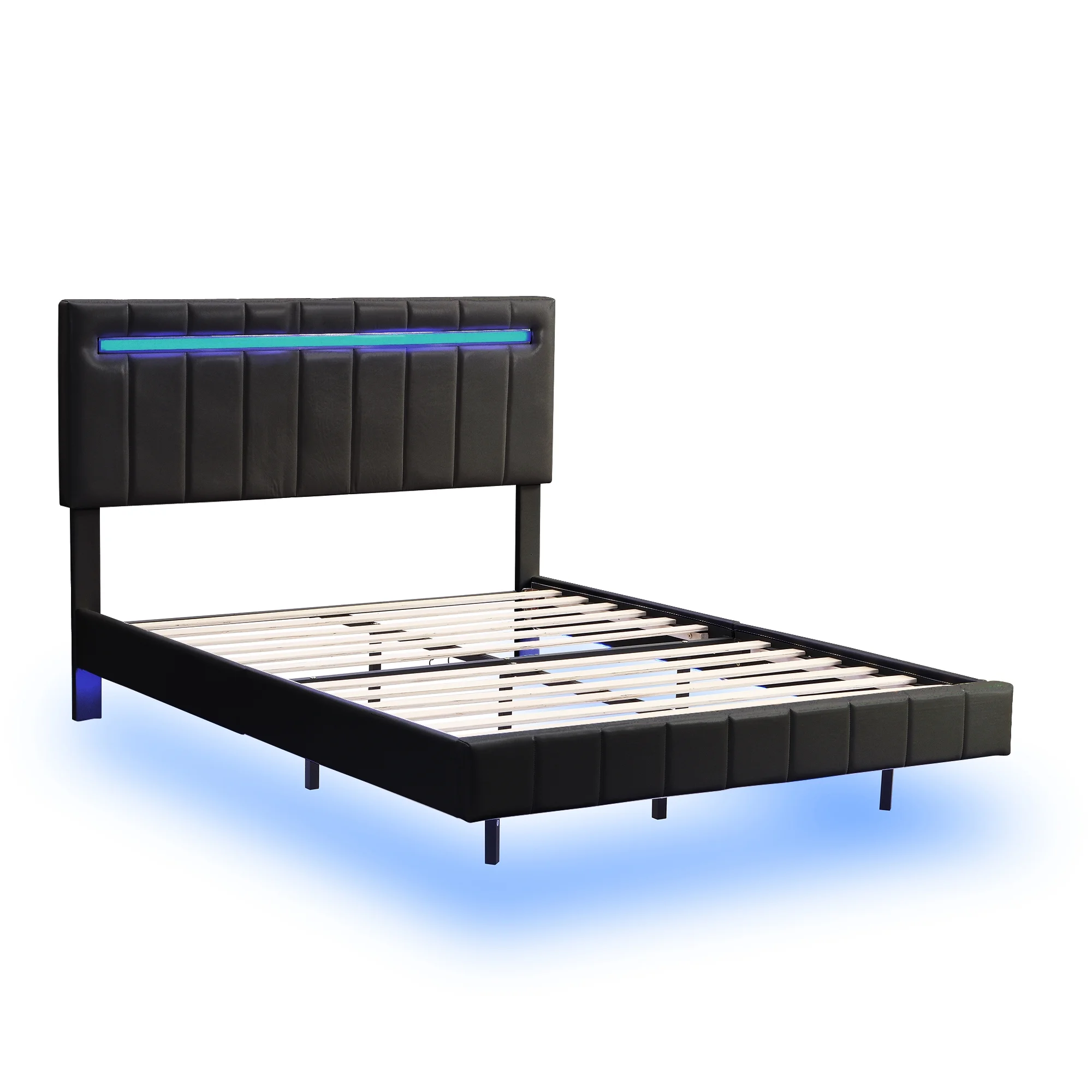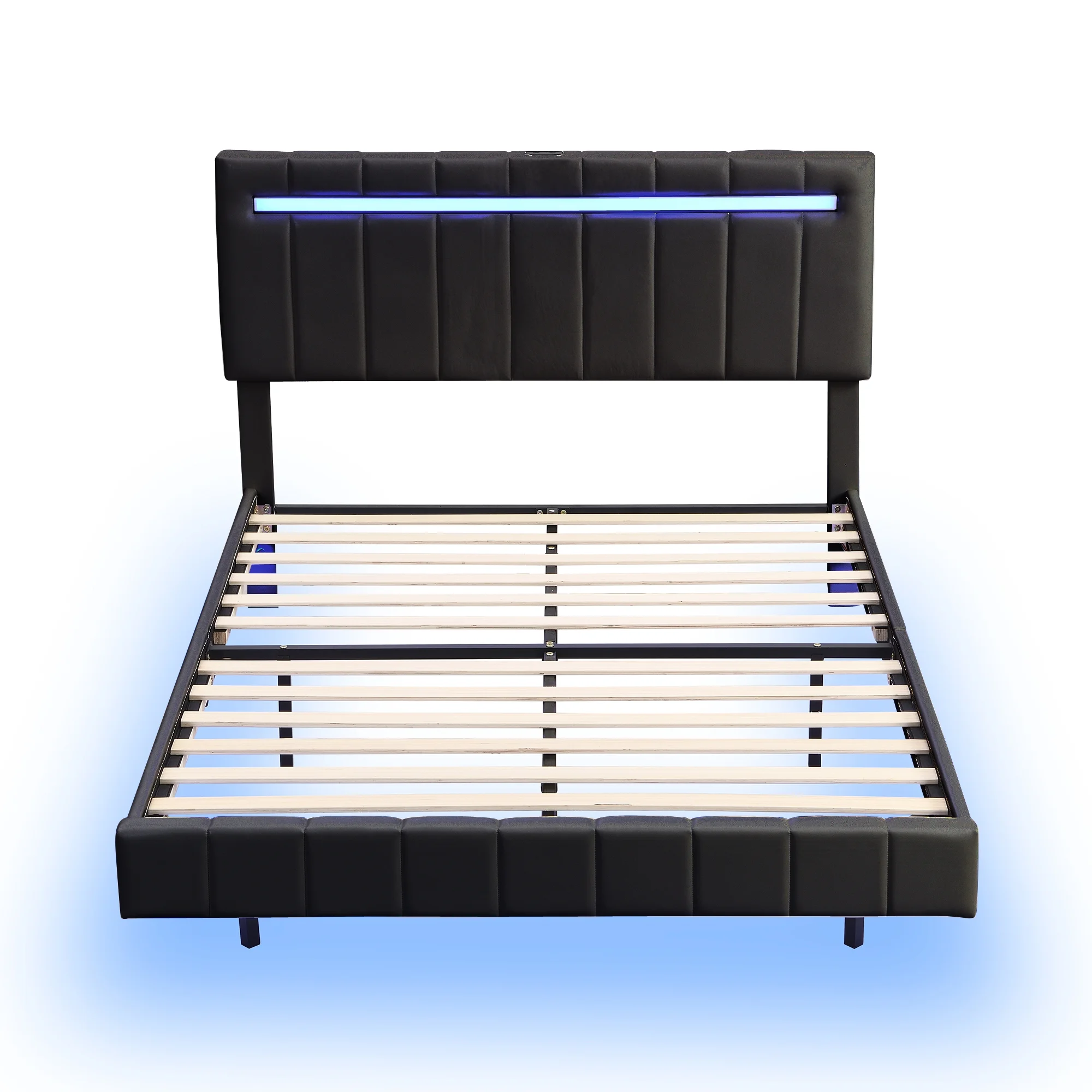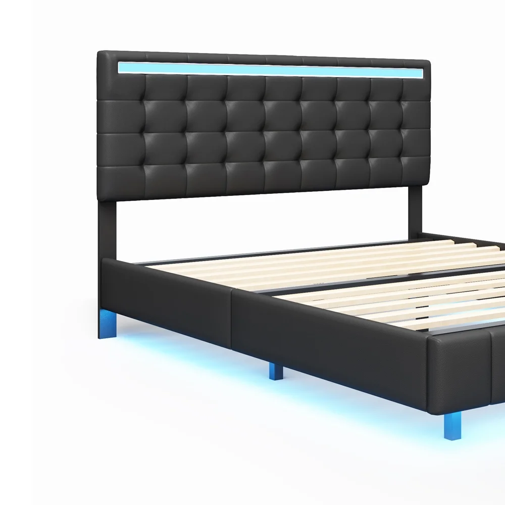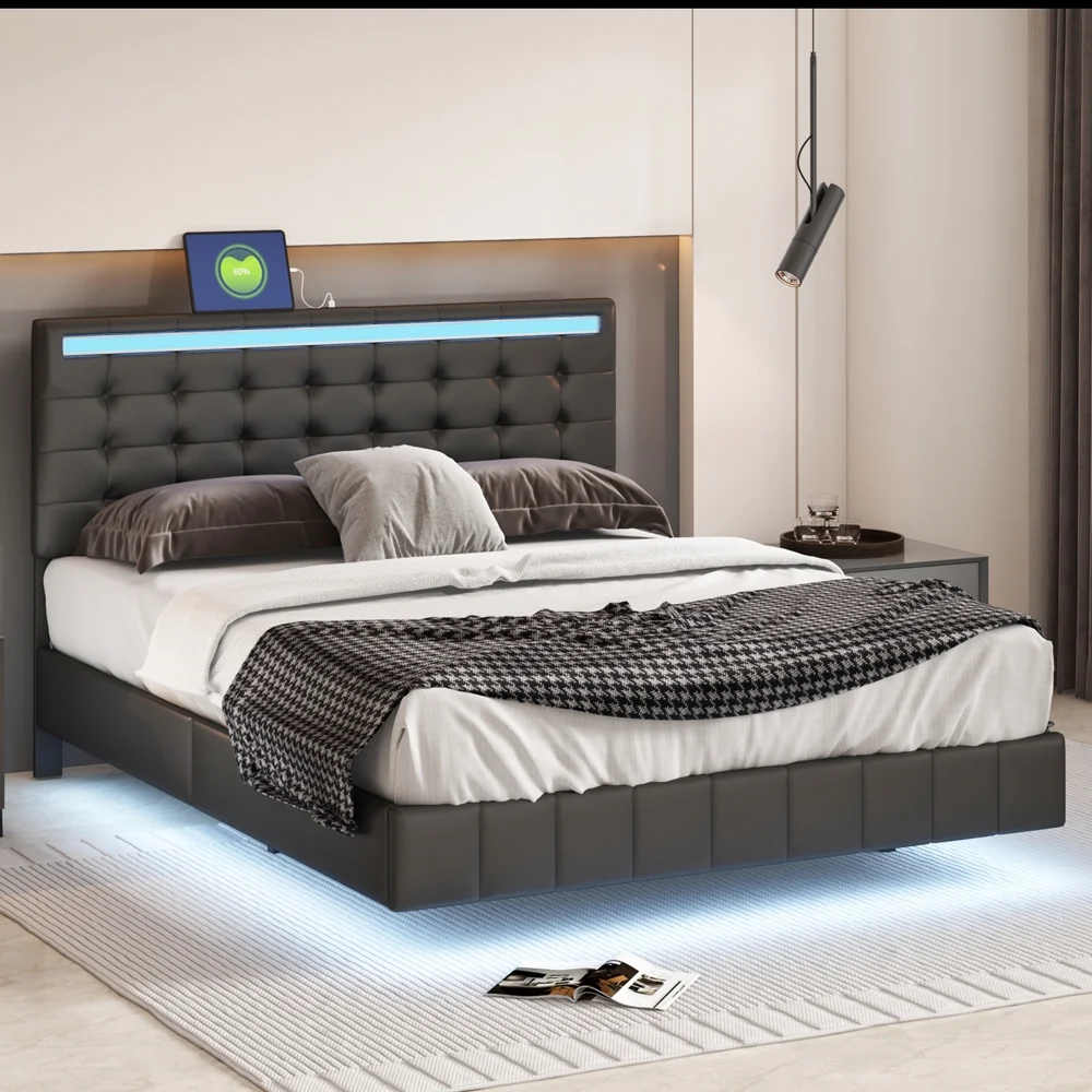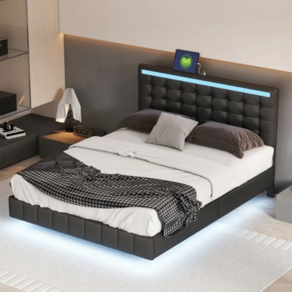 Queen Size Floating Bed Frame with LED Lights and USB Charging,Modern Upholstered Platform LED Bed Frame,Black Black + PU