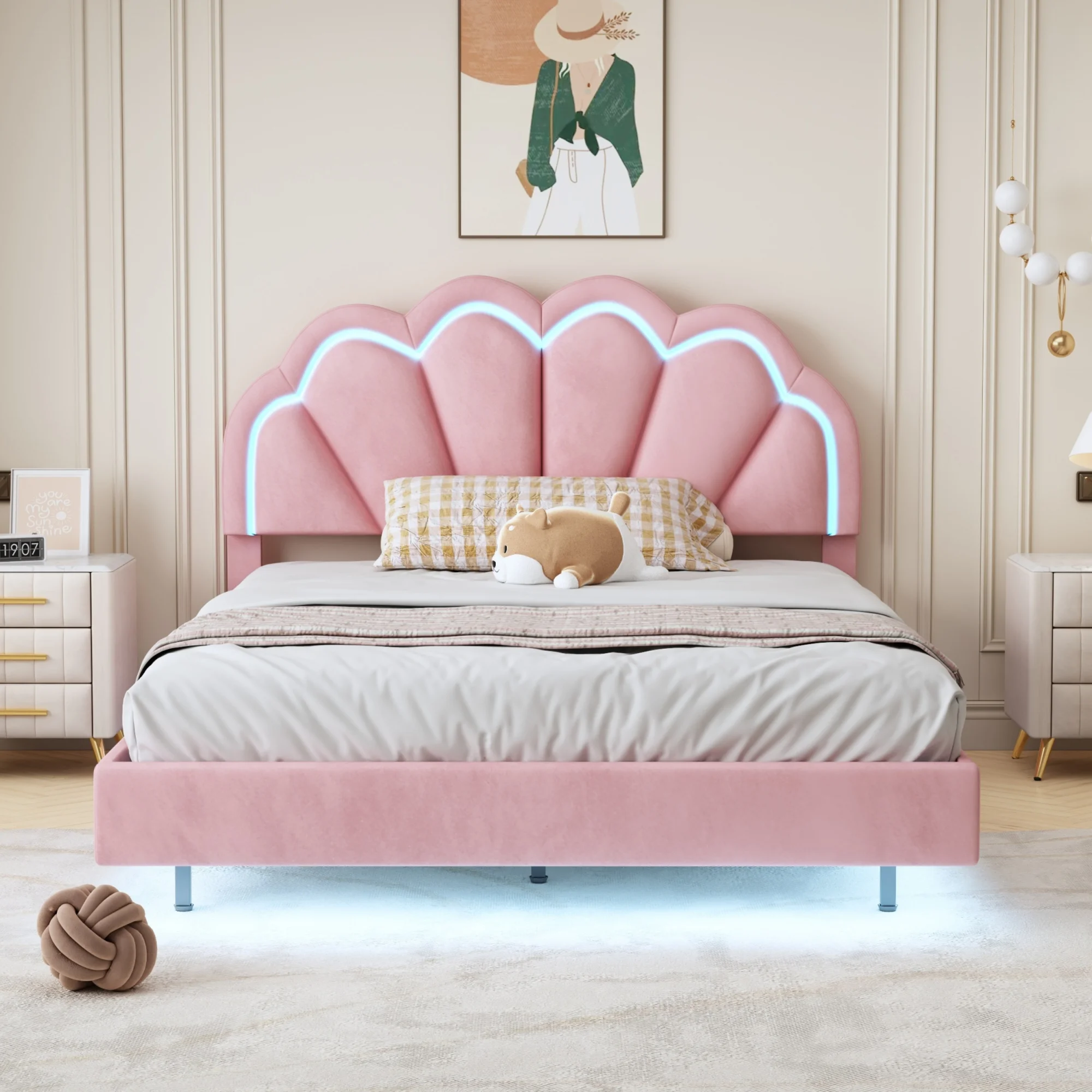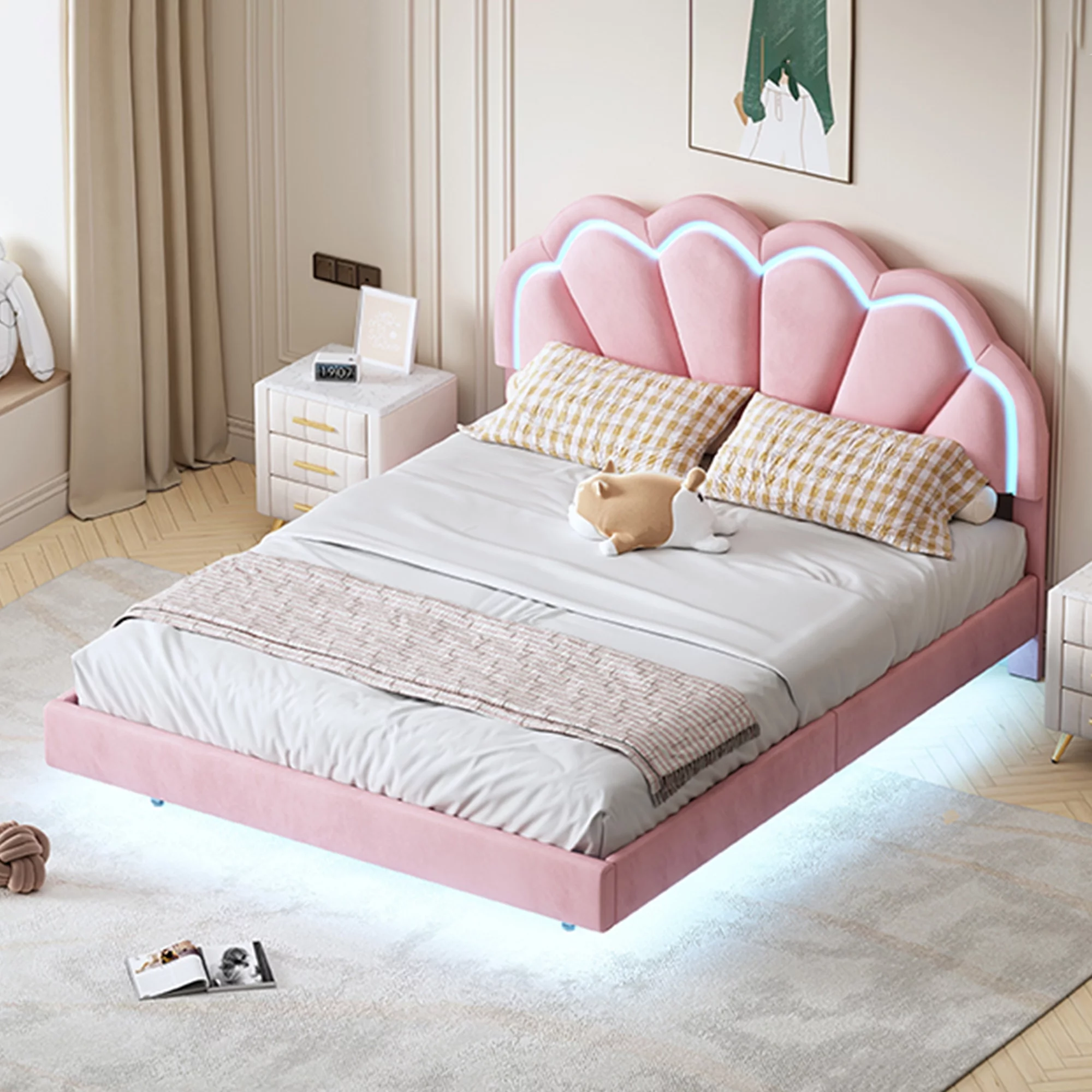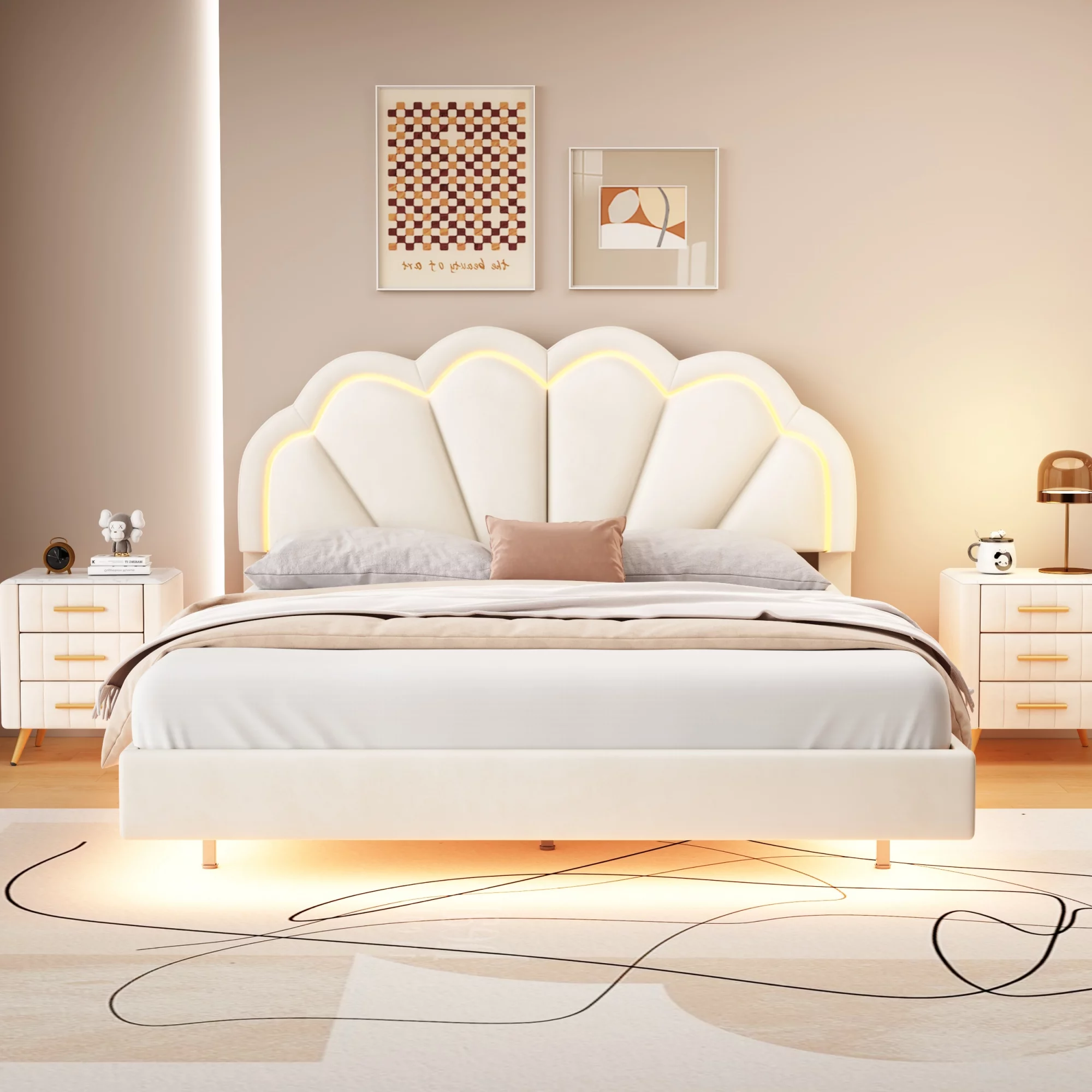 Queen Size Floating Bed Frame with LED Lights and USB Charging,Cosymart Modern Upholstered Platform LED Bed Frame,Beige