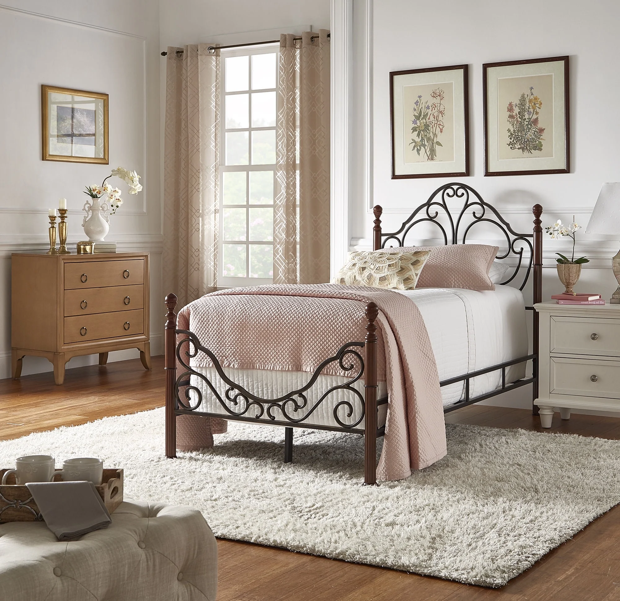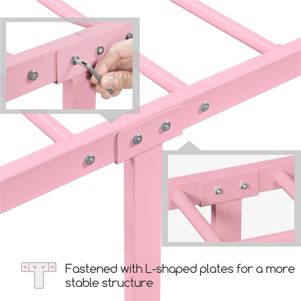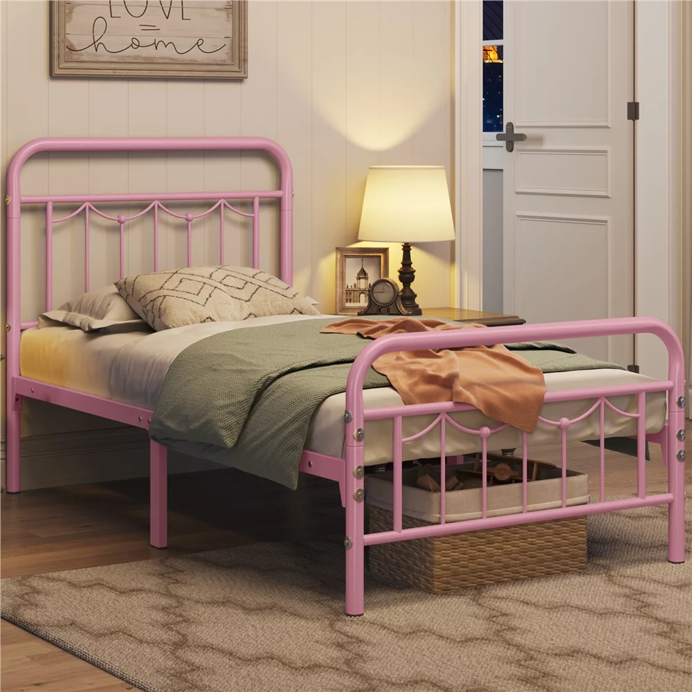Smile Mart Twin Size Metal Bed Frame with Vintage Headboard and Footboard, Pink