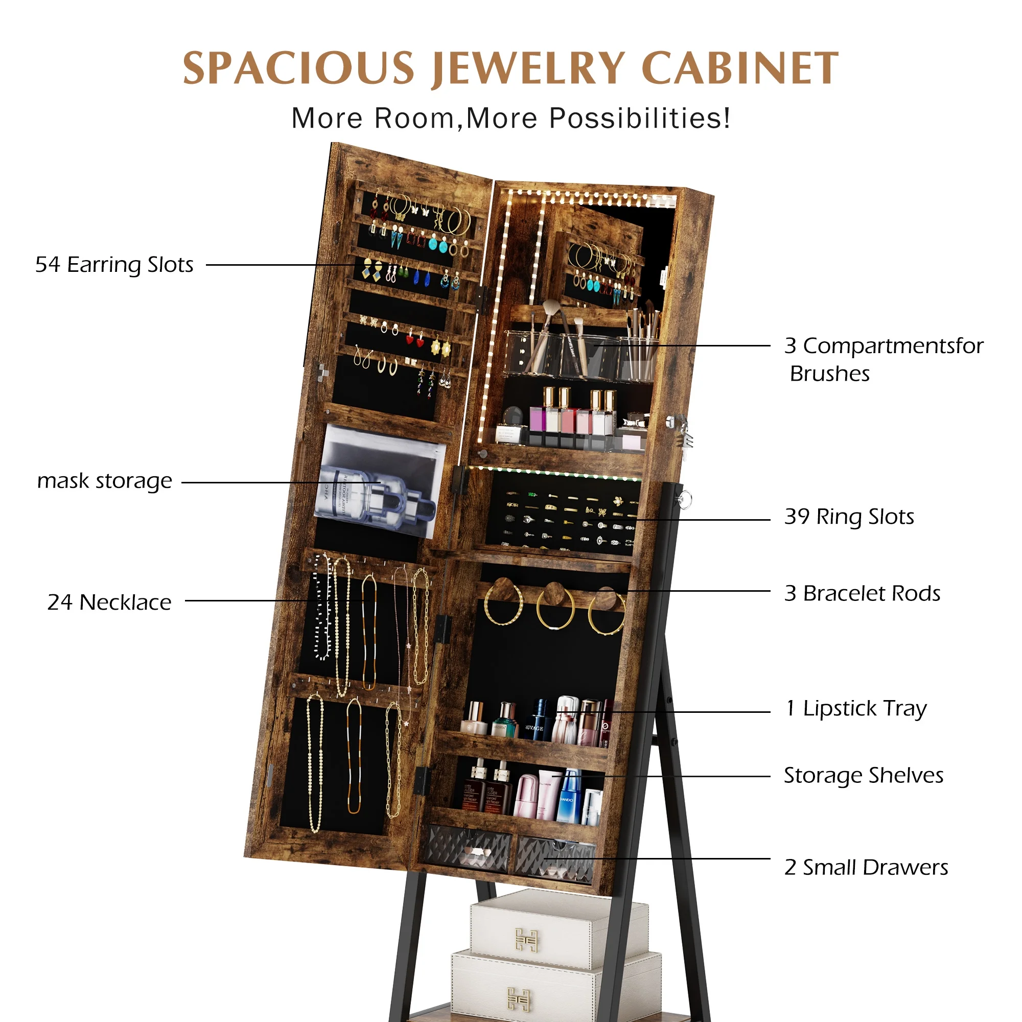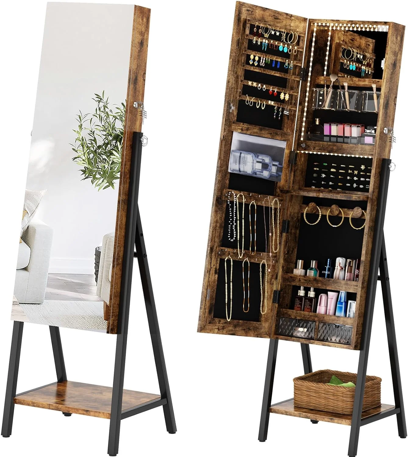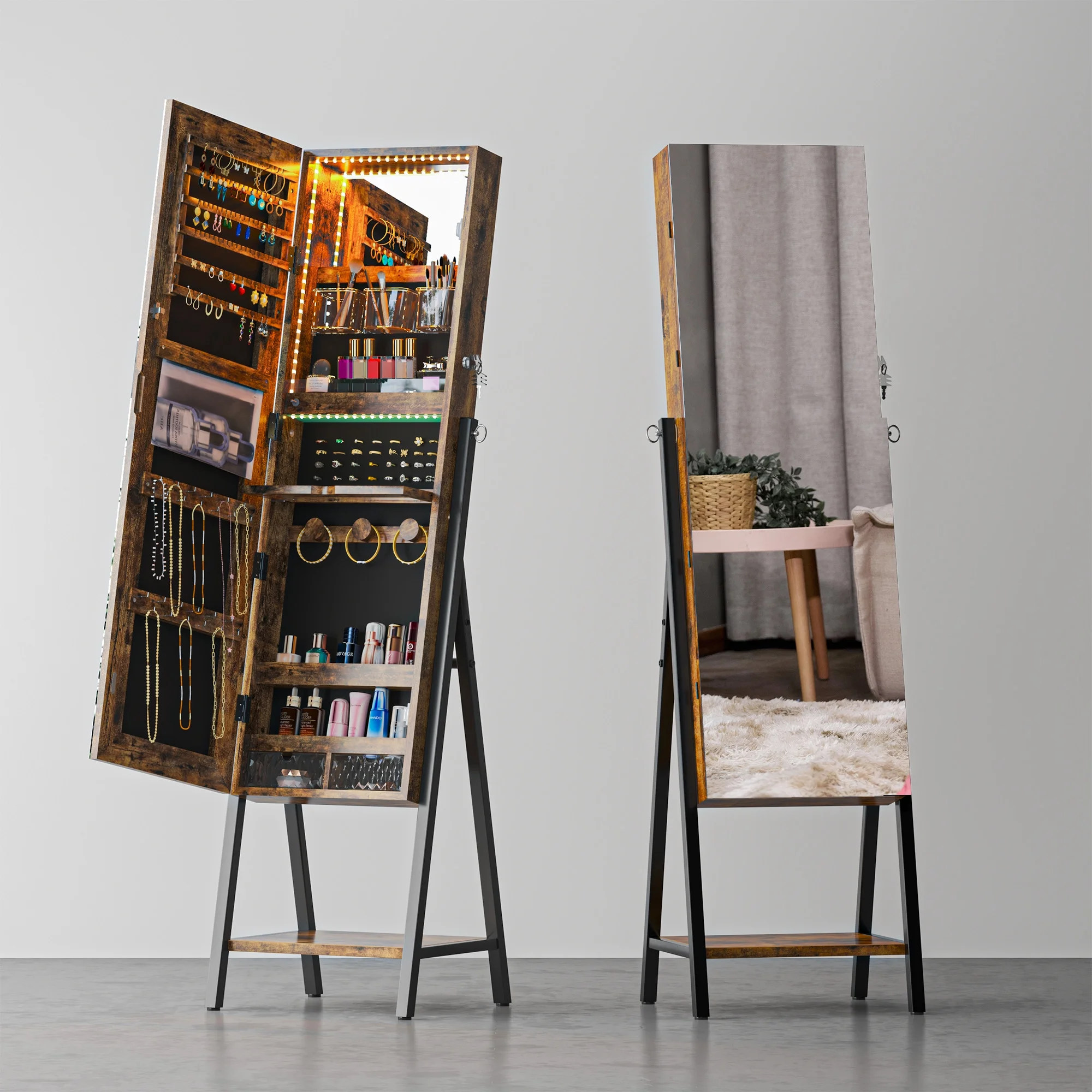 Soges Full Mirror with Stand, Cheval Mirror Cabinet, Full Length Dressing Floor Mirror with LED light Belt,Brown