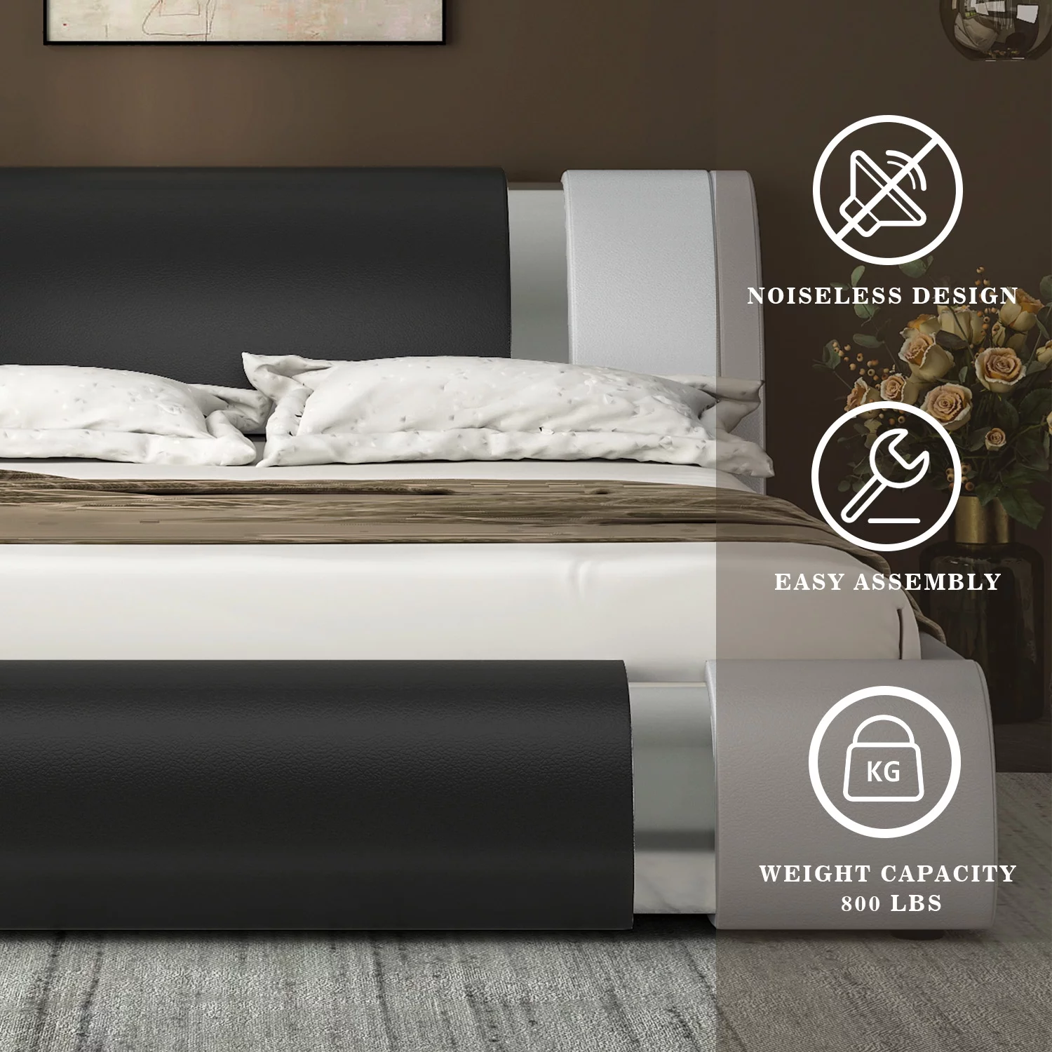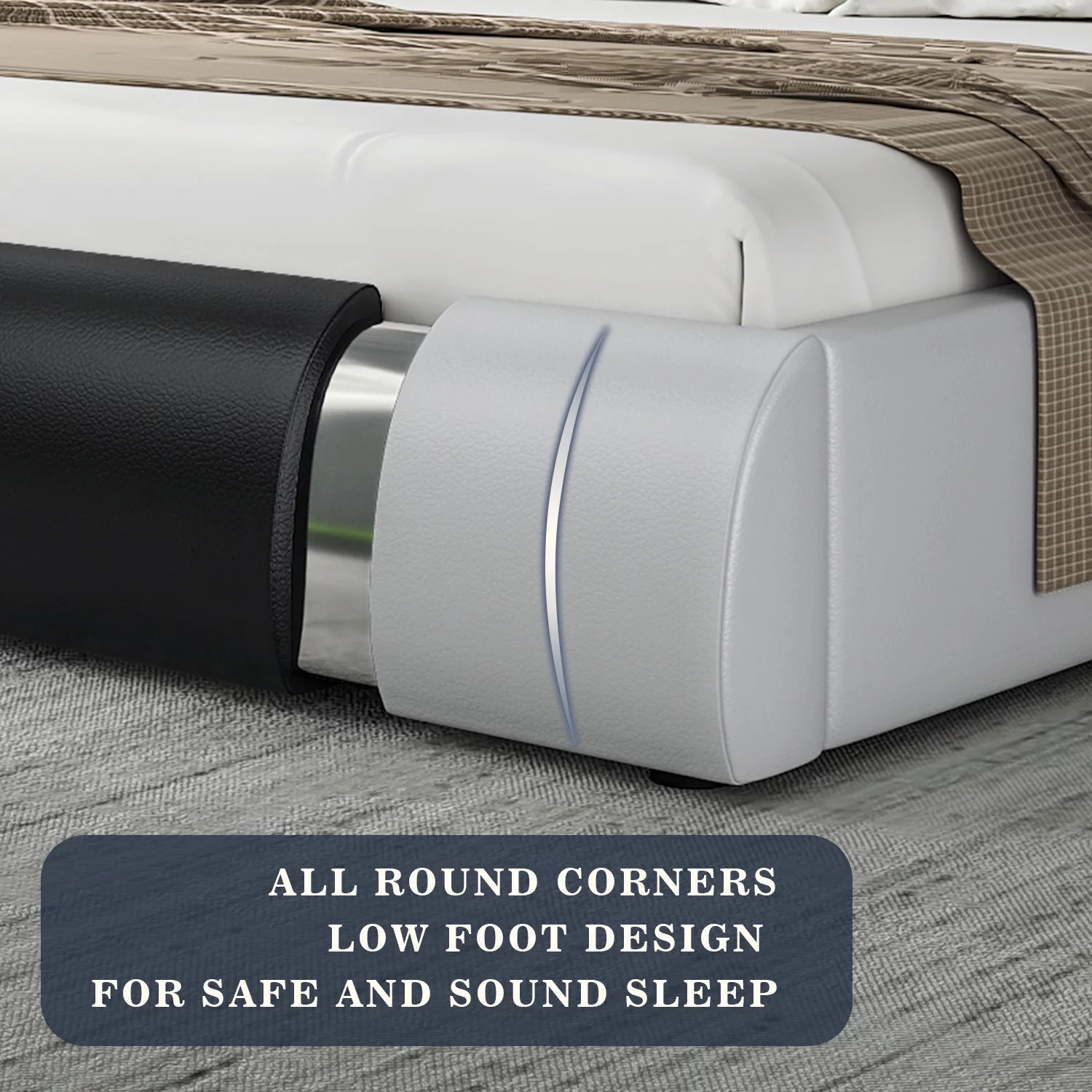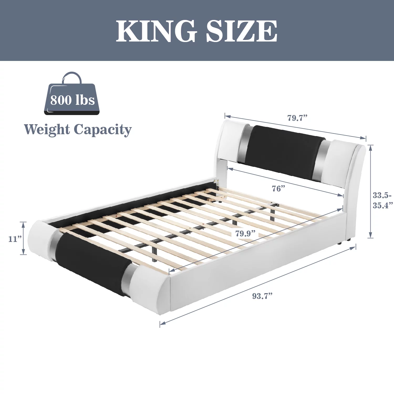 Allewie King Size Faux Leather Upholstered Platform Bed with Iron Piece Decoration Adjustable Headboard, Black and White