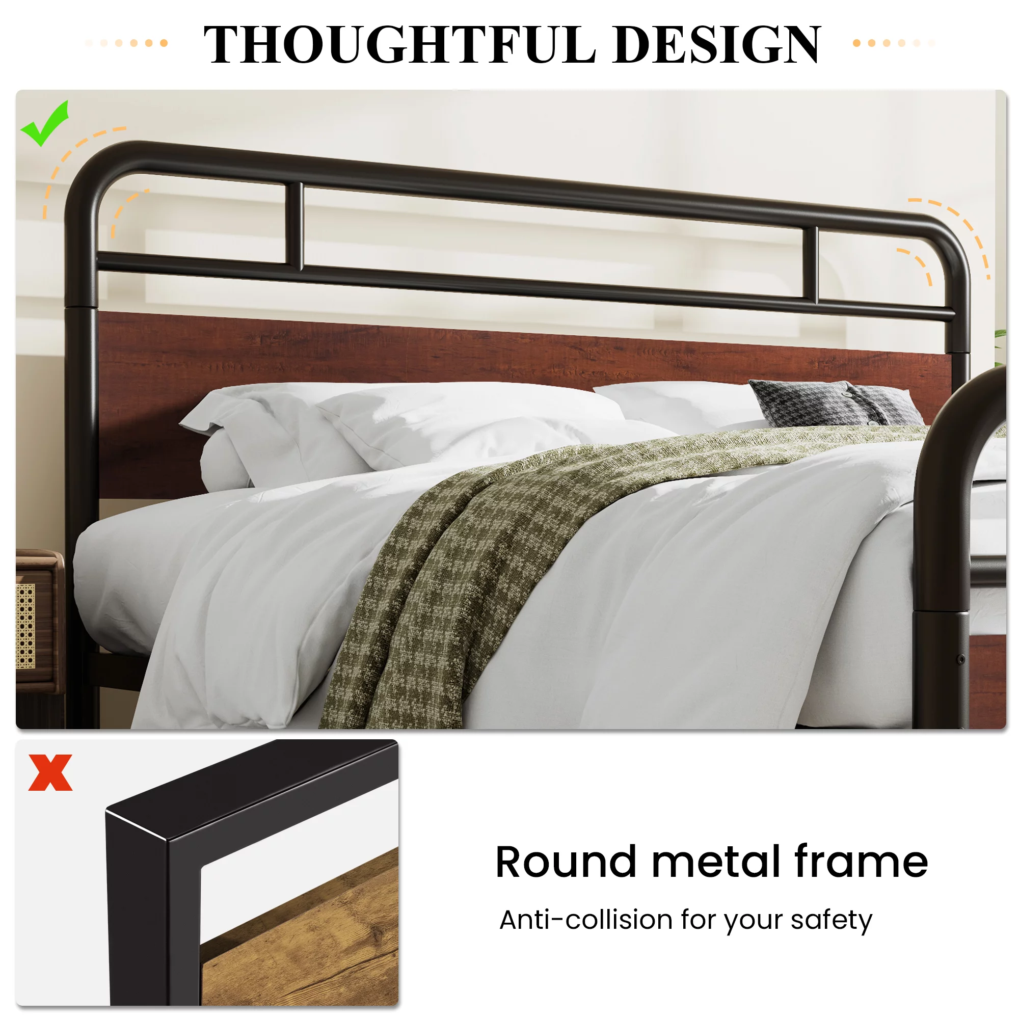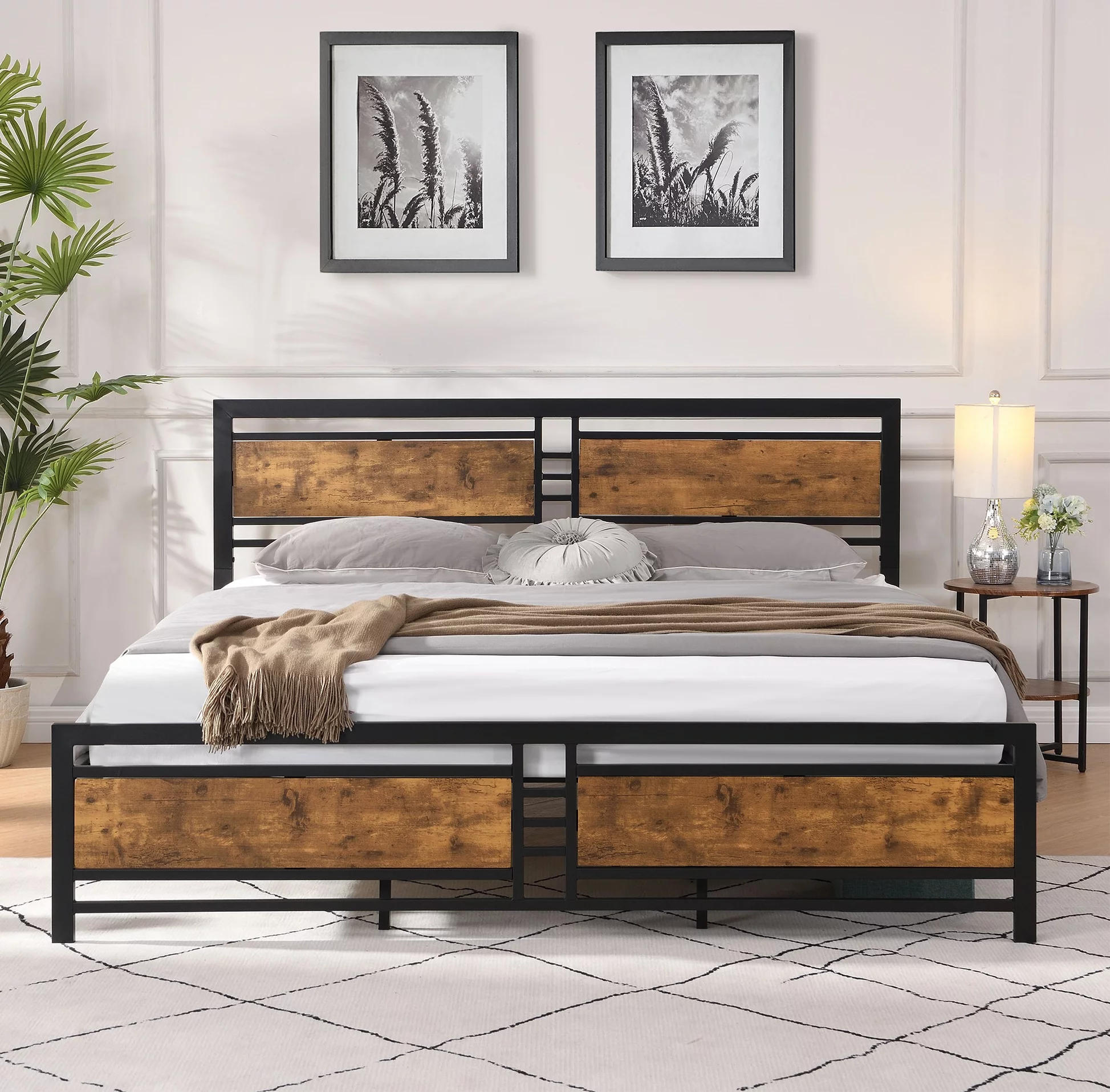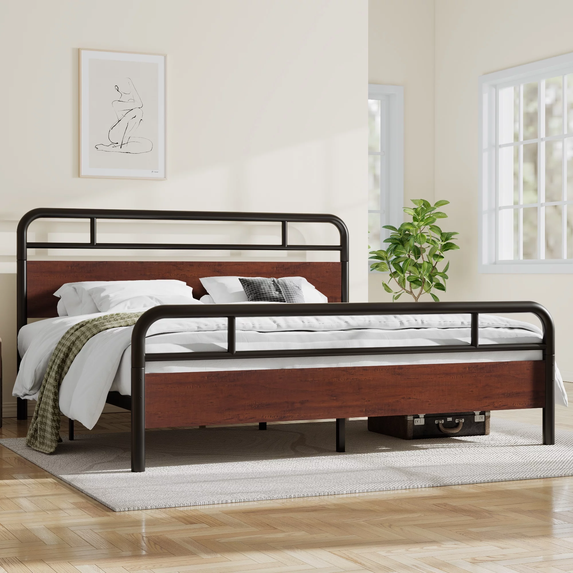 Sha Cerlin Dark Brown King Size Metal Platform Bed Frame with Industrial Heavy Duty Wooden Headboard