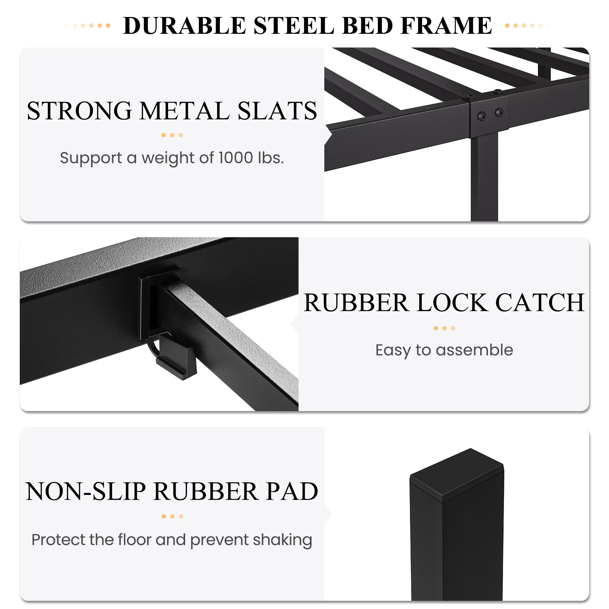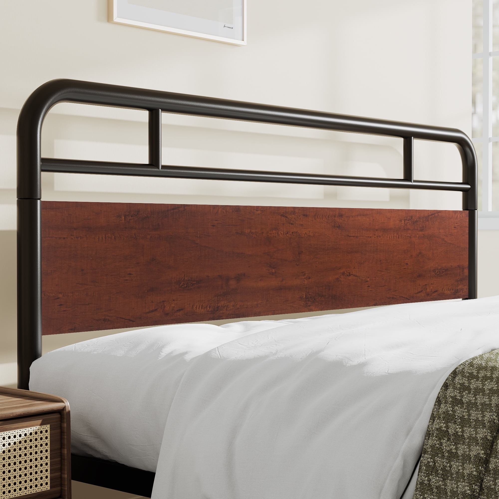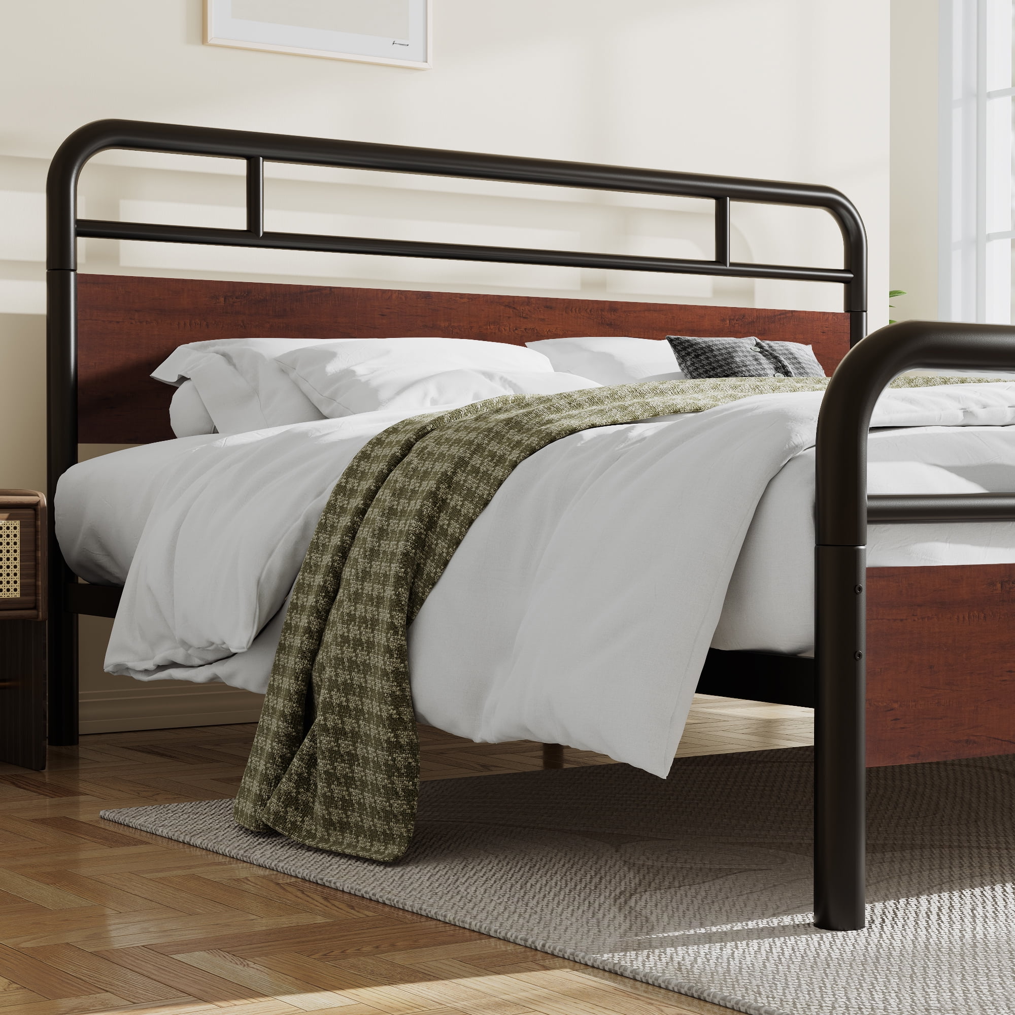 Sha Cerlin Dark Brown King Size Metal Platform Bed Frame with Industrial Heavy Duty Wooden Headboard