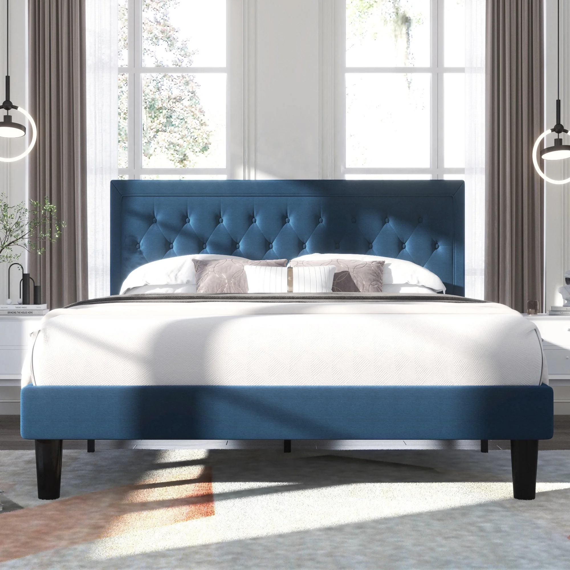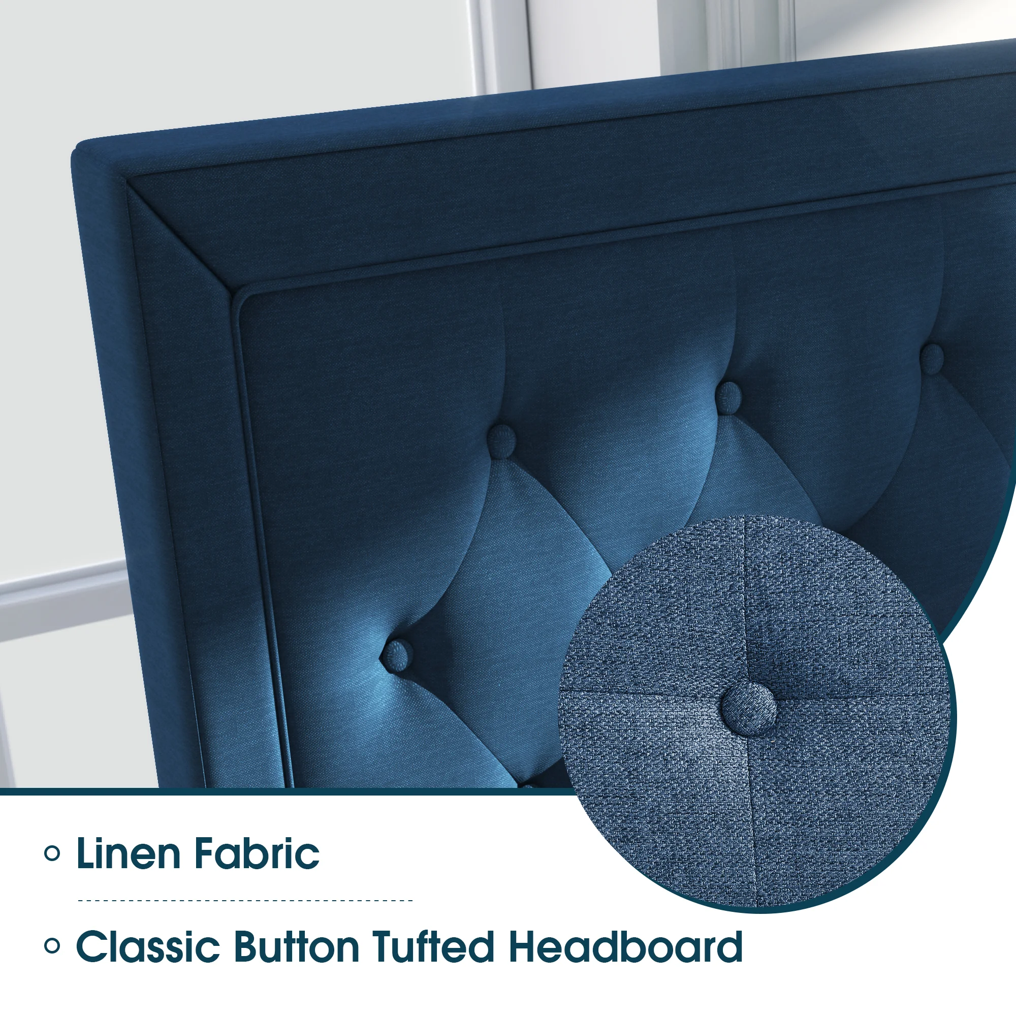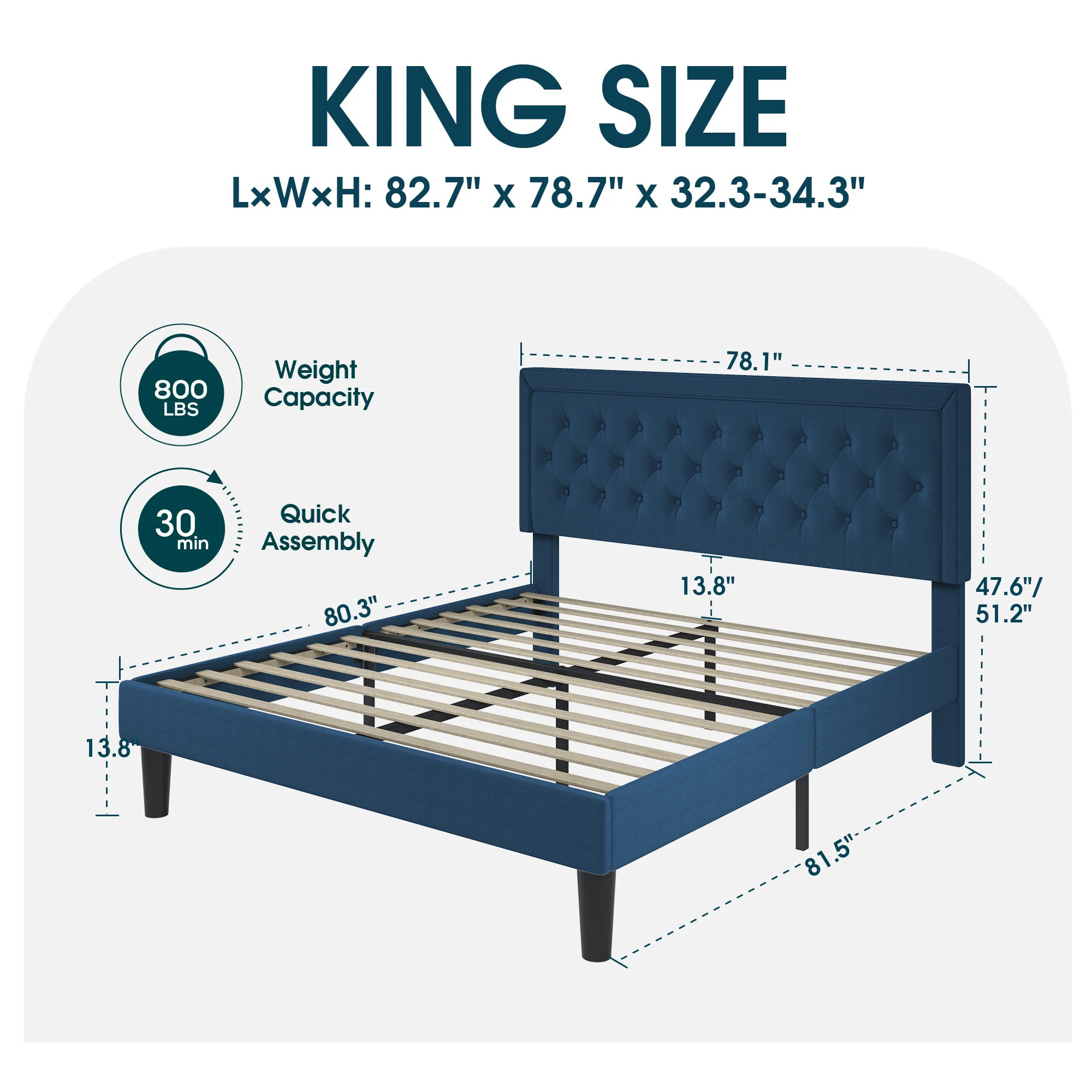 Einfach King Size Upholstered Platform Bed Frame with Adjustable Headboard, Dark Blue