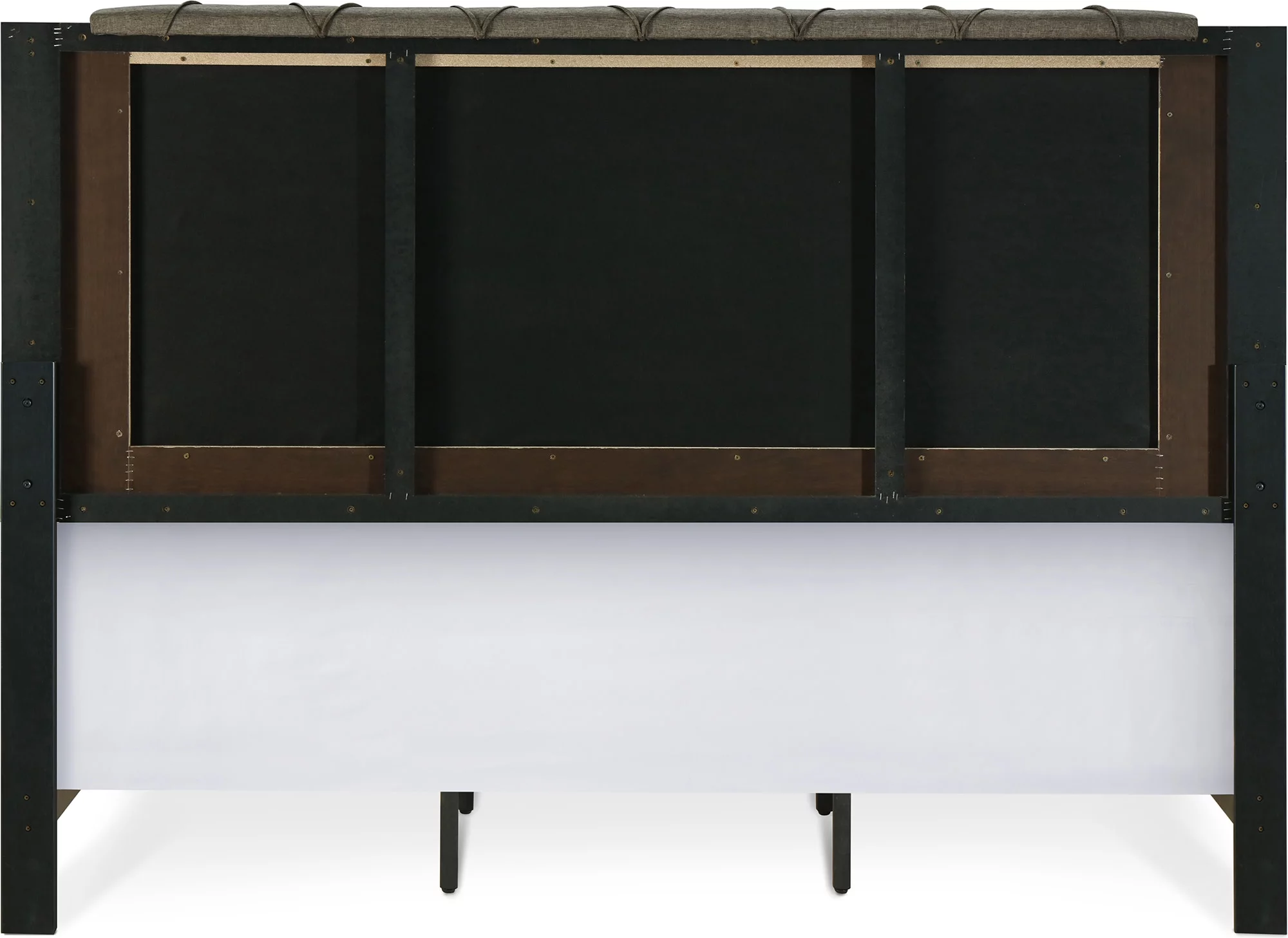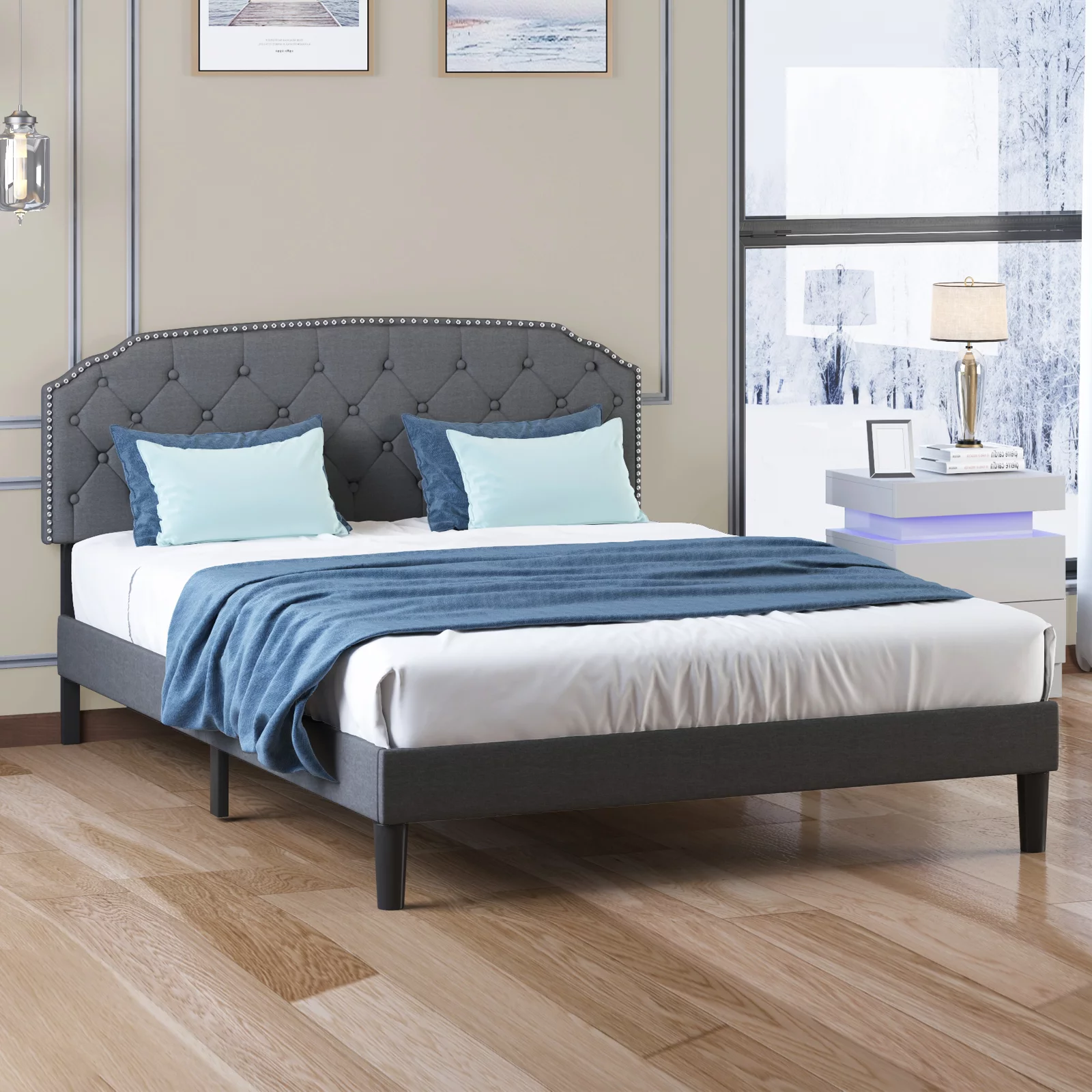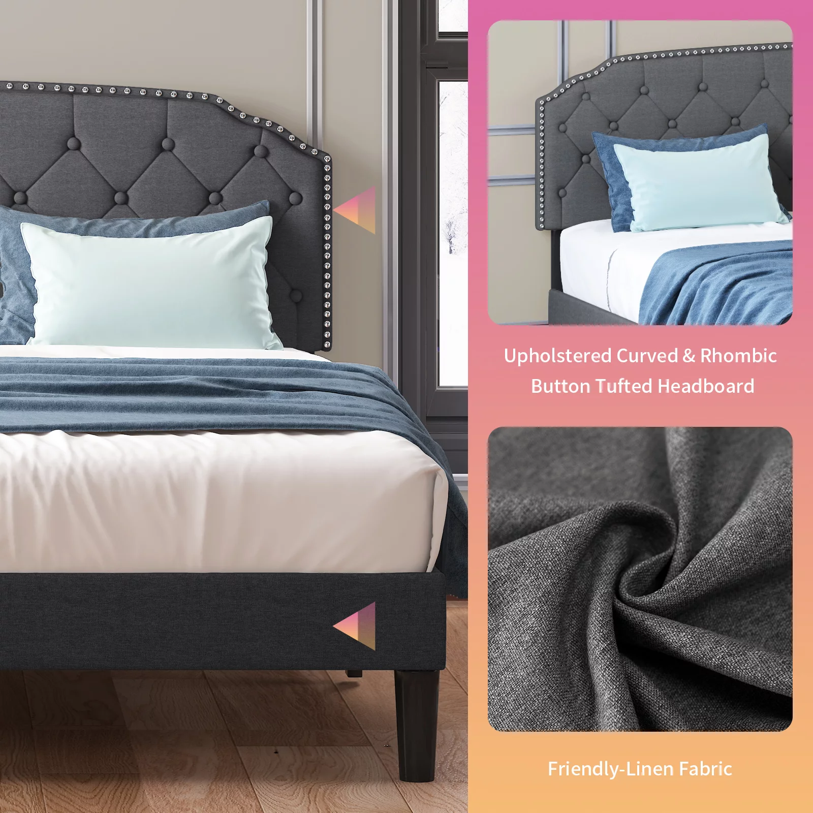 Sha Cerlin Upholstered King Size Platform Bed Frame with Curved Rhombic Button Tufted Headboard, Dark Grey
