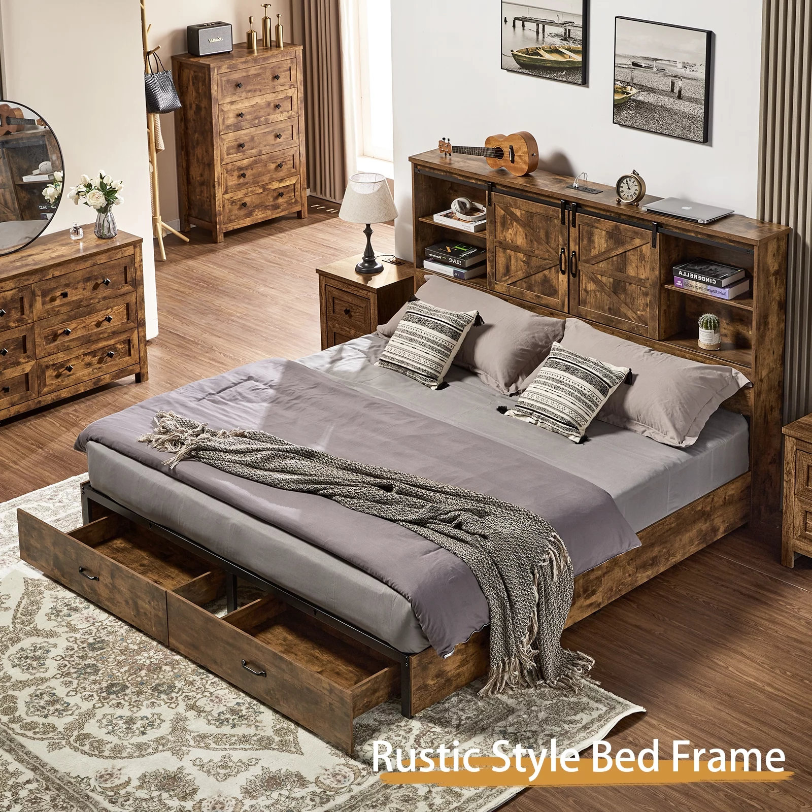 HOWE King Size Wooden Platform Storage Bed Frame with 51.2" Wood Bookcase Headboard(Rustic Brown)