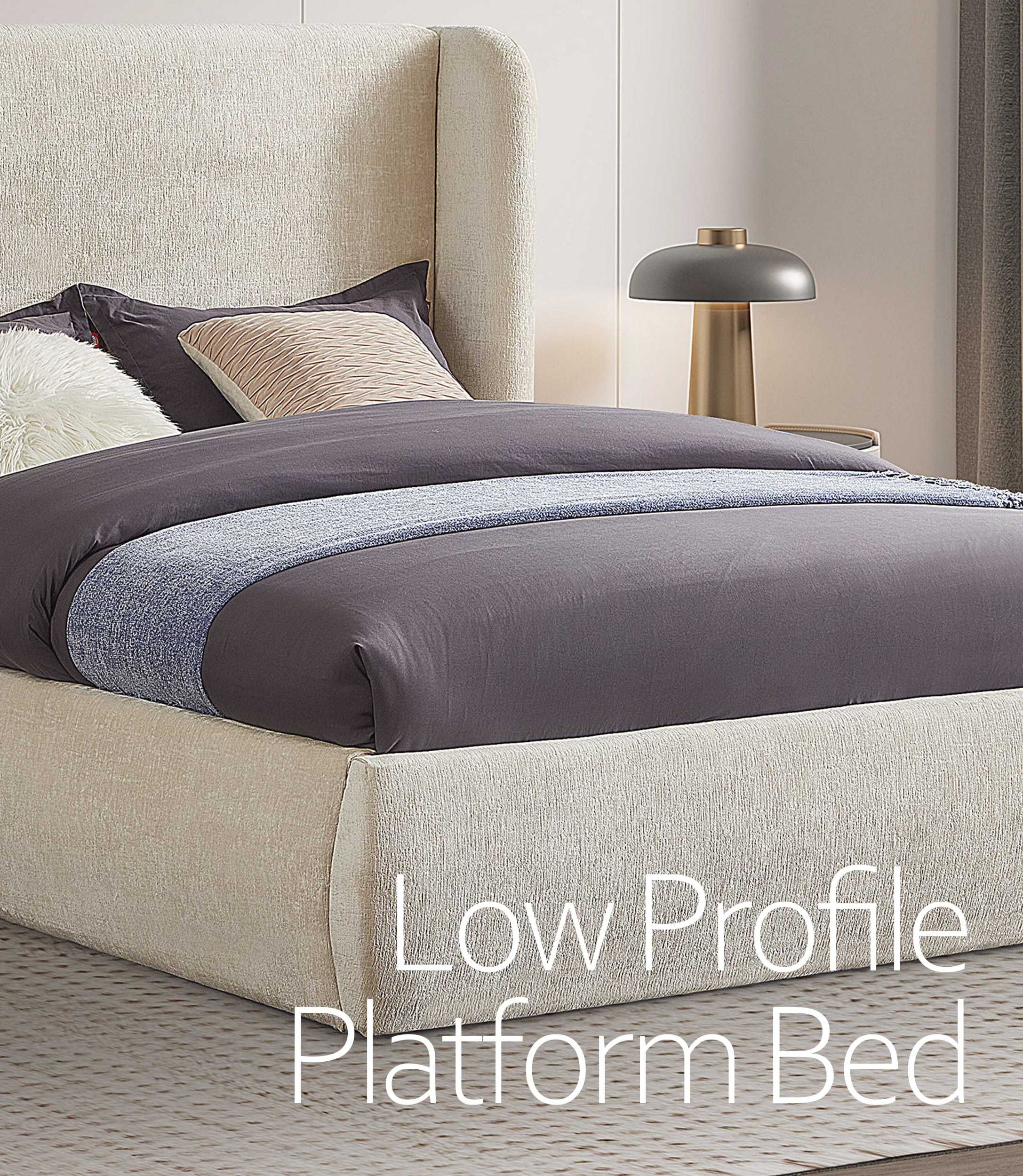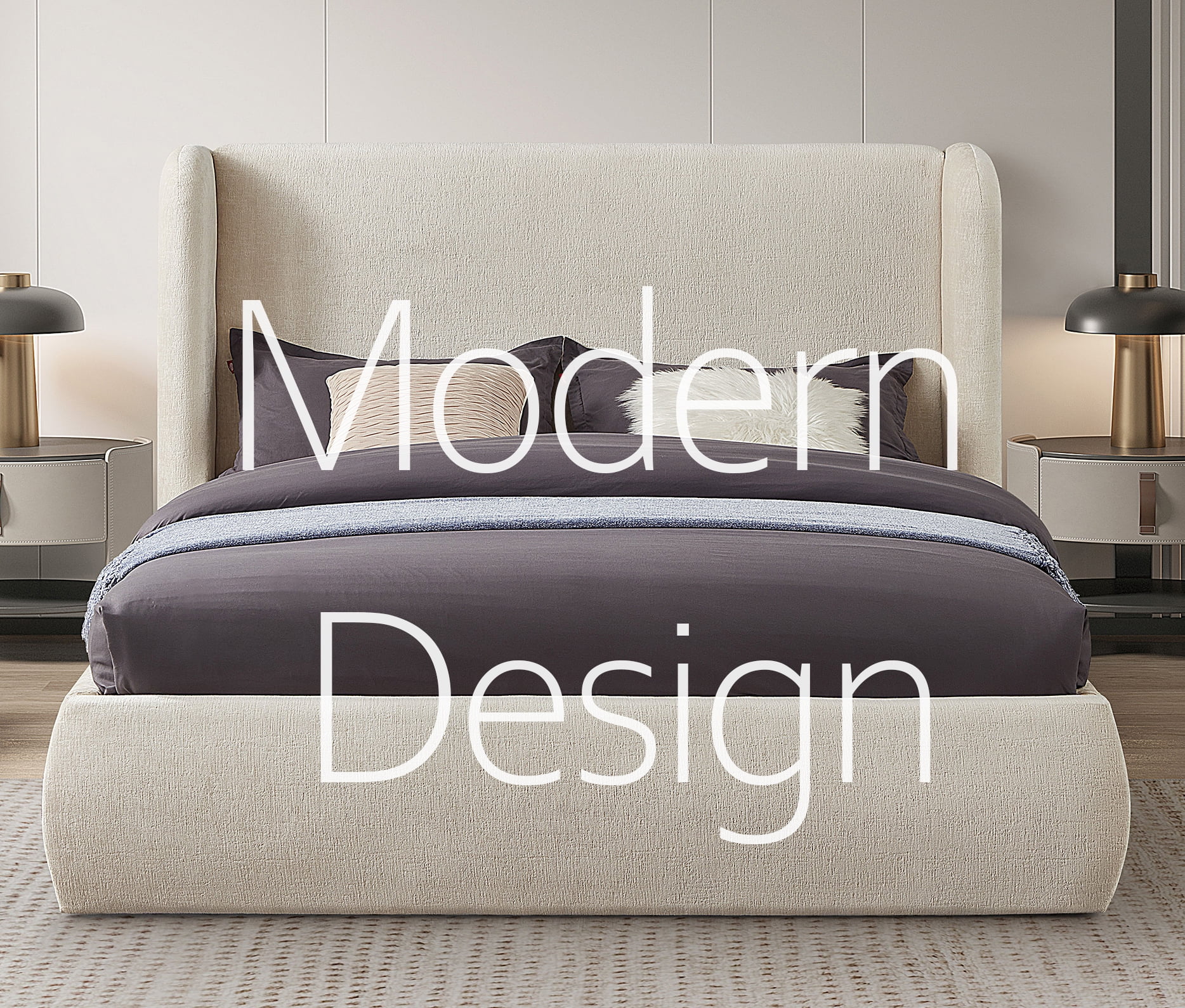 Einfach King Size Platform Bed, Wingback and Geometric Headboard, Beige