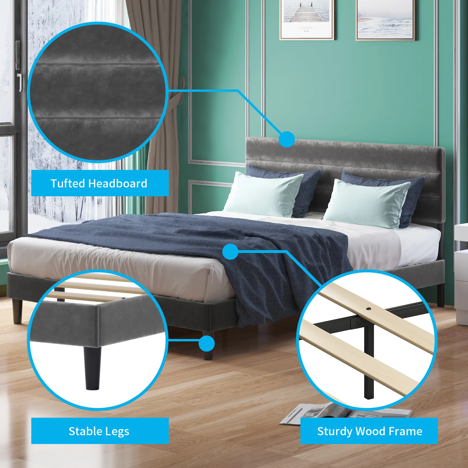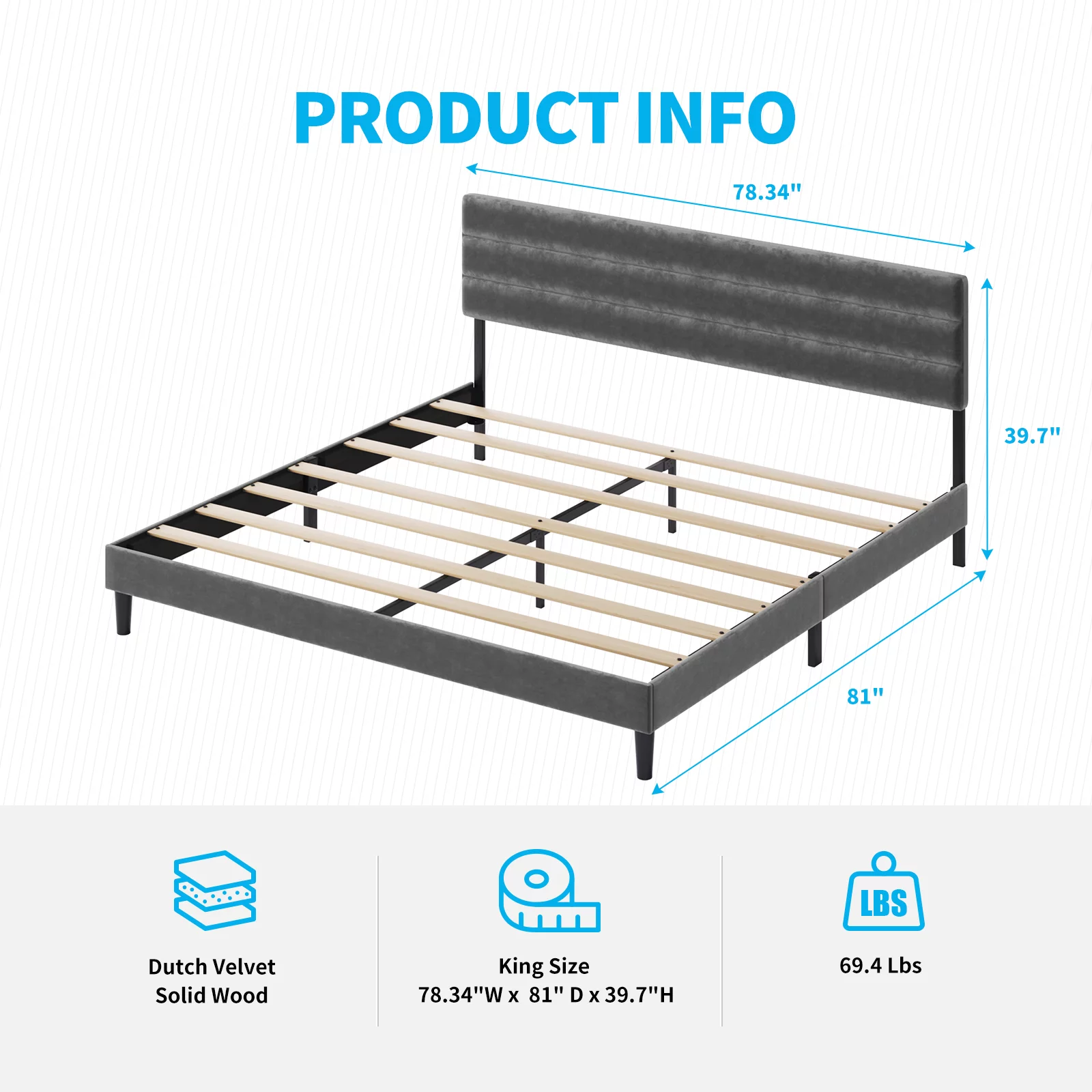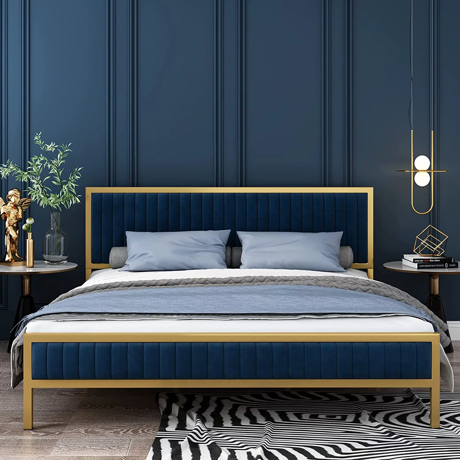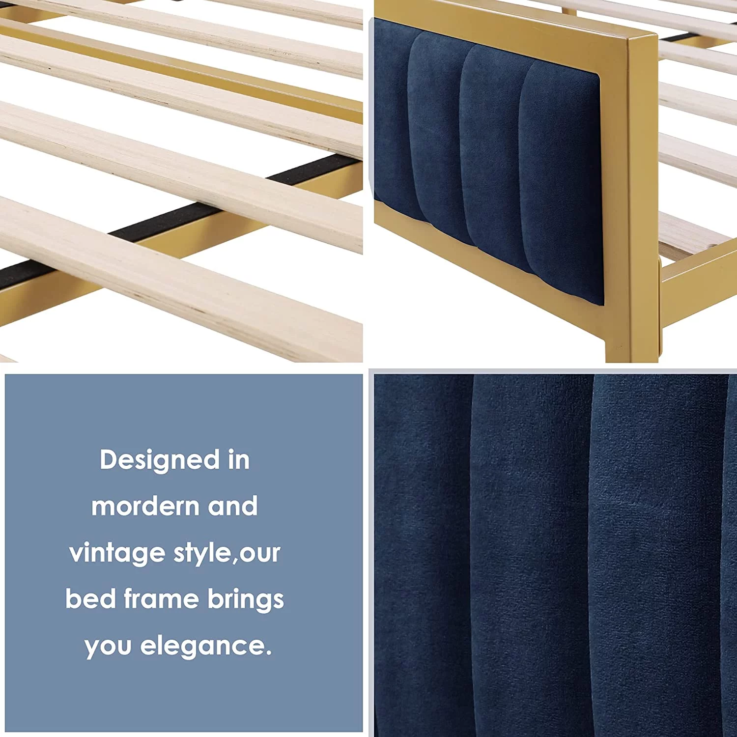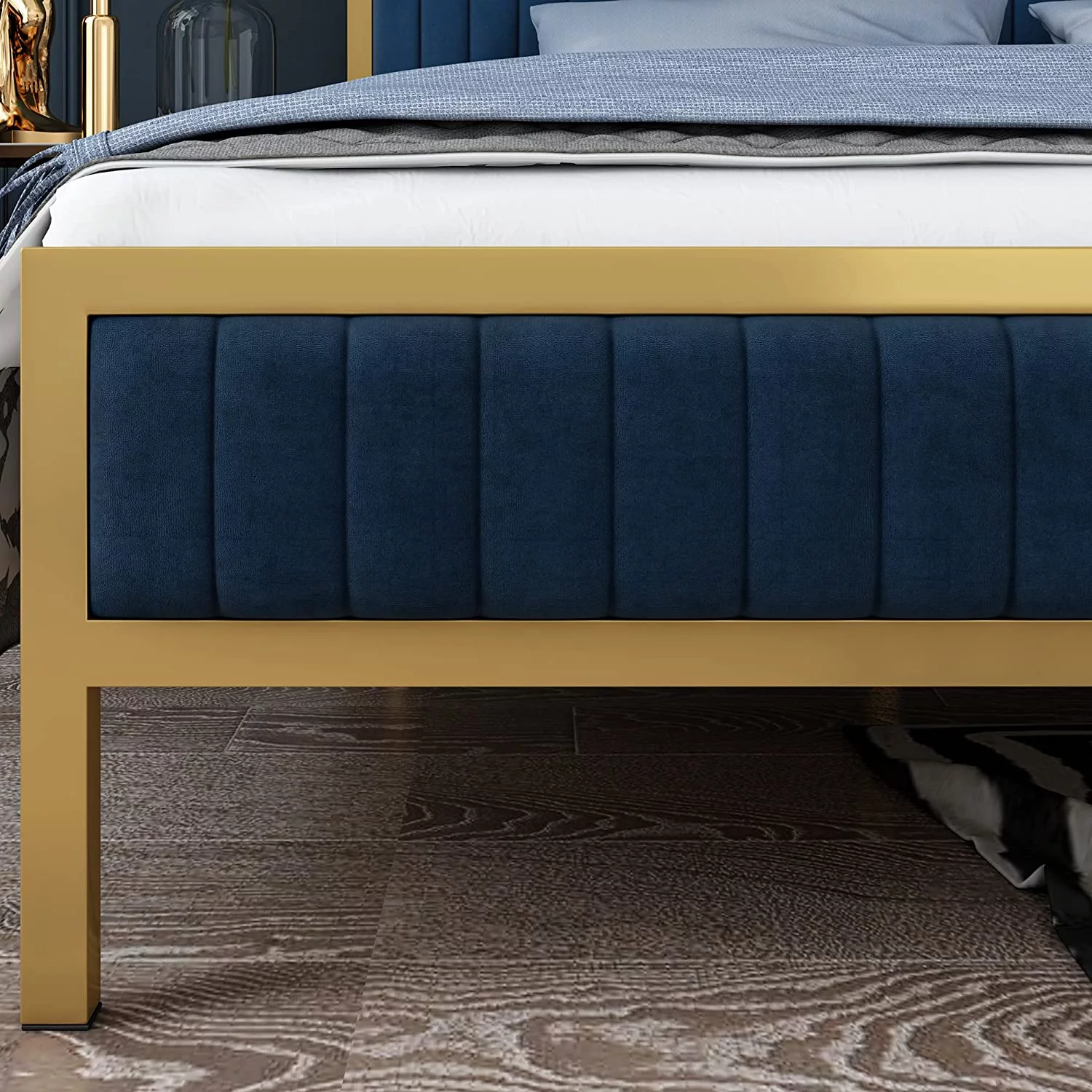 Homfa King Size Metal Bed Frame, Upholstered Platform Bed Frame with Velvet Tufted Headboard, Gold & Blue