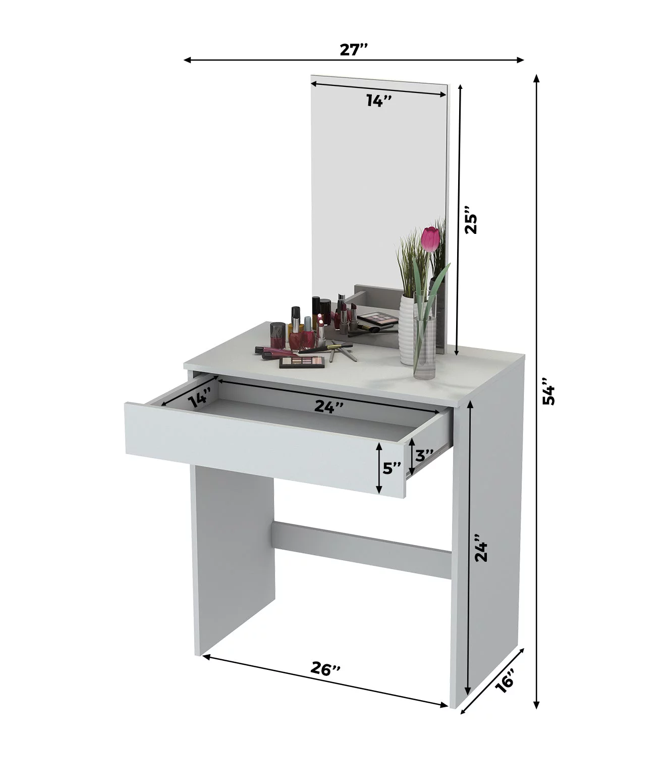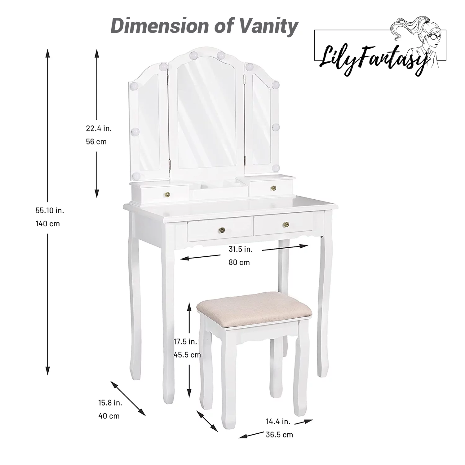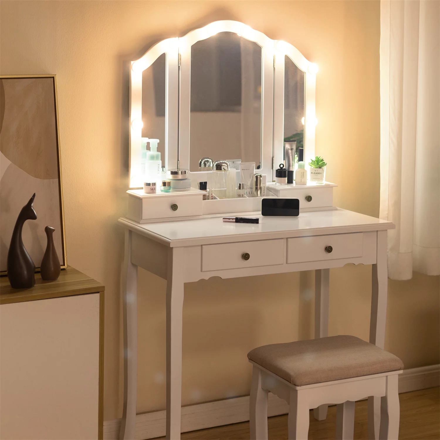 Ember Interiors Melody, Modern White Painted Vanity Table, Lights, for Bedroom