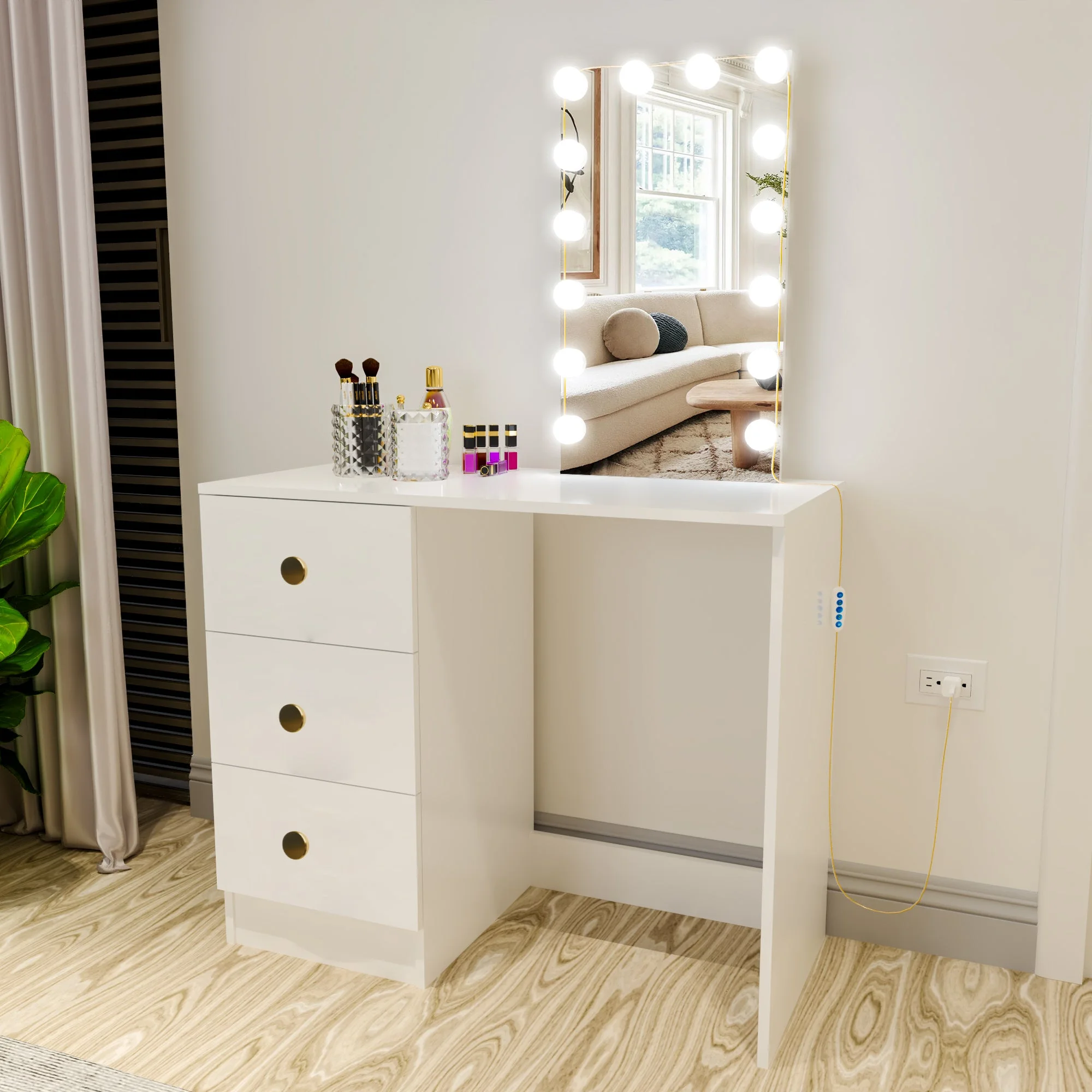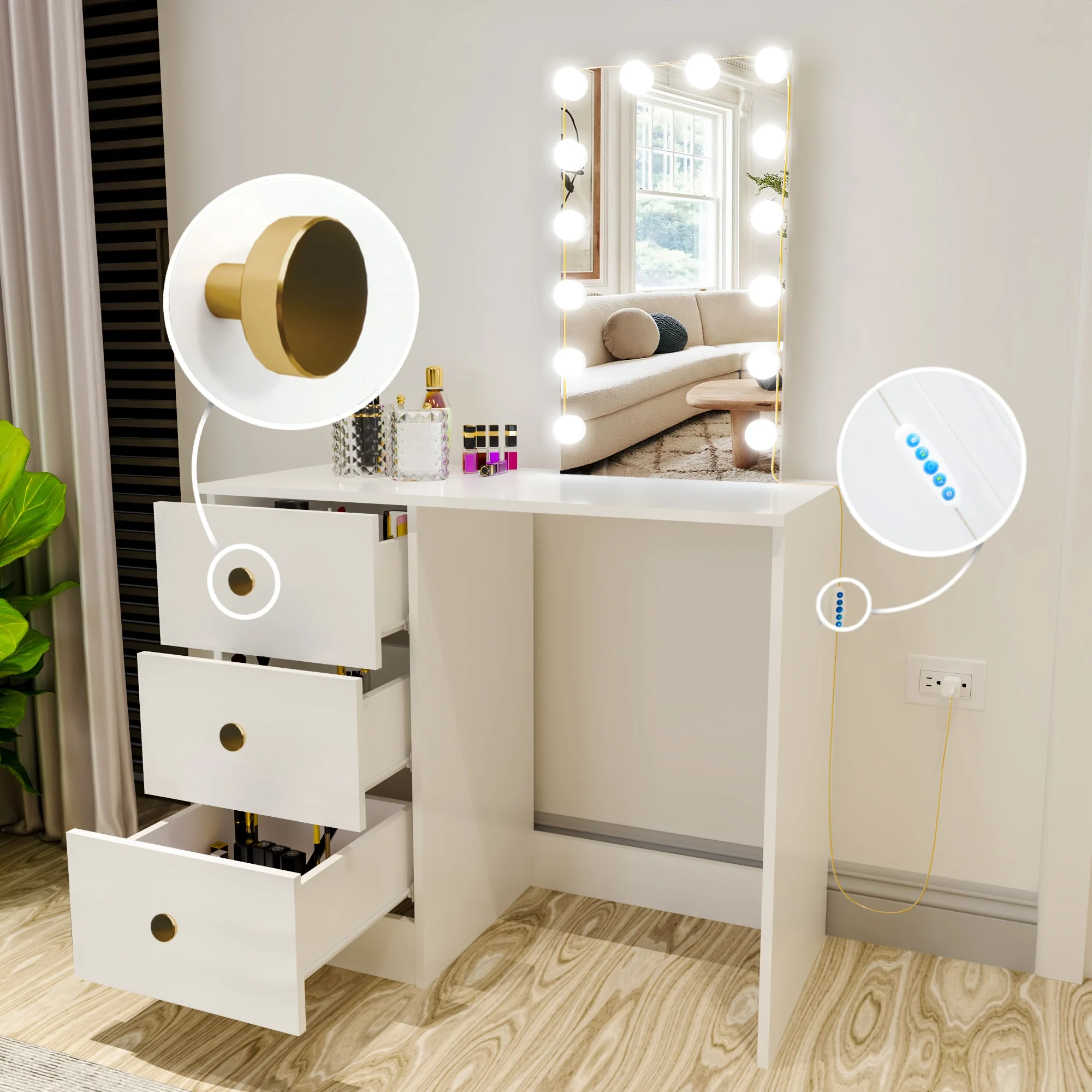 Ember Interiors Ava Modern Vanity Table with Lights, Golden Knobs, for Bedroom, White