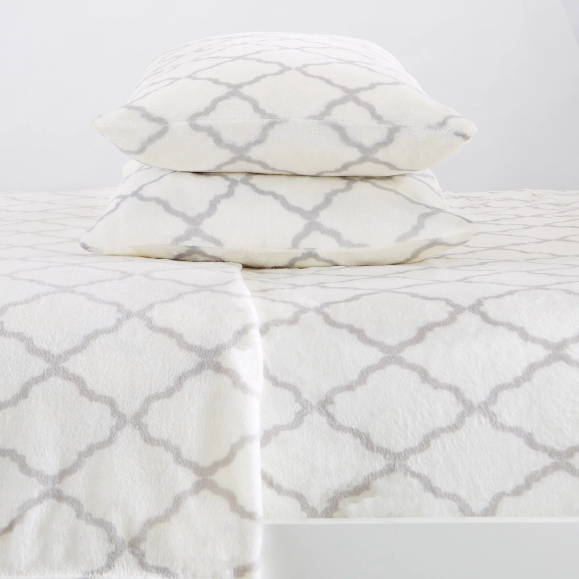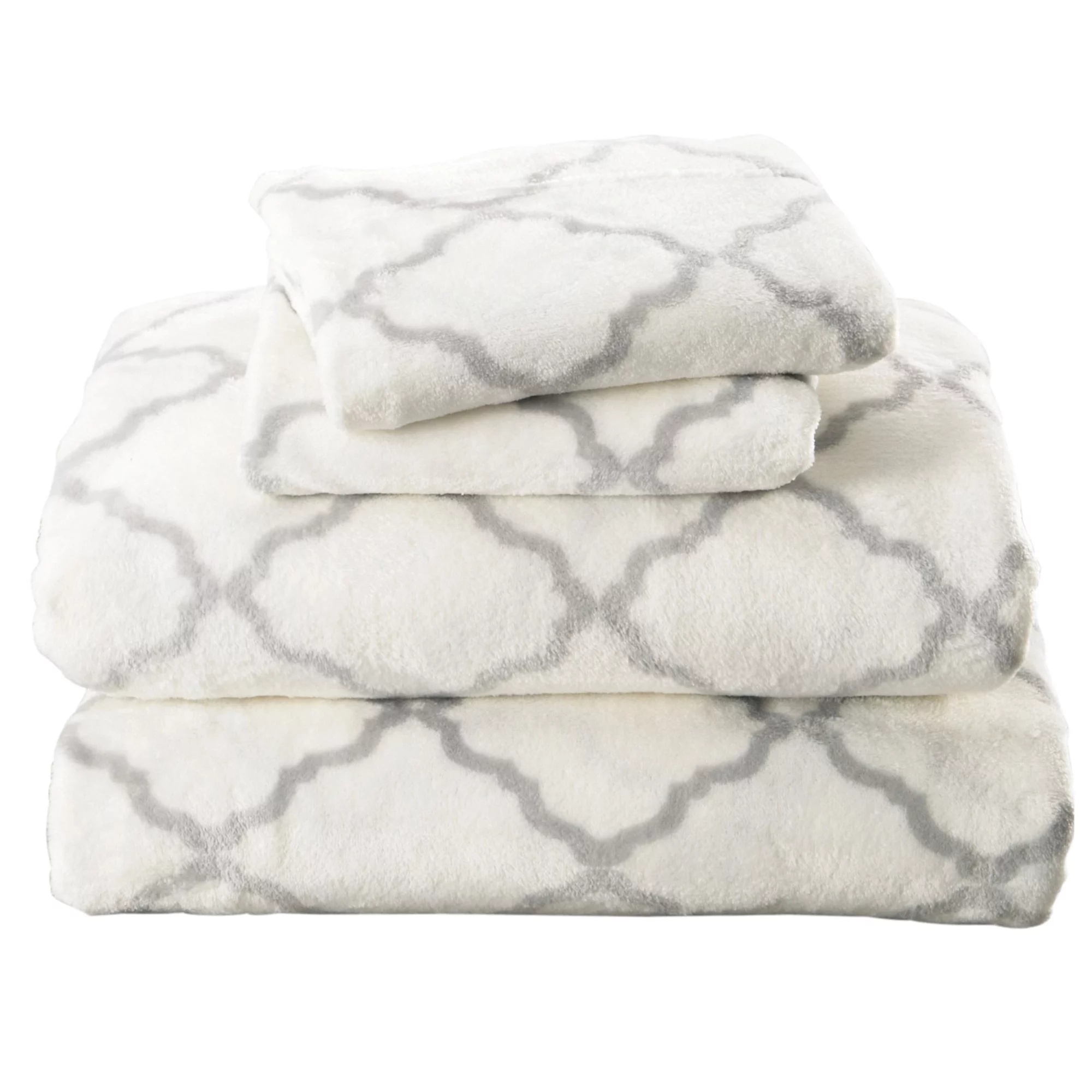 Great Bay Home Printed Velvet Plush Warm and Cozy Fleece Sheet Set (California King, Lattice - White / Grey)