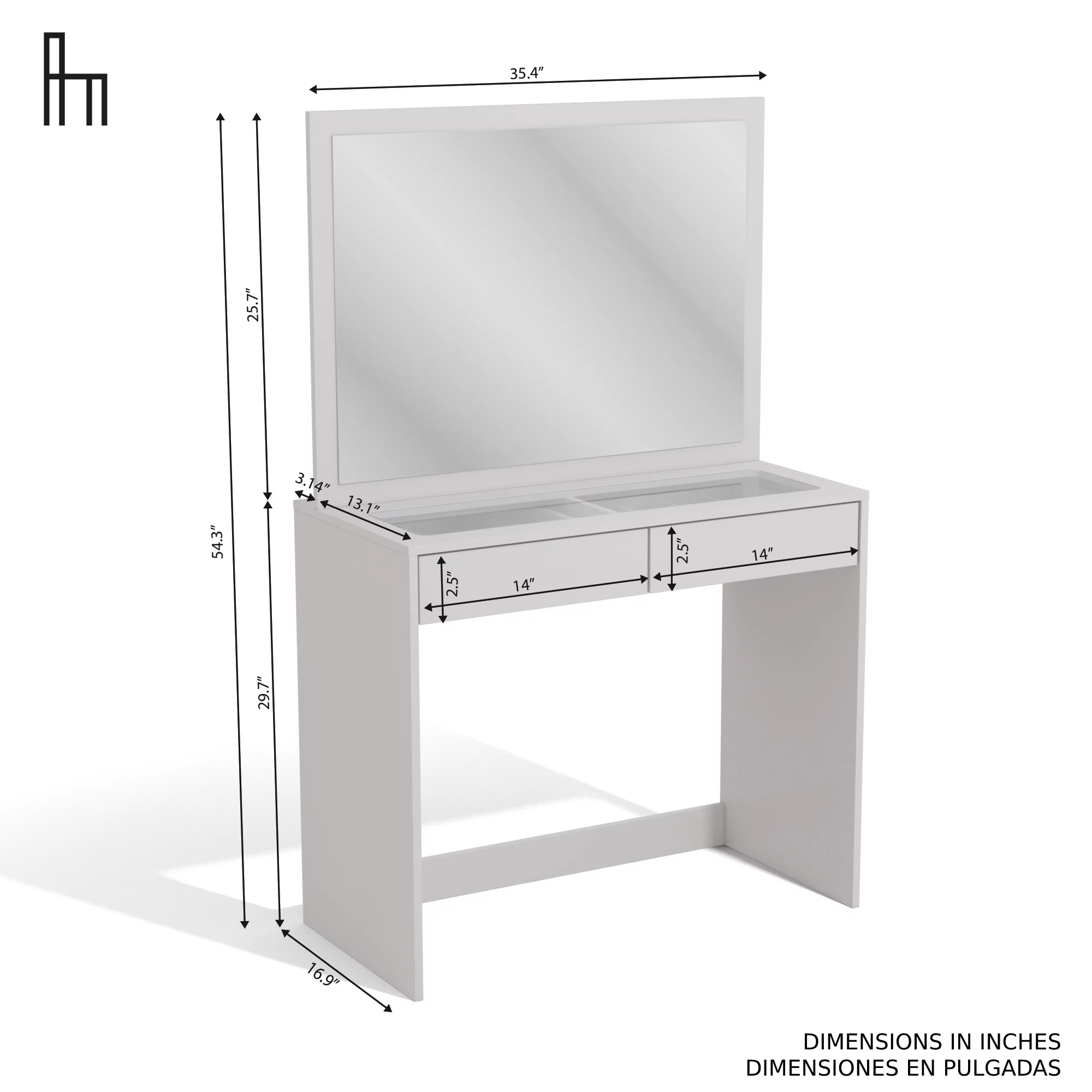 Ember Interiors Ava Modern Vanity Table with Lights, Crystal Knobs, for Bedroom, White