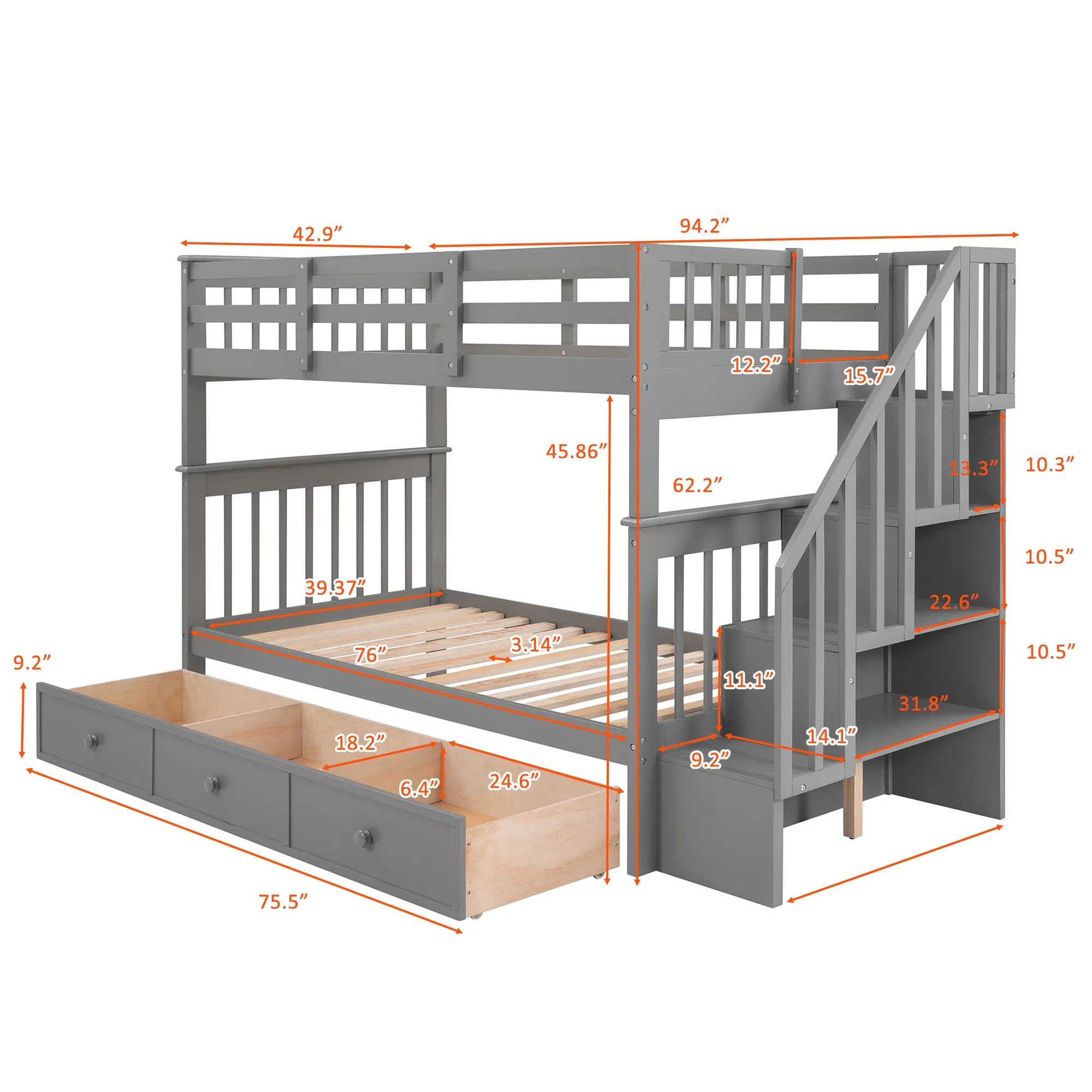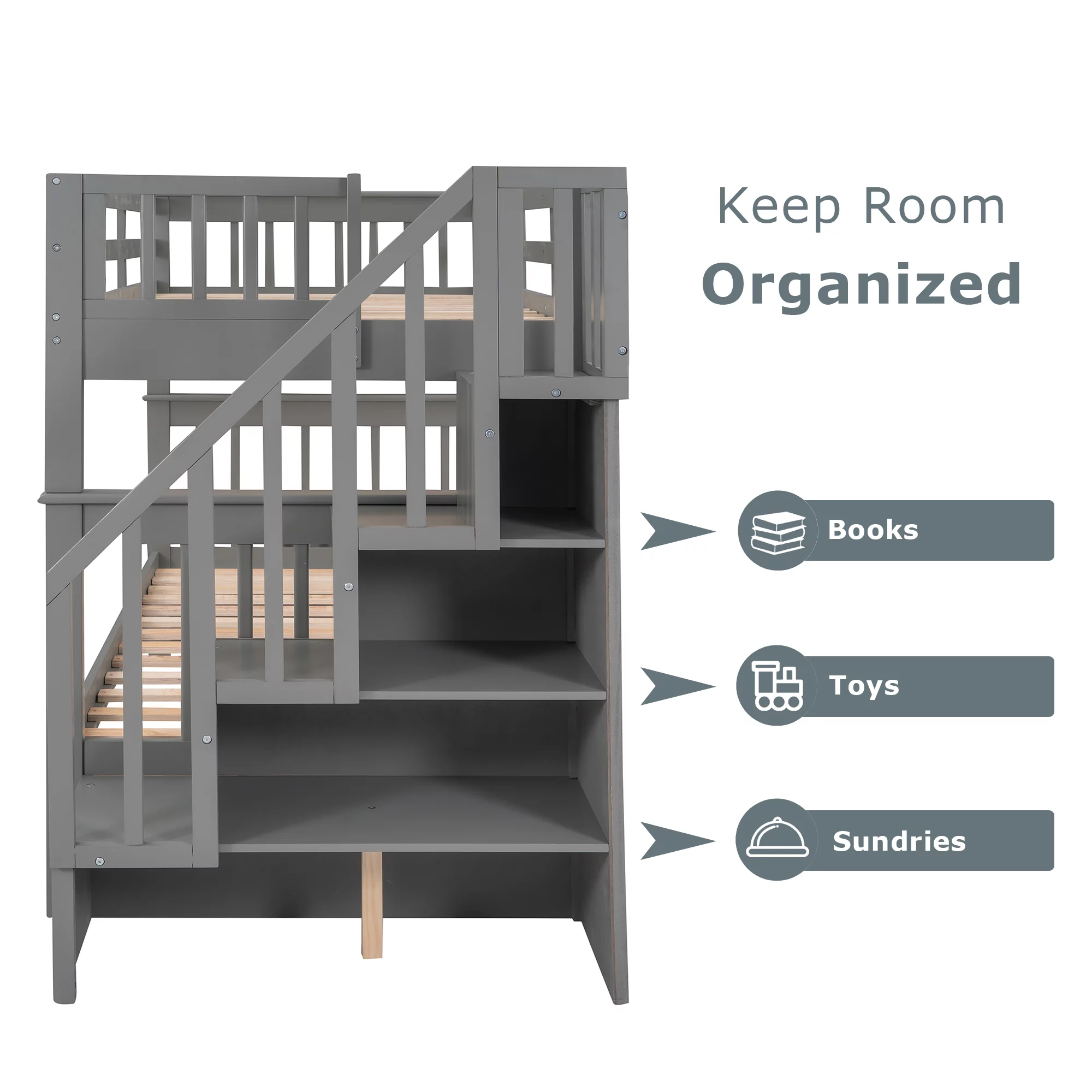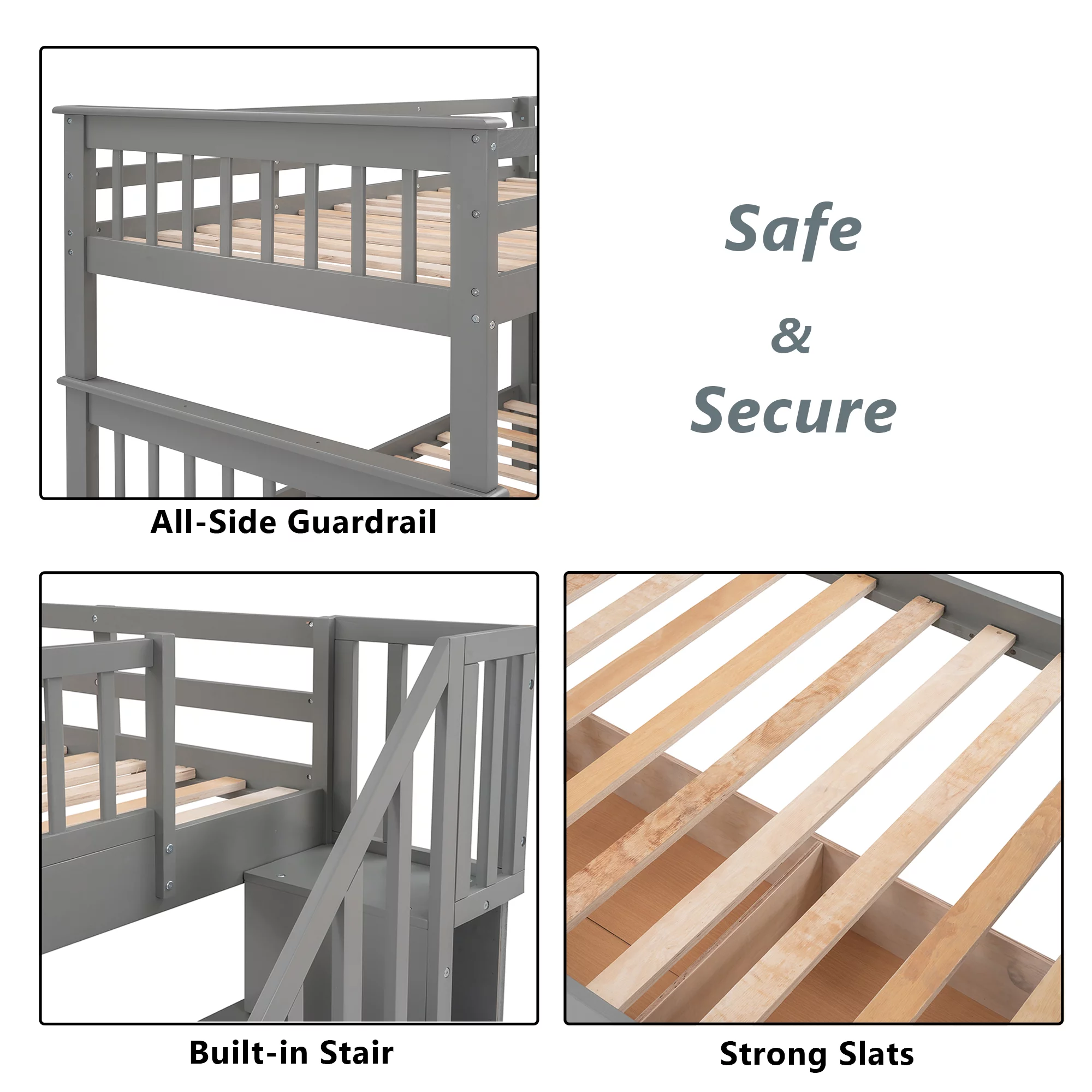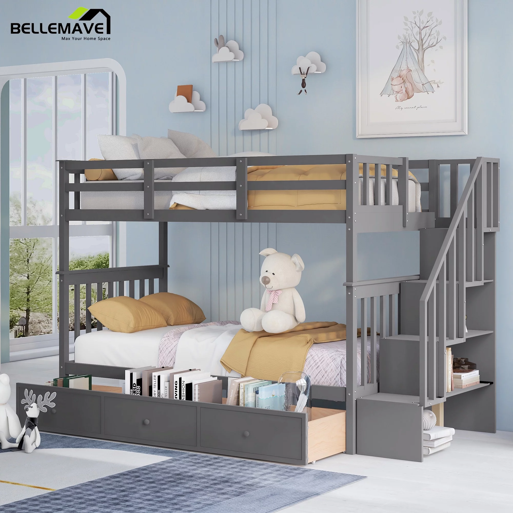 Bellemave Twin over Twin Bunk Bed with Stairs, Solid Wood Bunk Bed with Storage Drawers for Kids, Teens, Adults (Gray)
