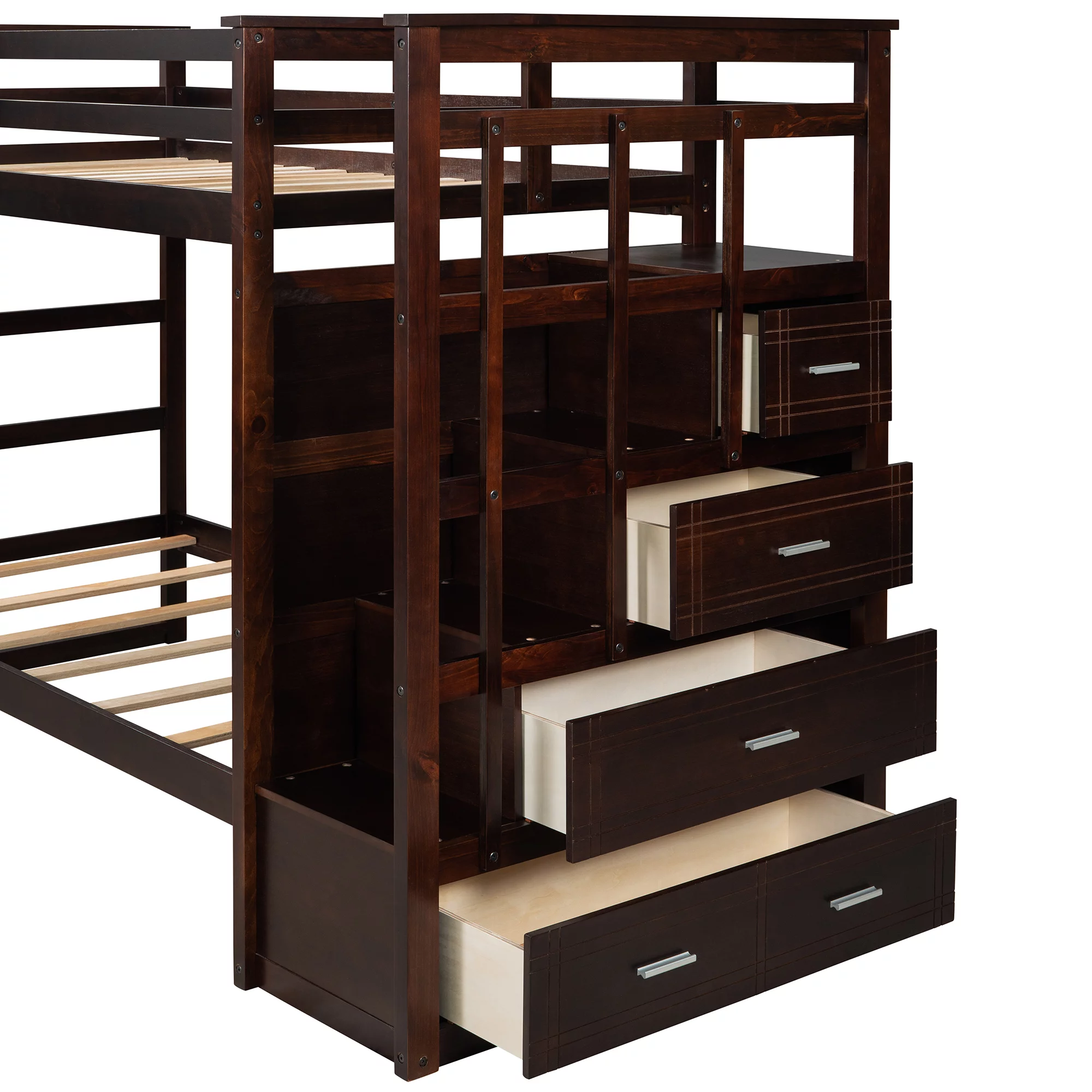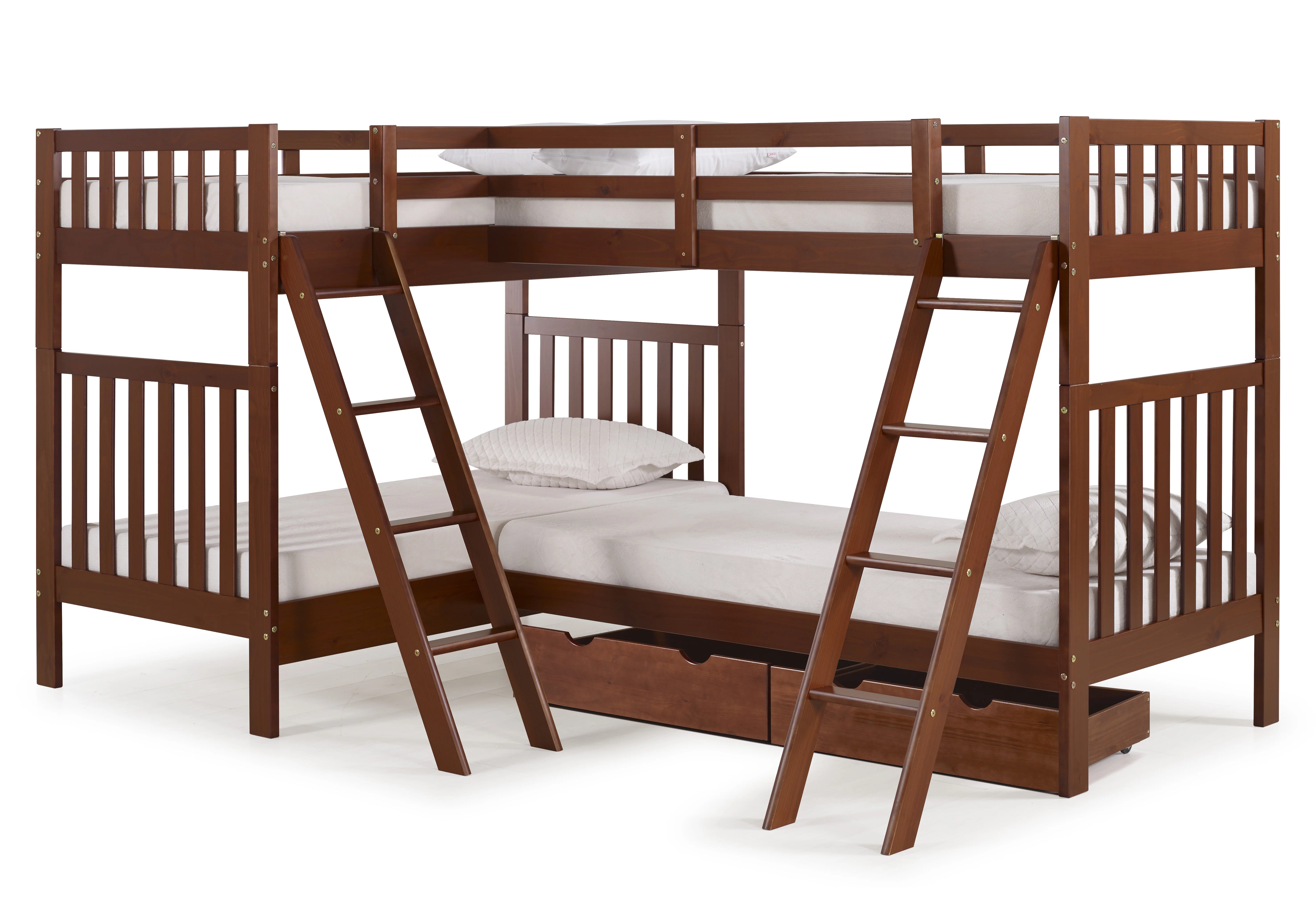 Aurora Twin Over Twin Bunk Bed with Quad Bunk Extension and Storage Drawers, Chestnut