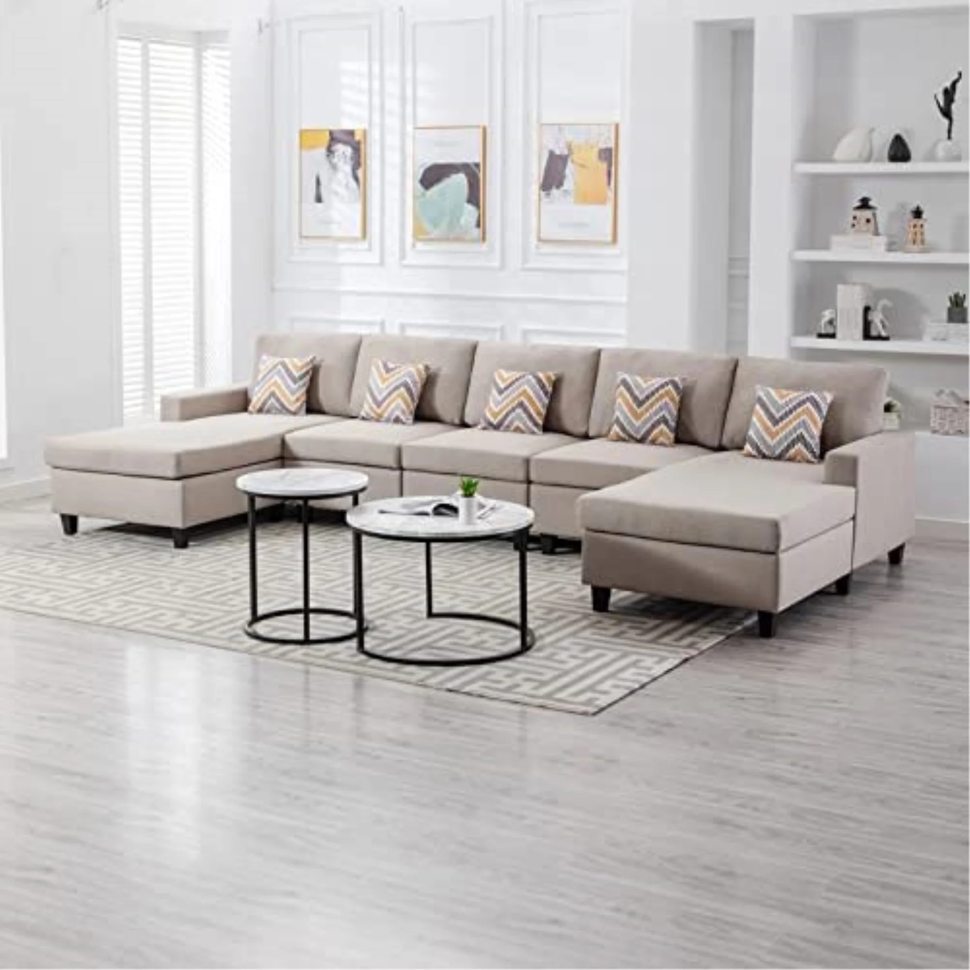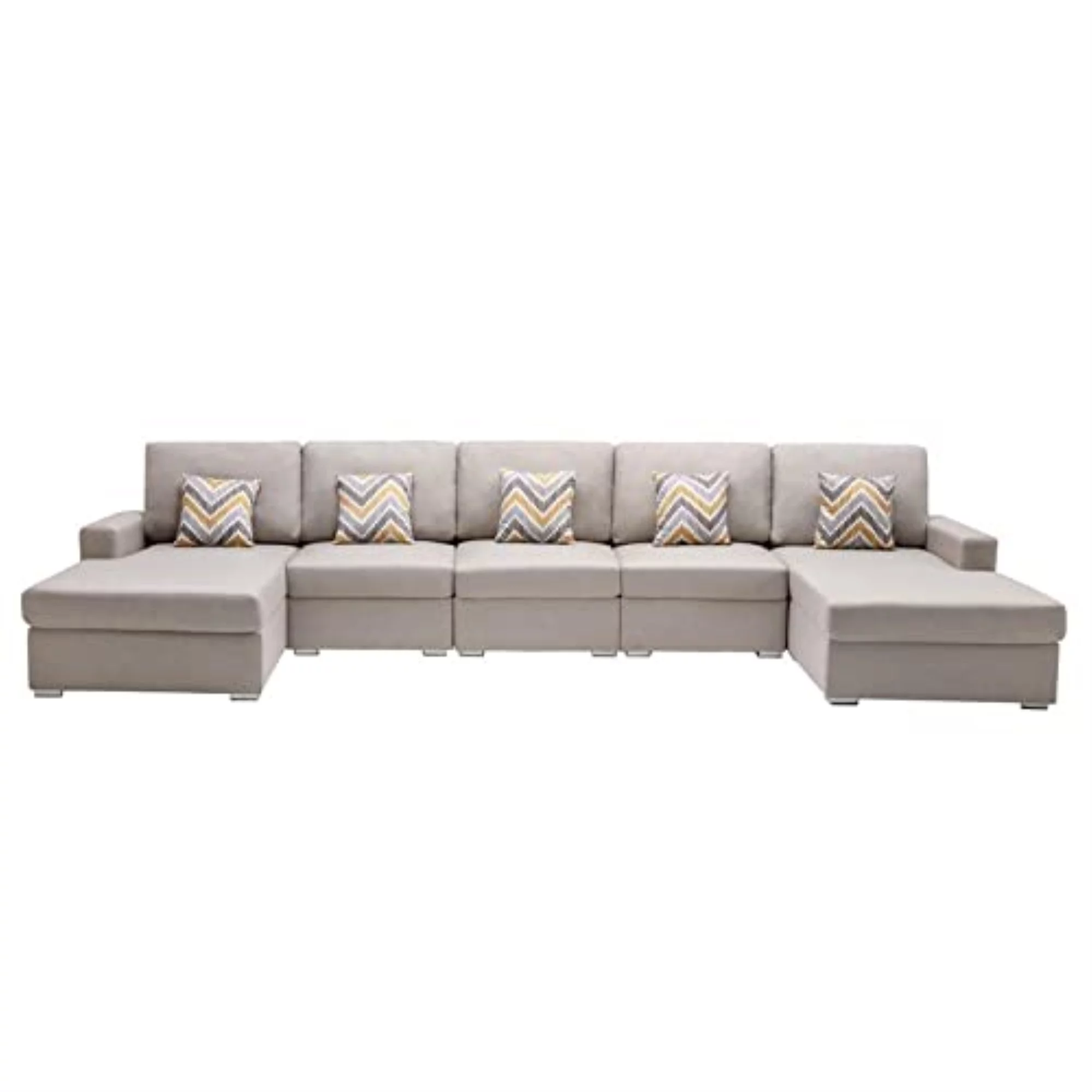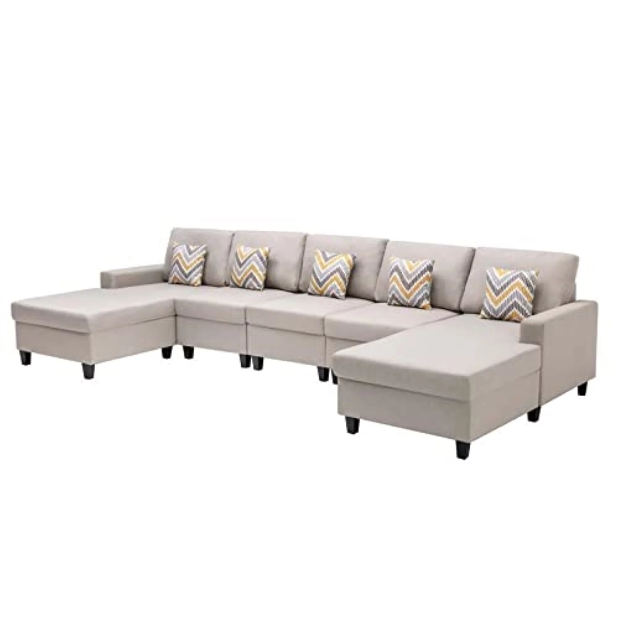 Lilola Home Nolan Linen Fabric 5Pc Double Chaise Sectional Sofa with Pillows and Interchangeable Legs-Color:Beige
