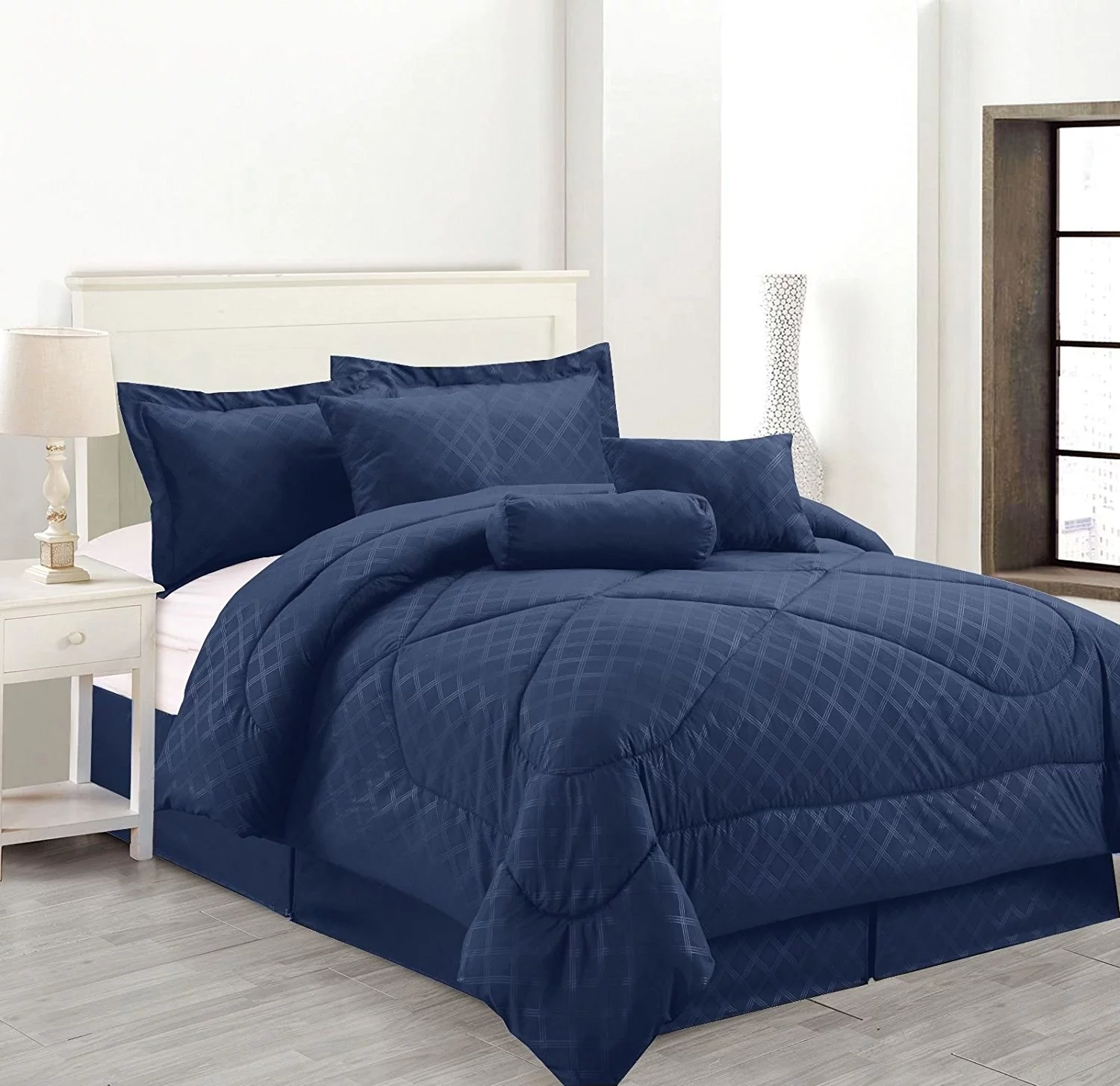 Luxury Hotel Queen Size 8-Piece Embossed Solid Over-Sized Comforter Set Bed in A Bag Navy Blue