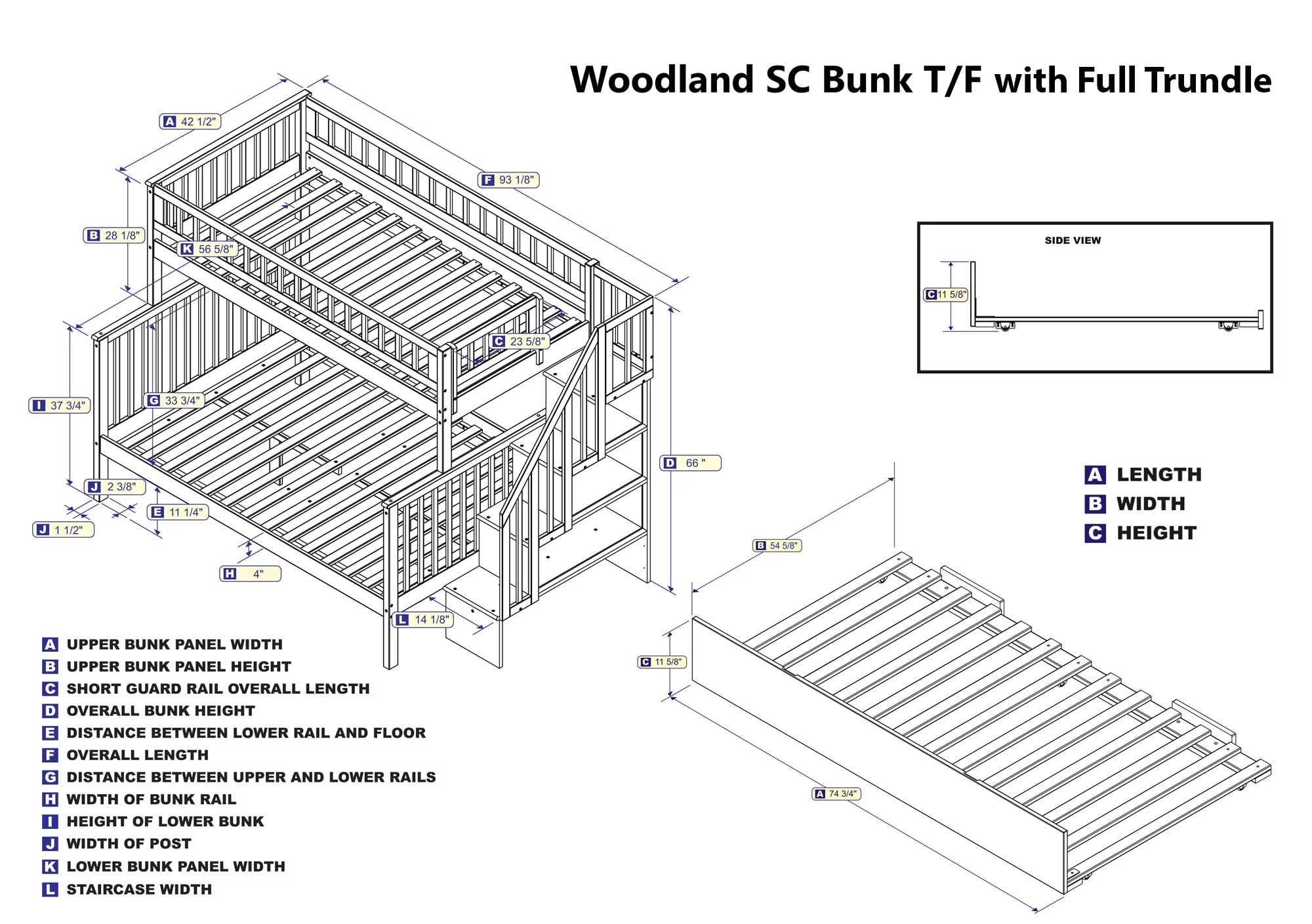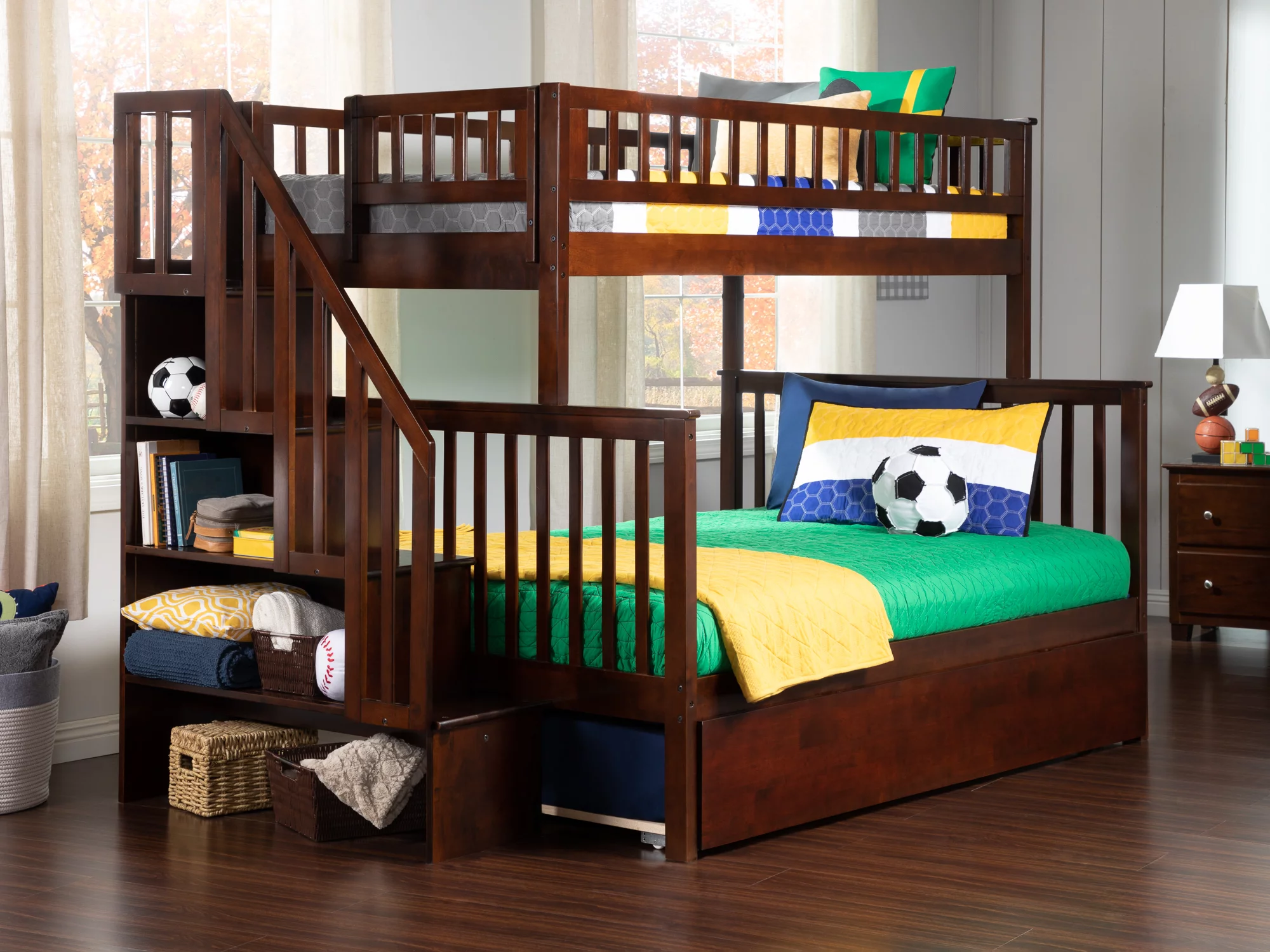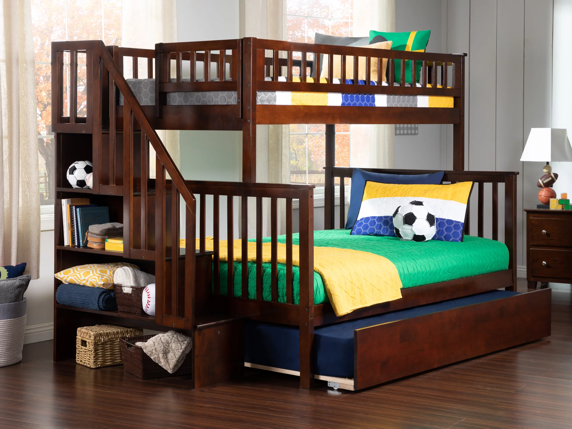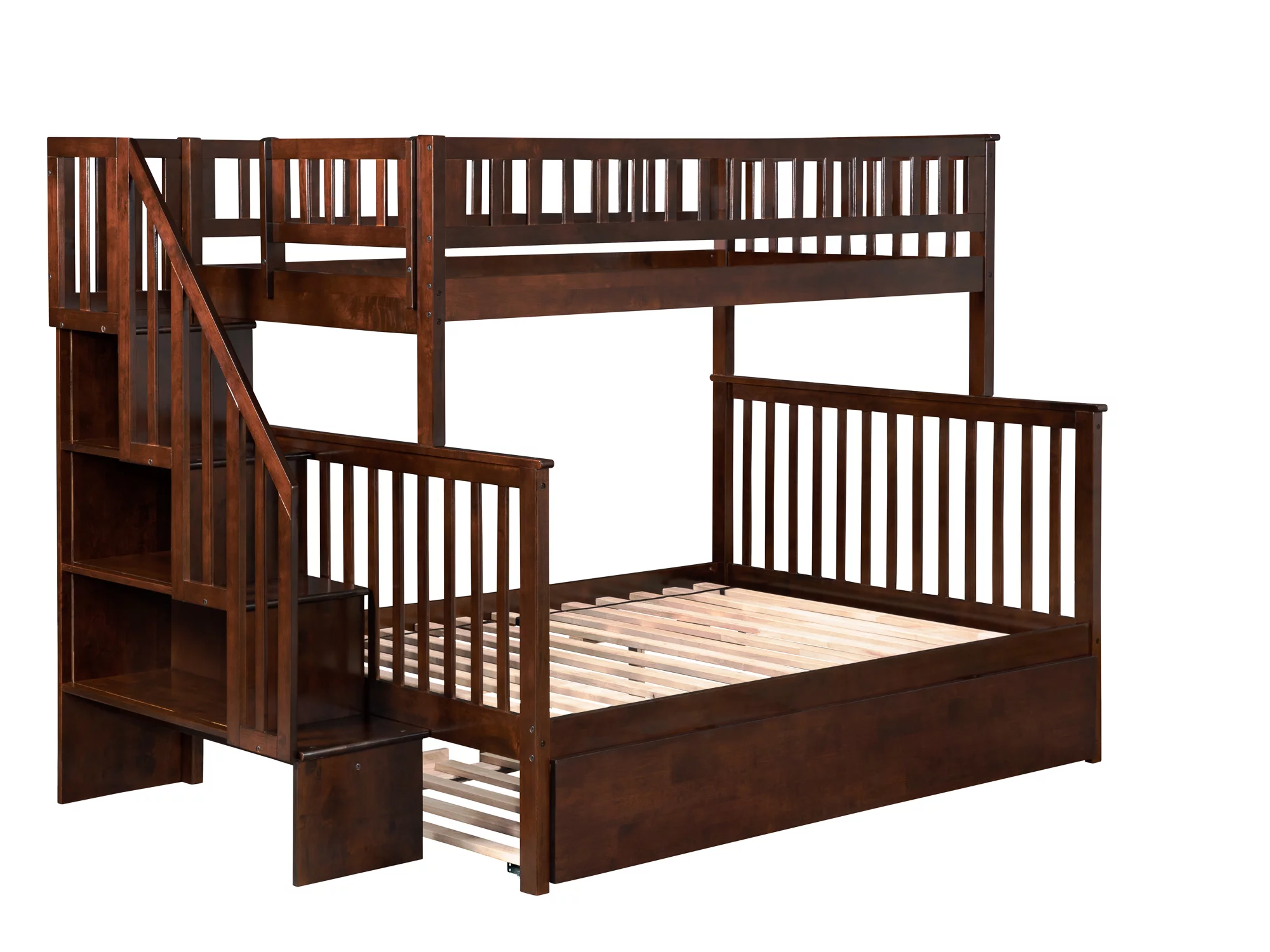 Woodland Staircase Bunk Bed Twin over Full with Full Size Urban Trundle Bed in Walnut