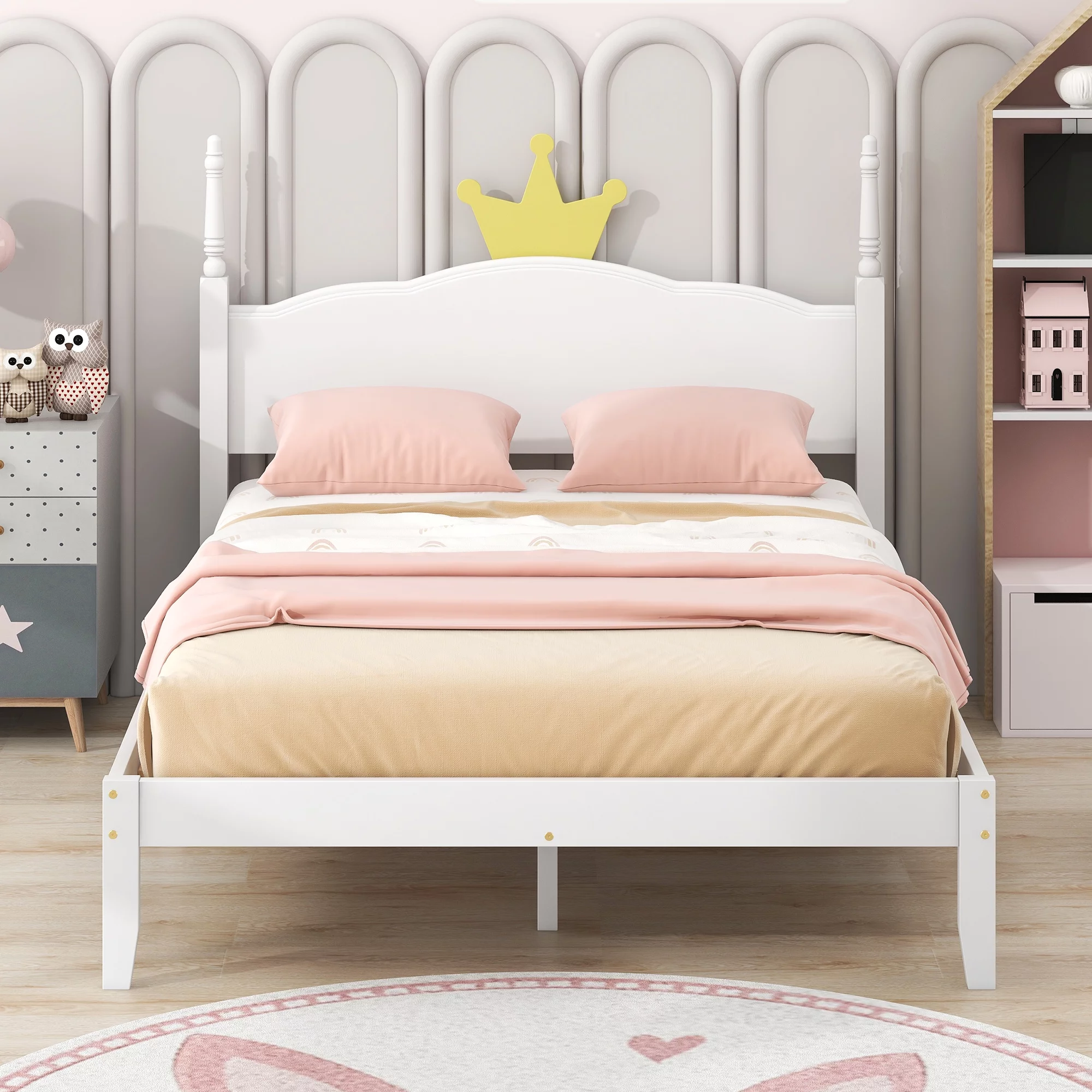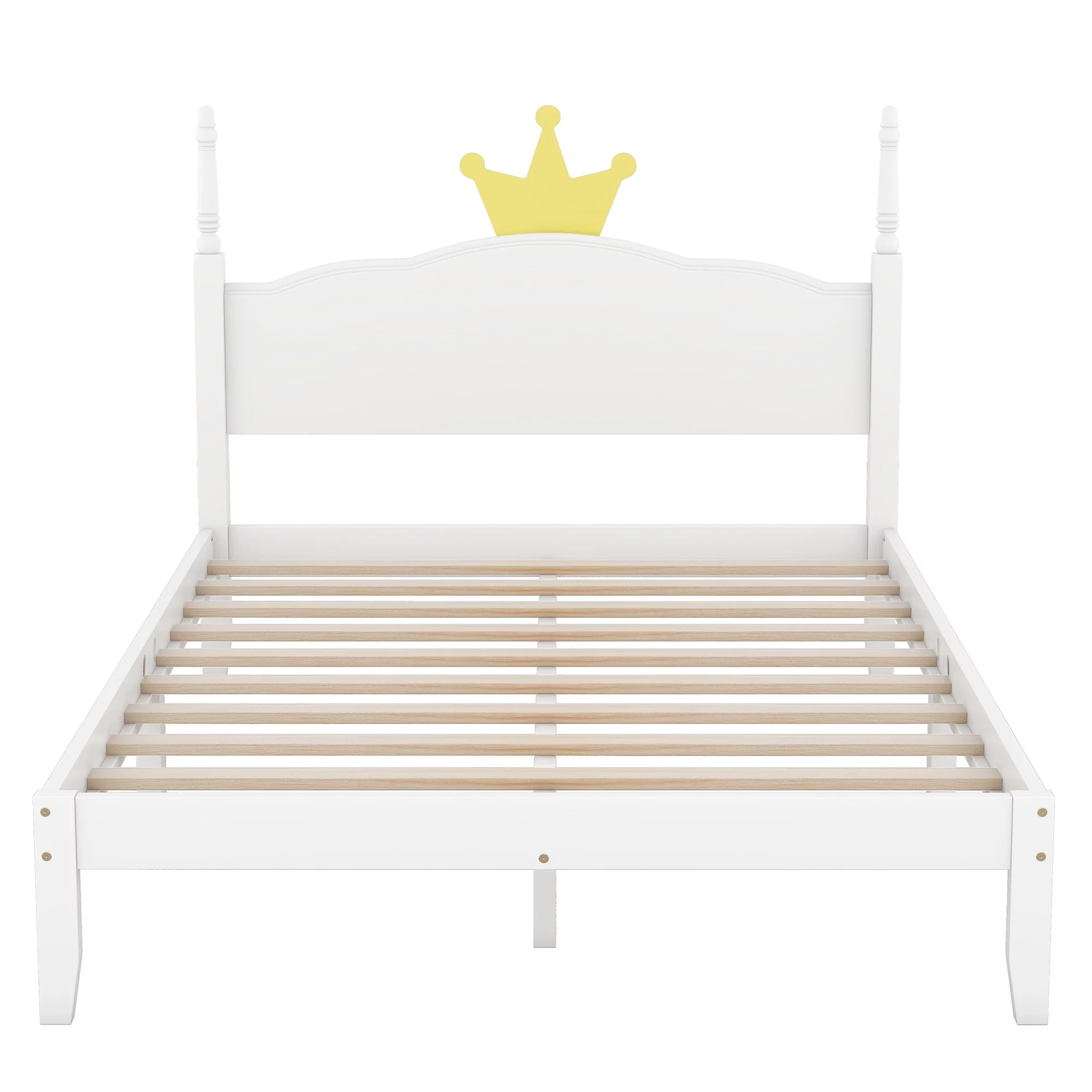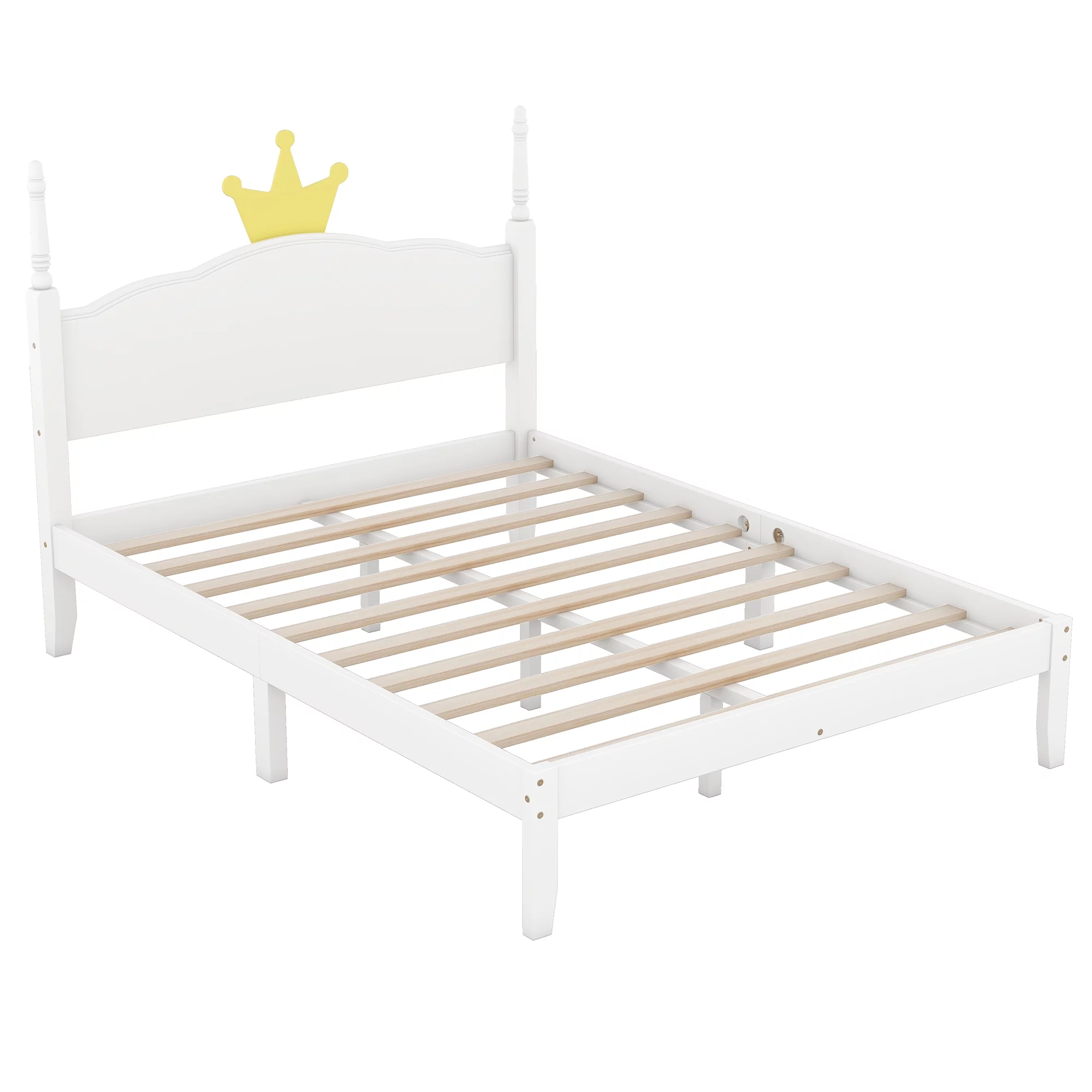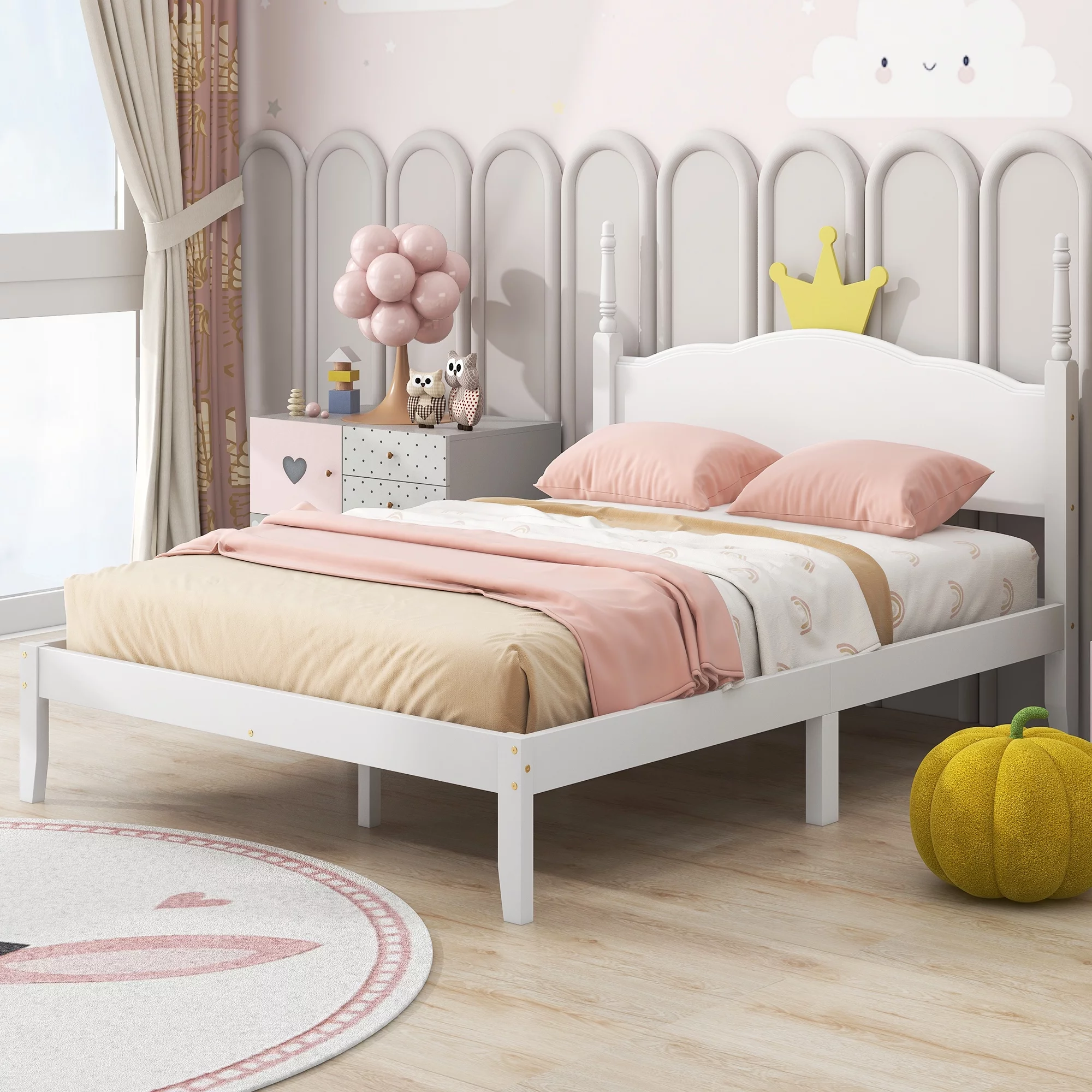 Euroco Wood Full Size Platform Bed, Bed with Crown for Kids Teens Adults, White