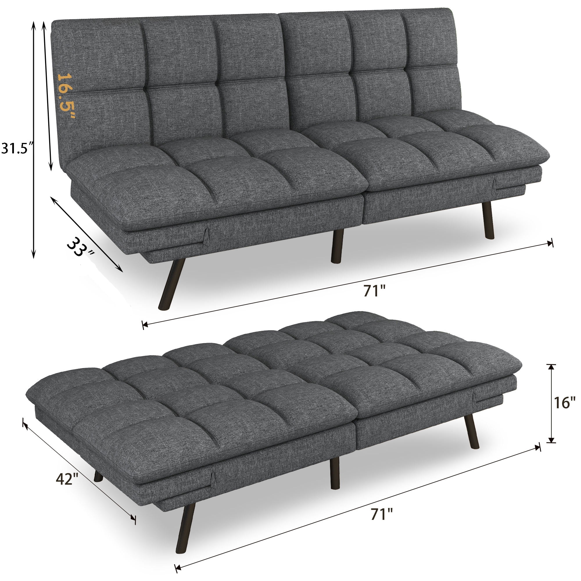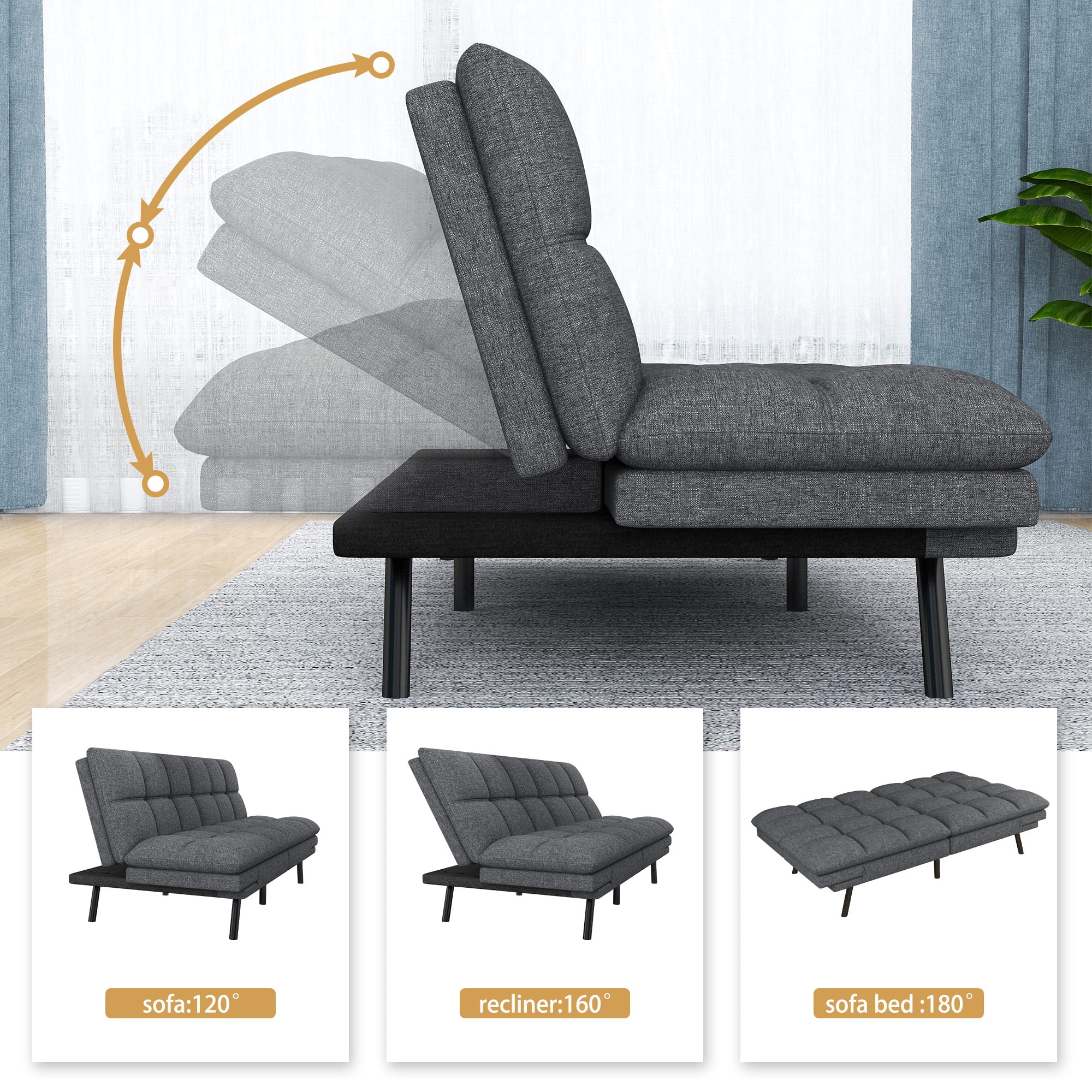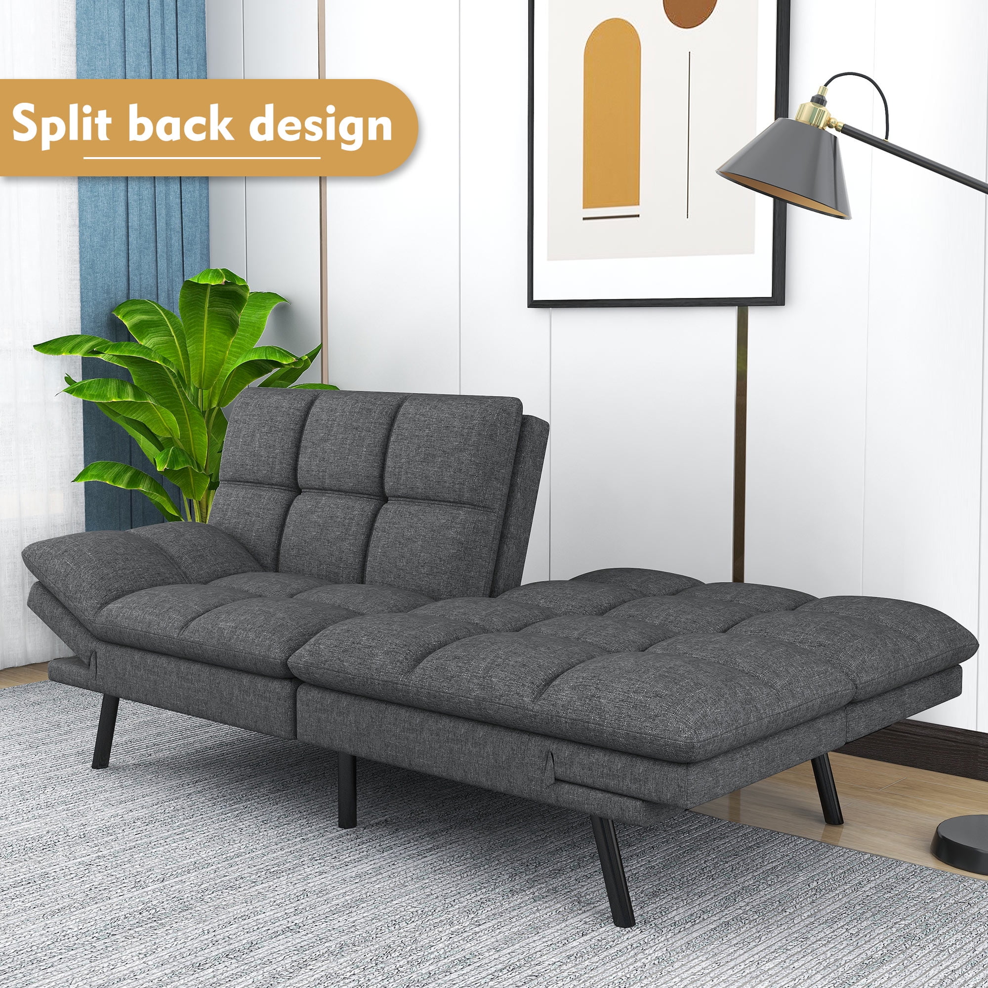 Futon Sofa Bed, Modern Convertible Memory Foam Sleeper Sofa, Adjustable Armrest&Backrest, Grey