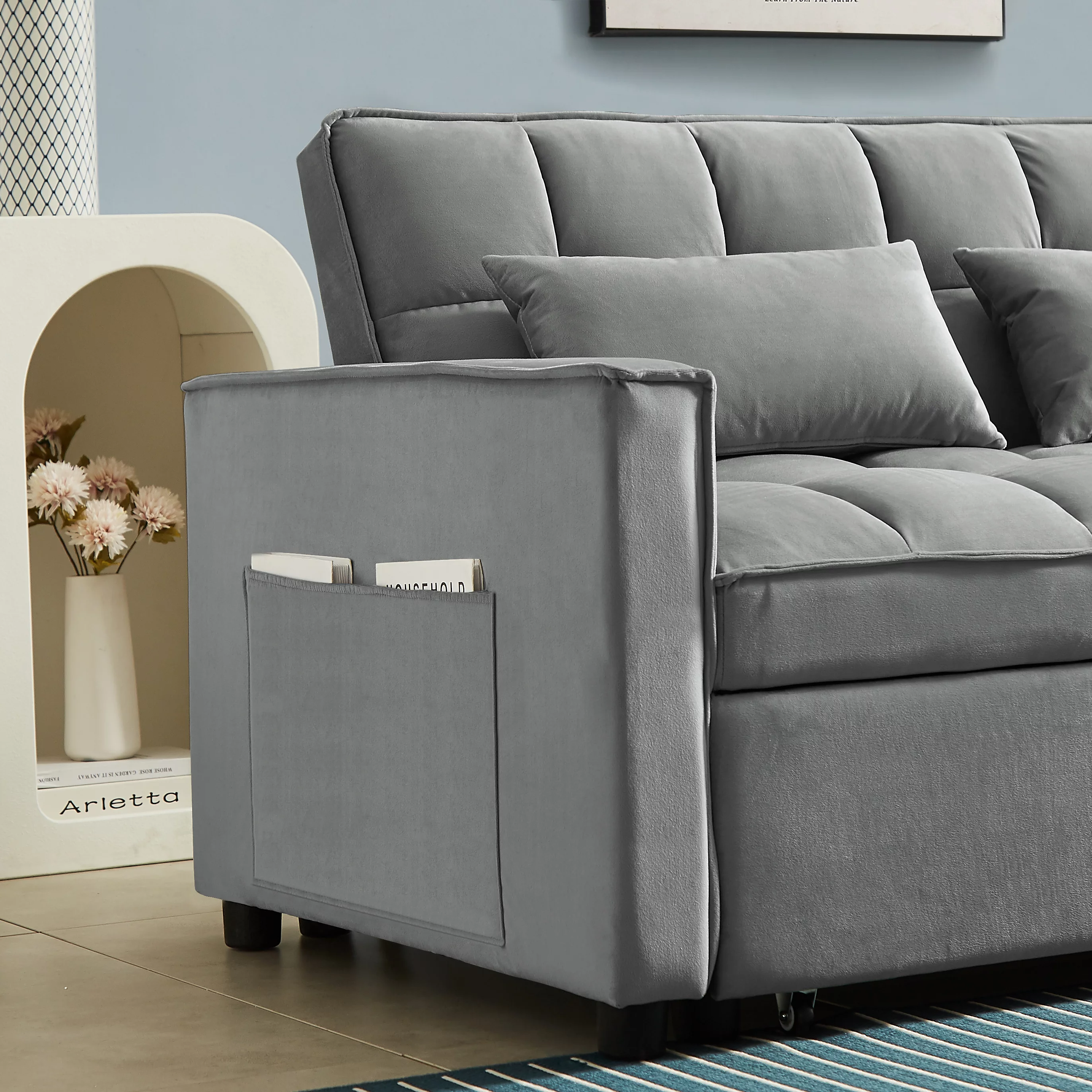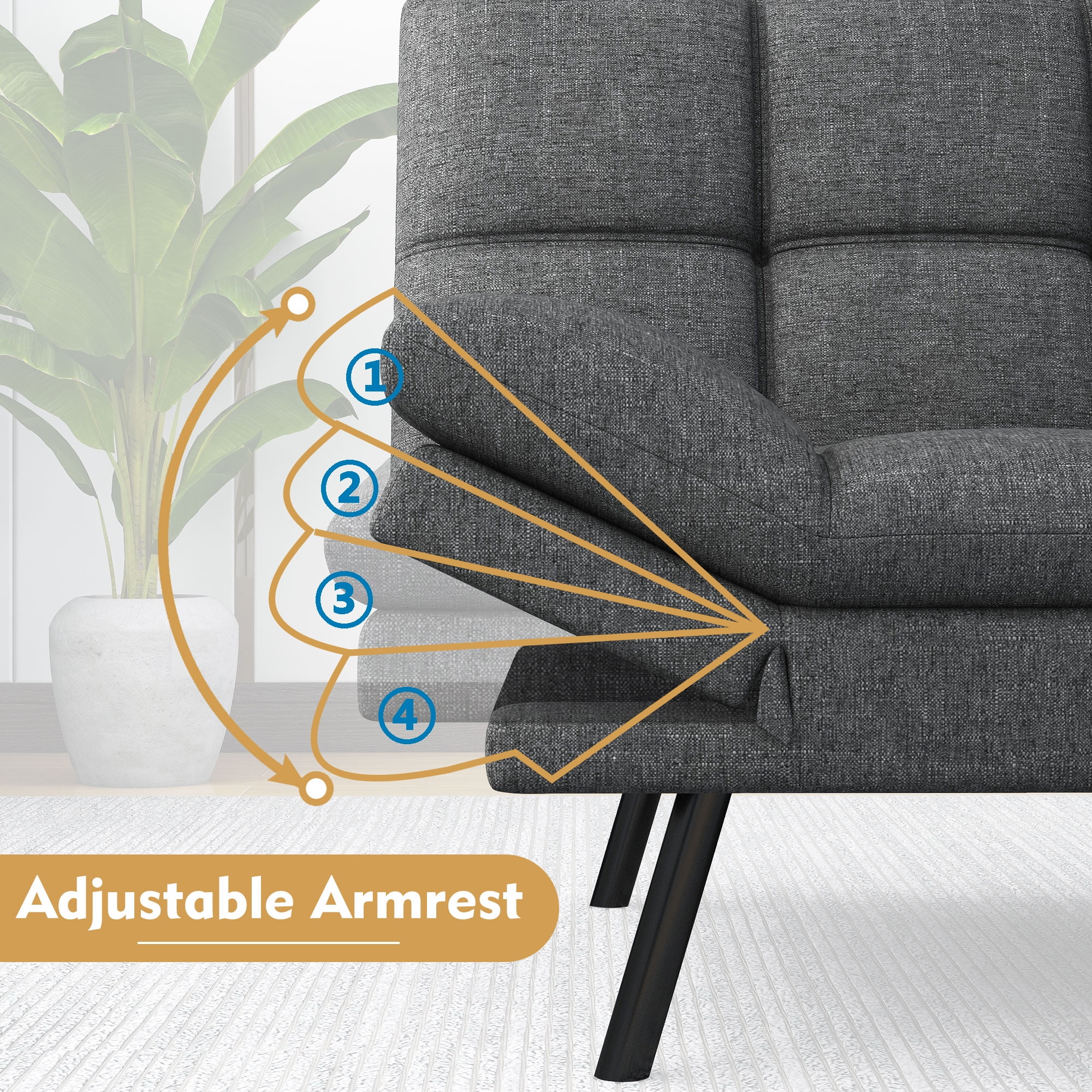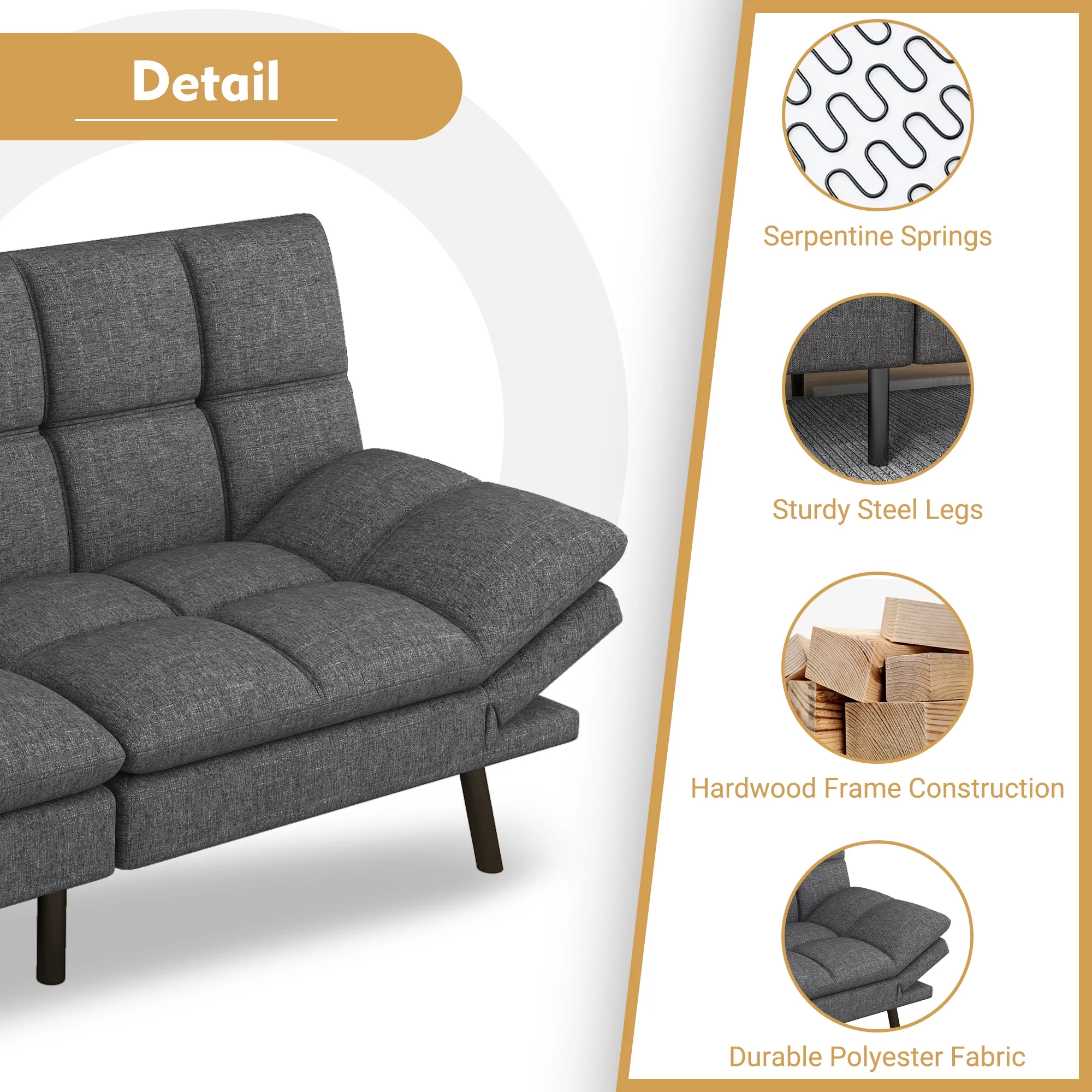 Futon Sofa Bed, Modern Convertible Memory Foam Sleeper Sofa, Adjustable Armrest&Backrest, Grey