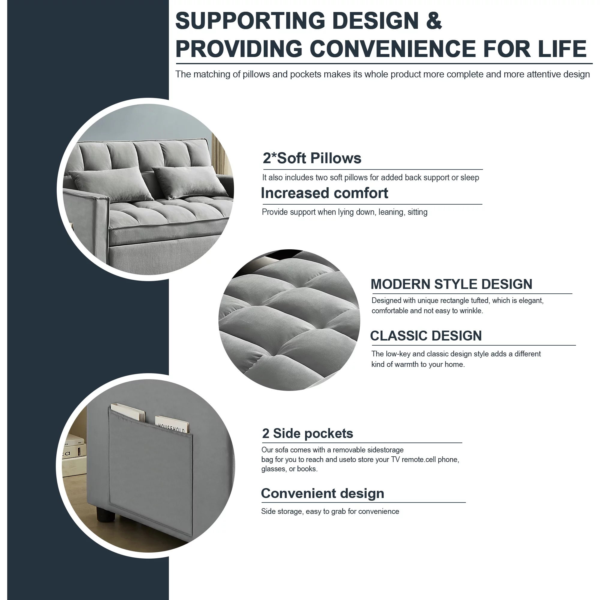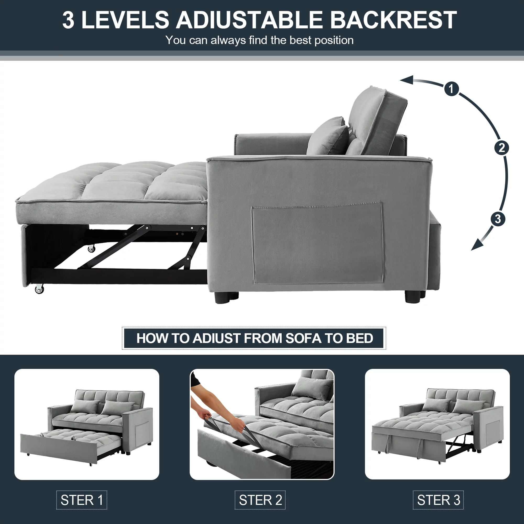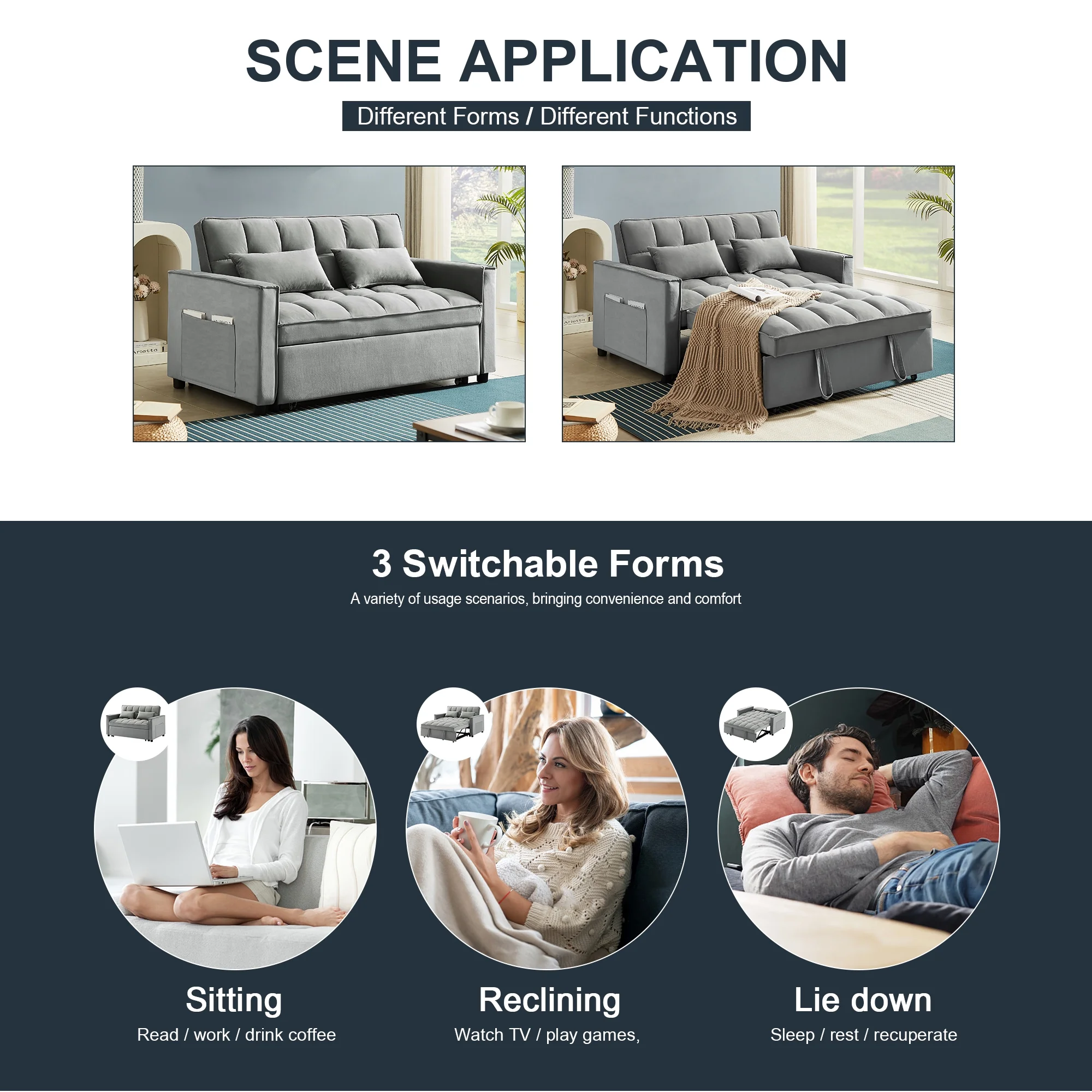 Convertible Sofa Bed, 3 in 1 Sleeper Sofa Couch Bed, 58” Love Seat,Dark Gray