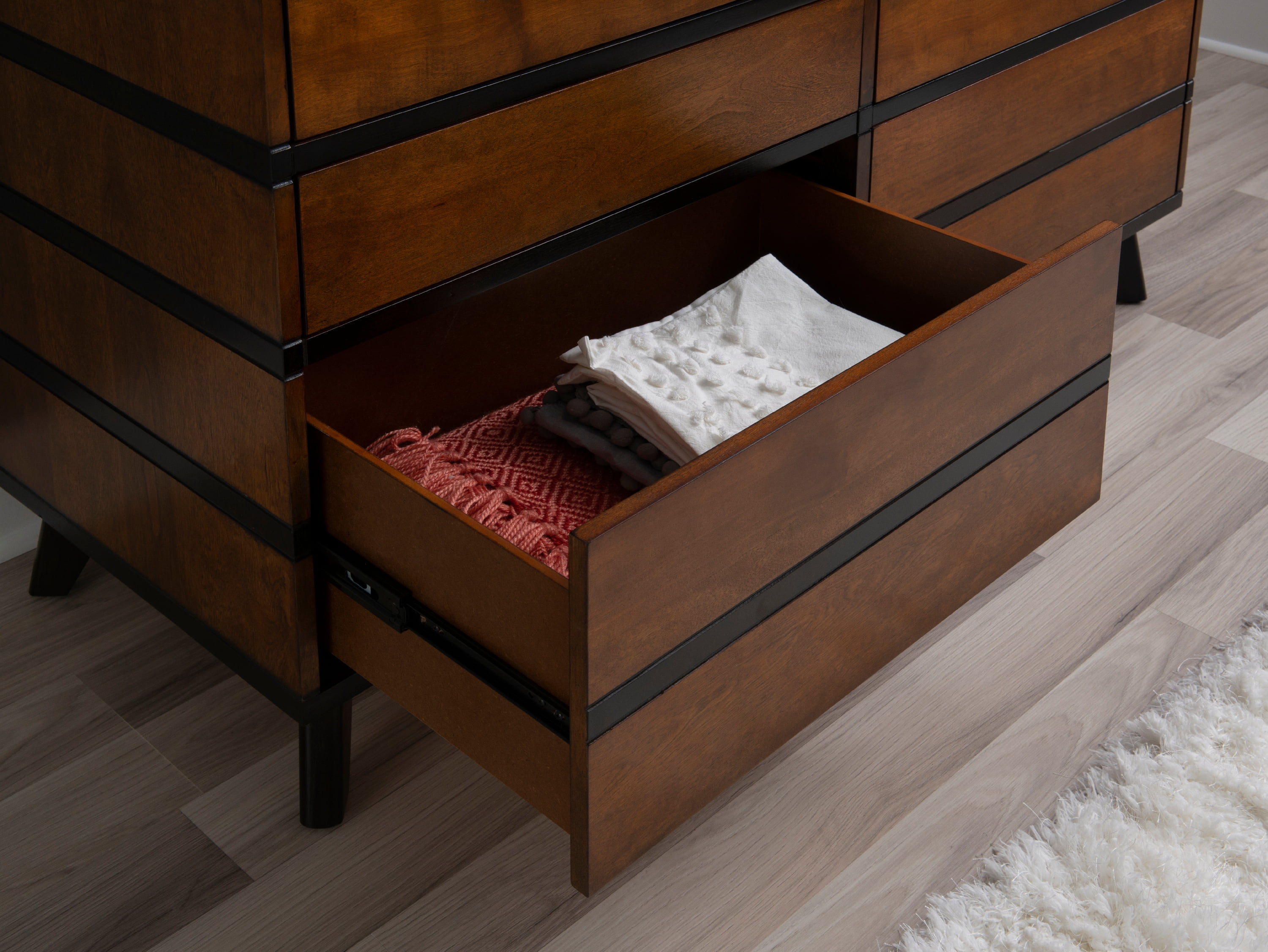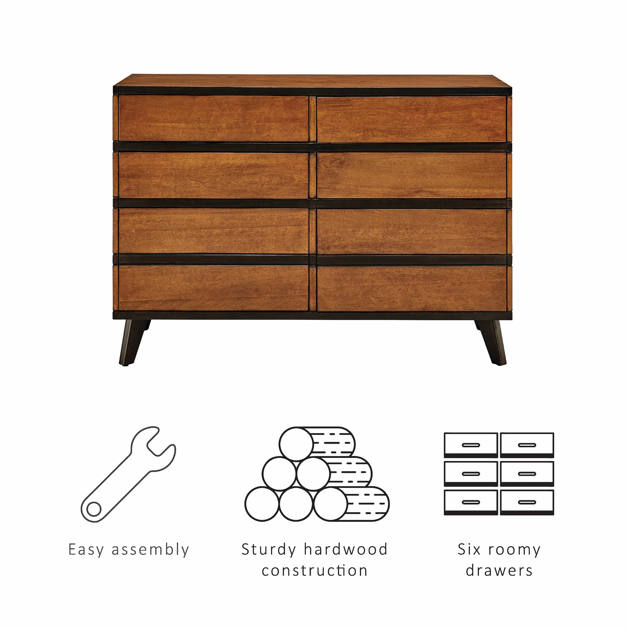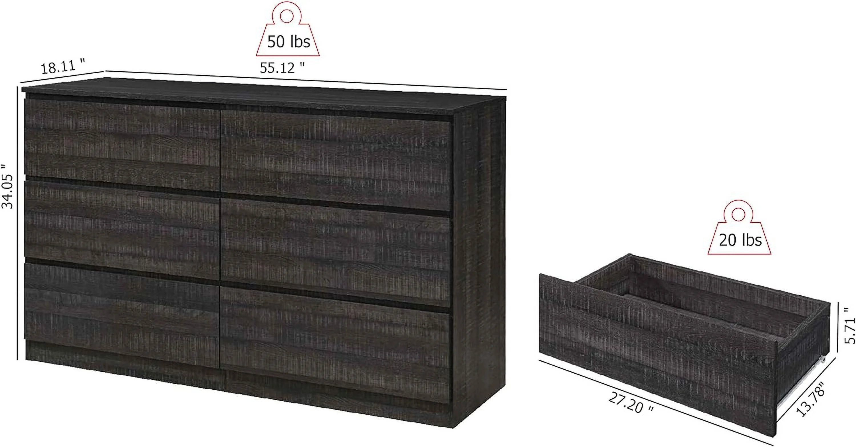 Noe 63 Inch Solid Wood Dresser, 6 Drawers, 1 Shelf, Dark Walnut- Saltoro Sherpi