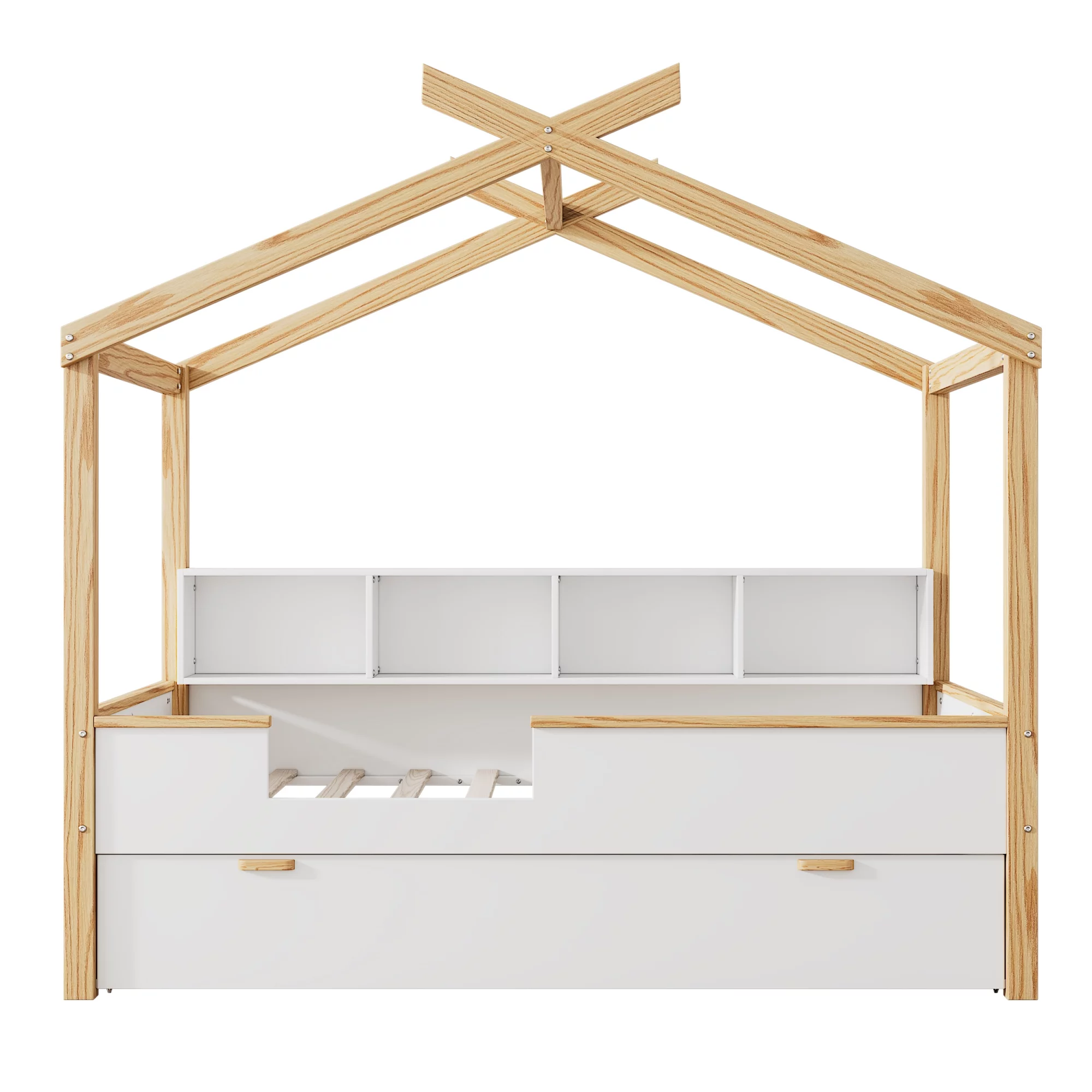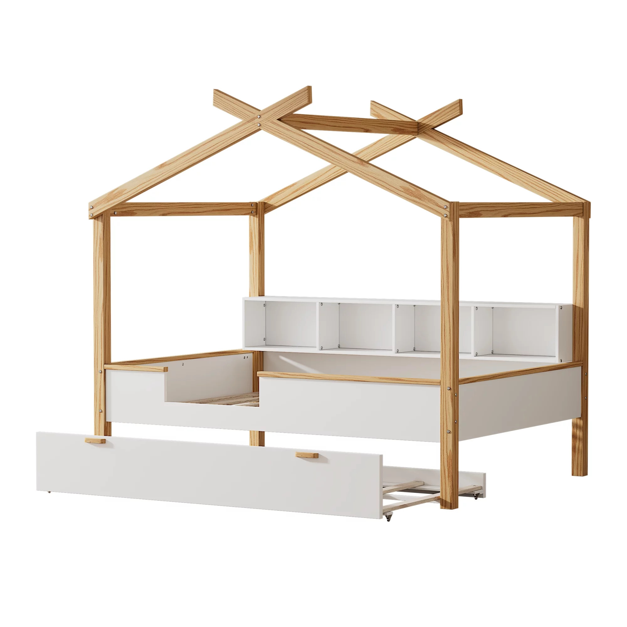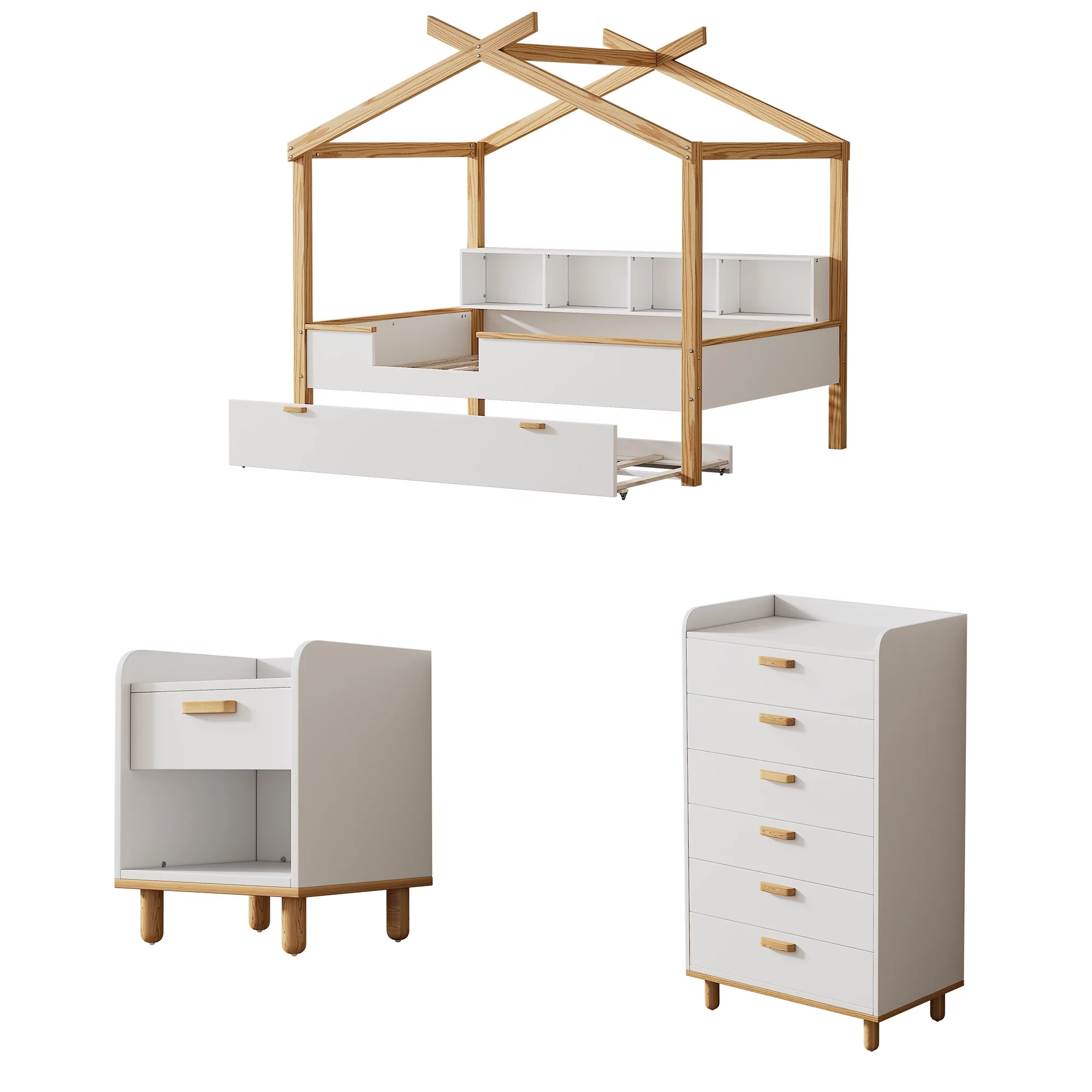3 Pieces Bedroom Sets White Full Size Wooden House Bed with Trundle + Nightstand + 6-Drawer Chest