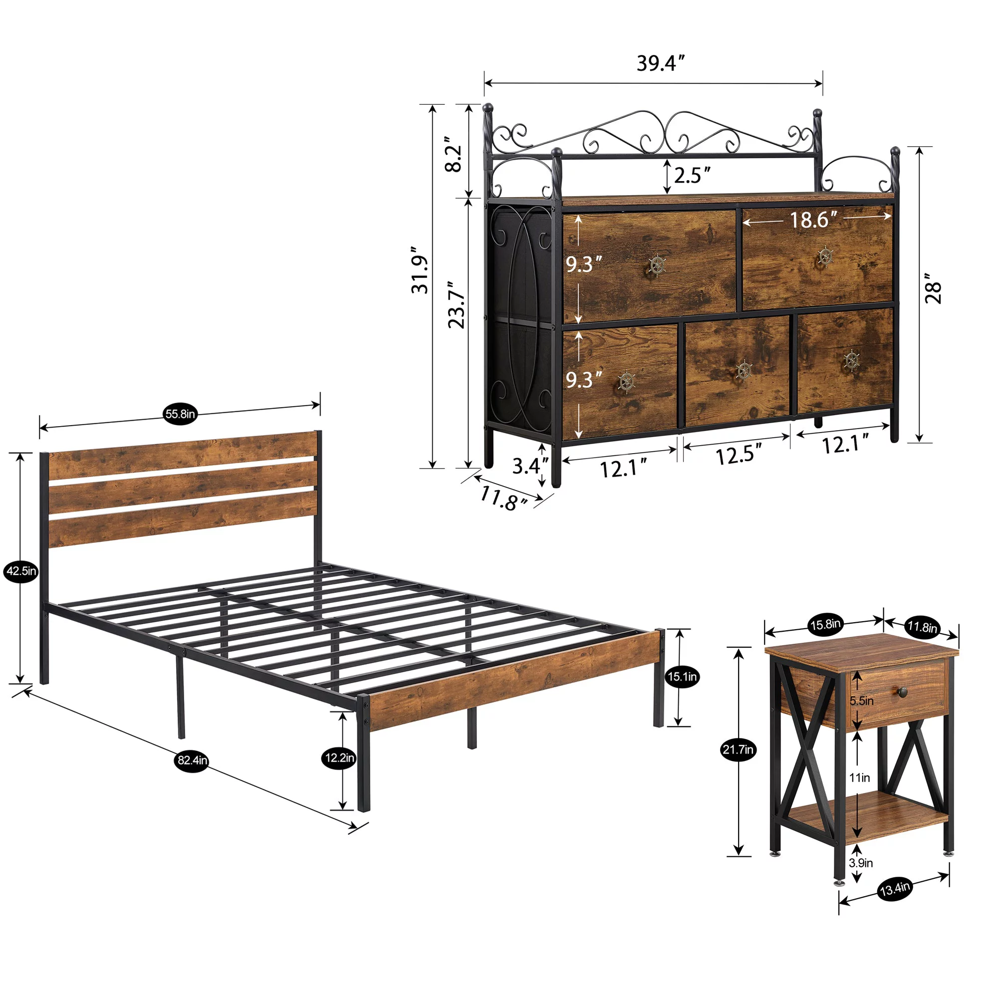 VECELO 4-Piece Bedroom Set with Full Size Platform Bed Frame & 5-Drawer Dresser & Two Nightstands, Brown