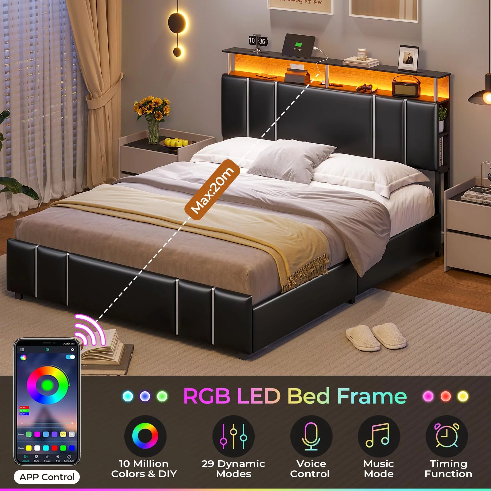 Euroco 2 Pieces Bedroom Set, Upholstery Full Size LED Platform Bed with Storage Ottoman for Bedroom, Pink