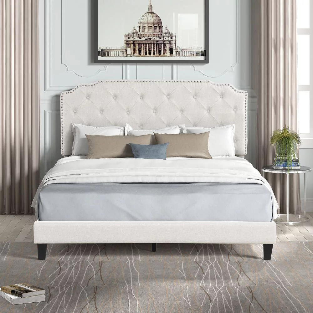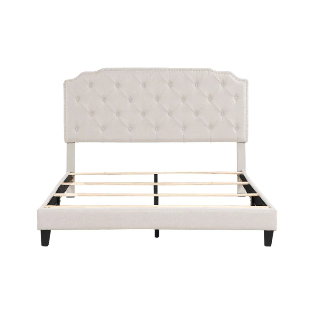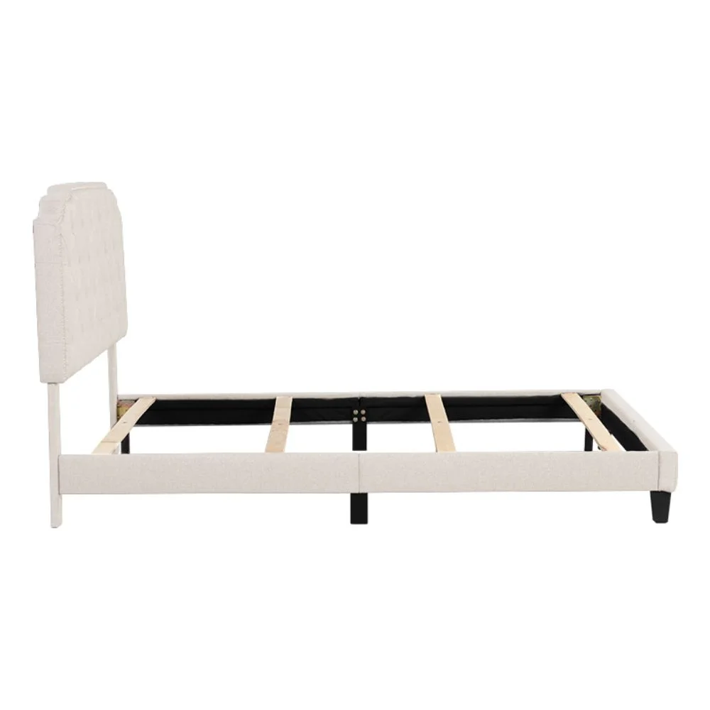 Upholstered Platform Bed with Saddle Curved Headboard and Diamond Tufted Details, Queen, Beige