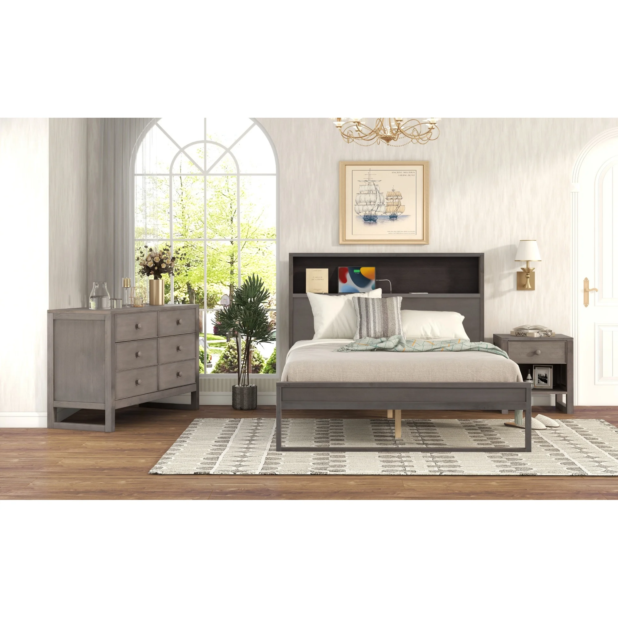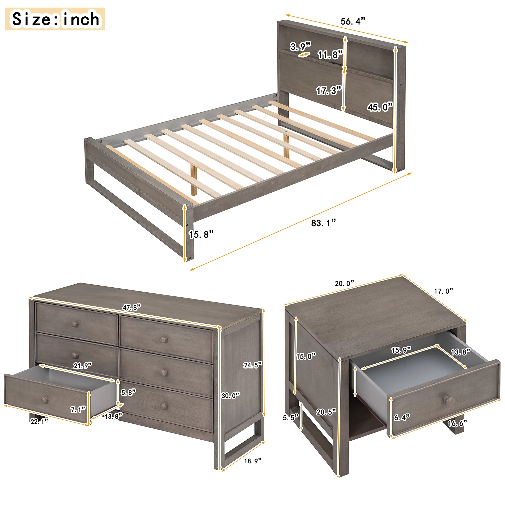 3-Pieces Bedroom Sets Full Size Platform Bed with Nightstand and Dresser,Antique Gray