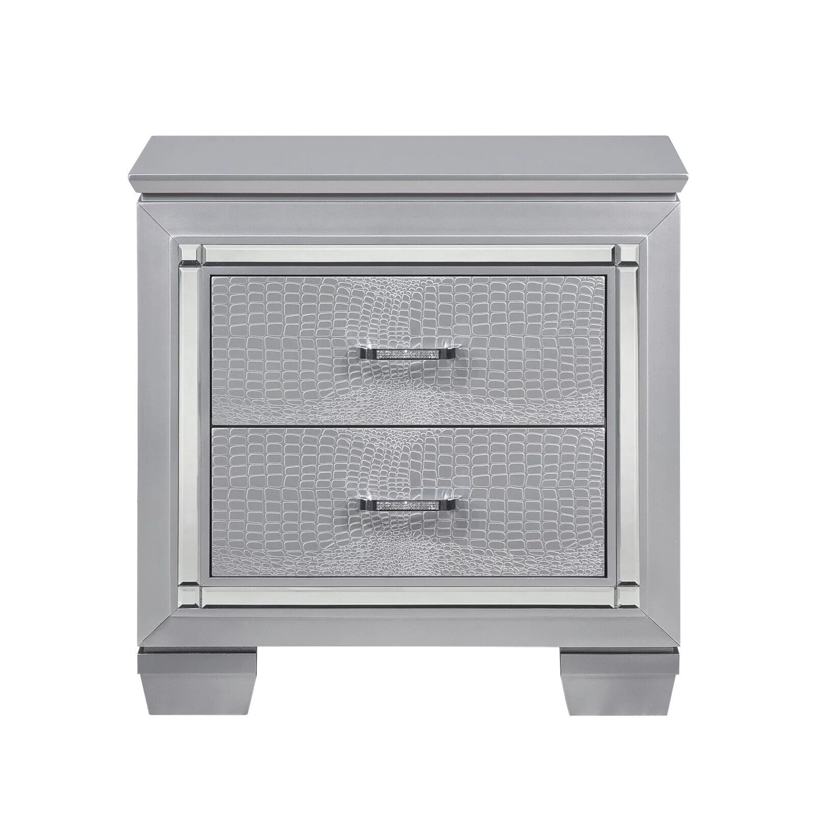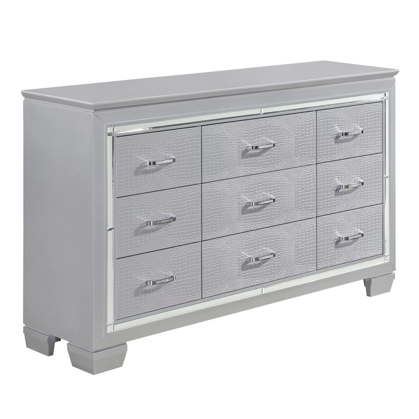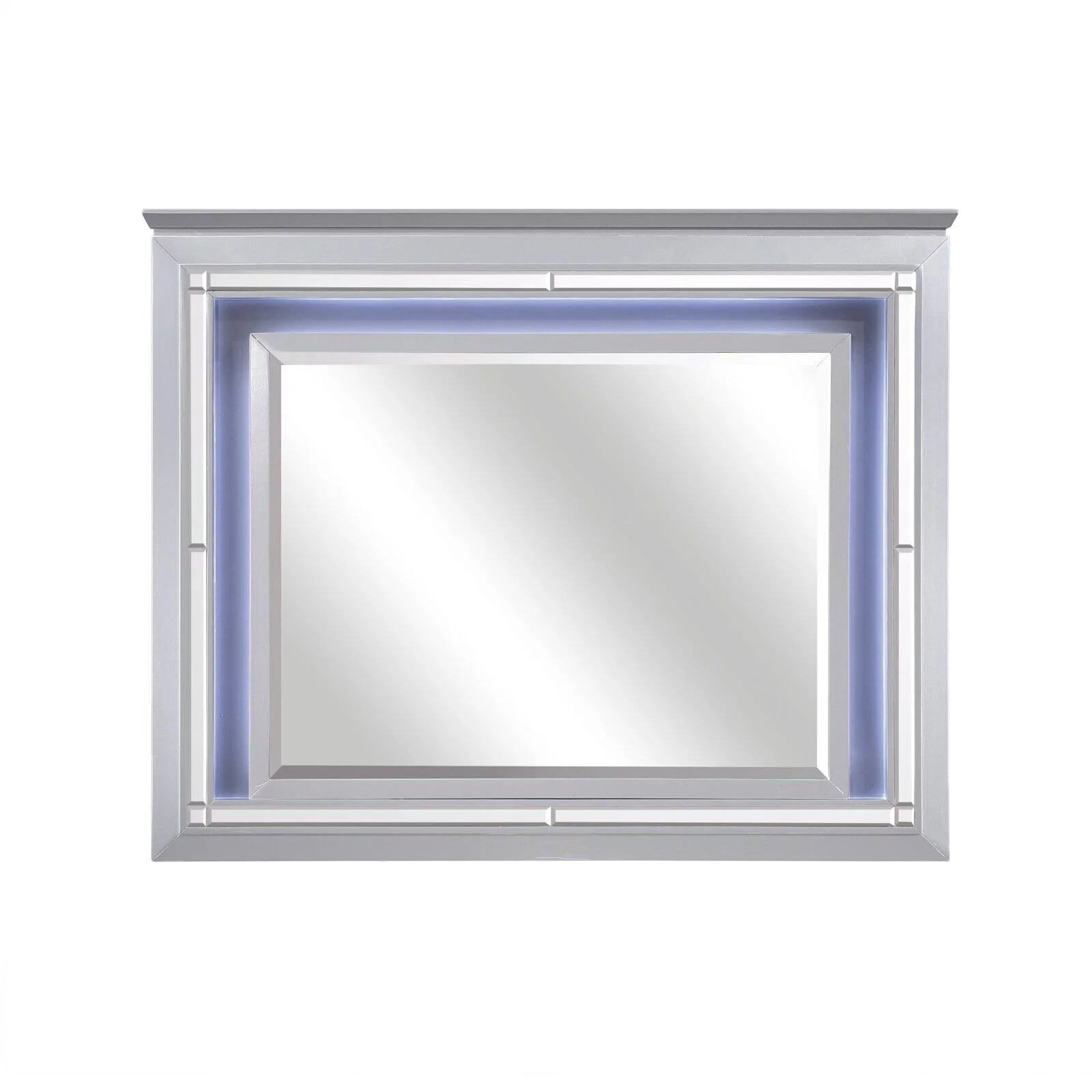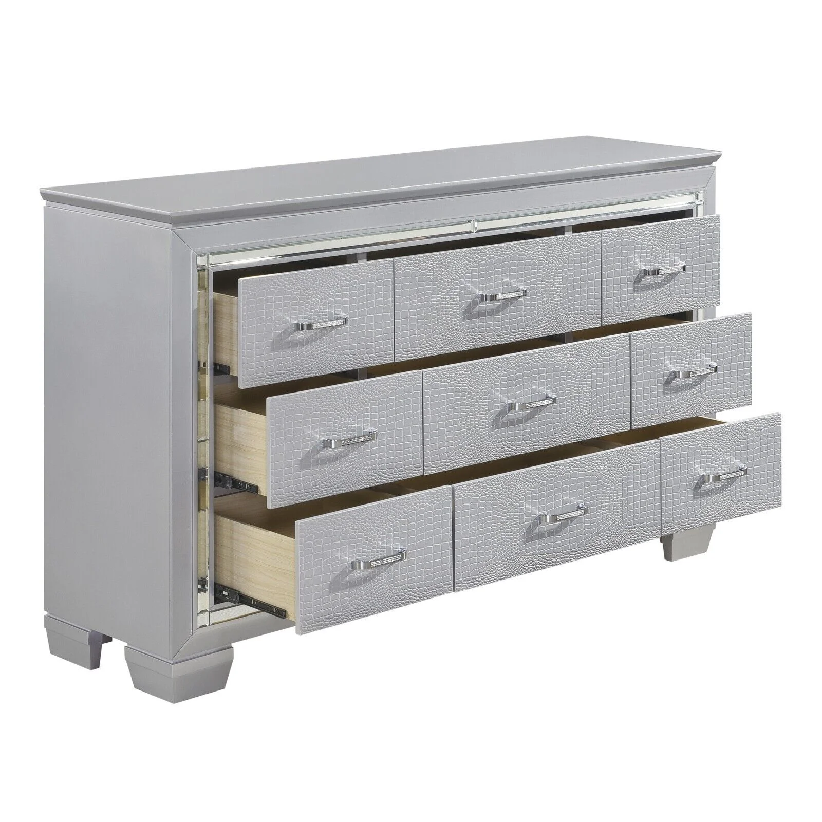 Gorgeous Silver Finish 4pc Bedroom Set Full Size LED Bed Nightstand Dresser LED Mirror Wooden Furniture