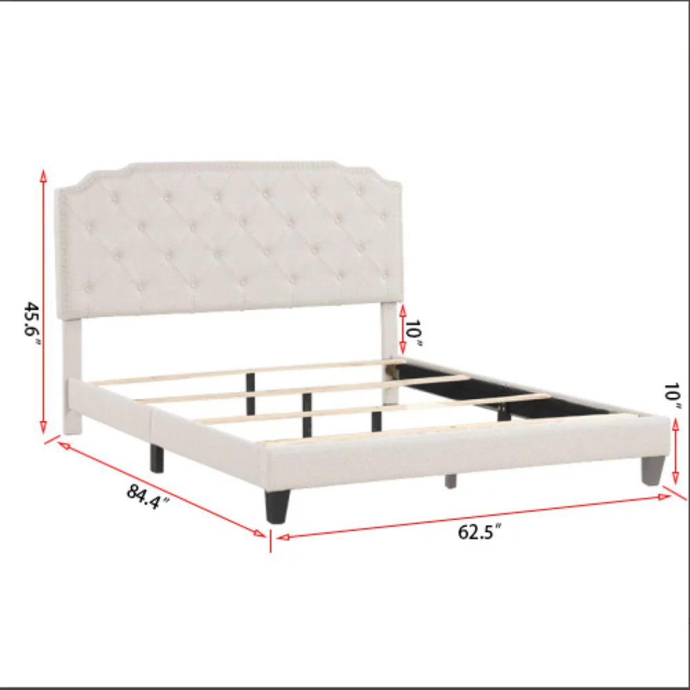Beige Upholstered Platform Bed with Saddle Curved Headboard, Diamond Tufted Details, and Luxurious Upholstery, Queen