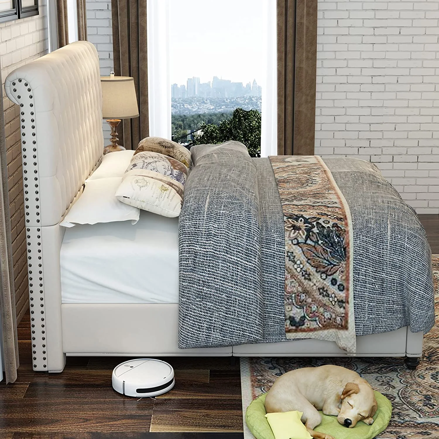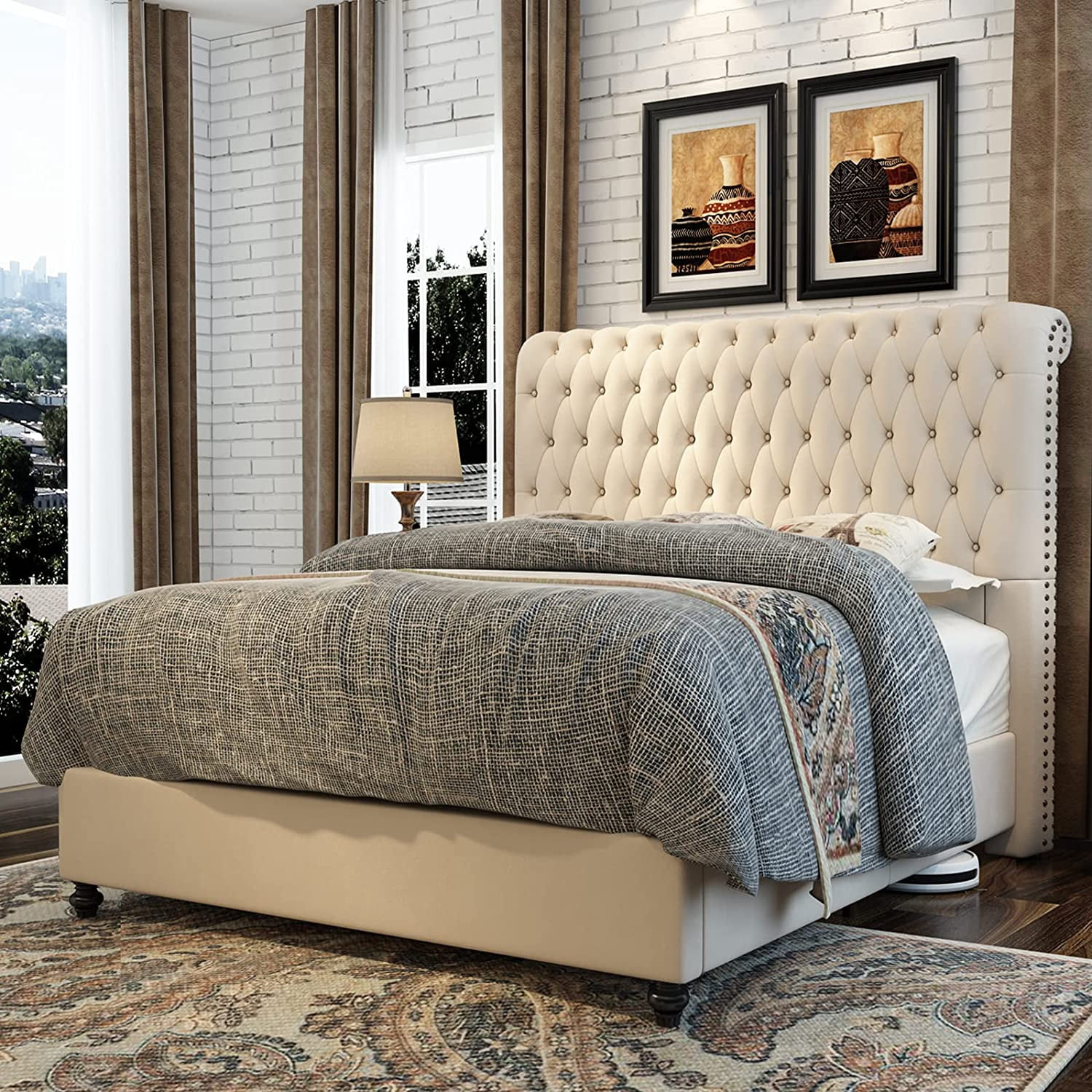 Platform Bed Frame King Size Velvet Upholstered Sleigh Bed Button Tufted Headborad/No Box Spring Needed/Cream