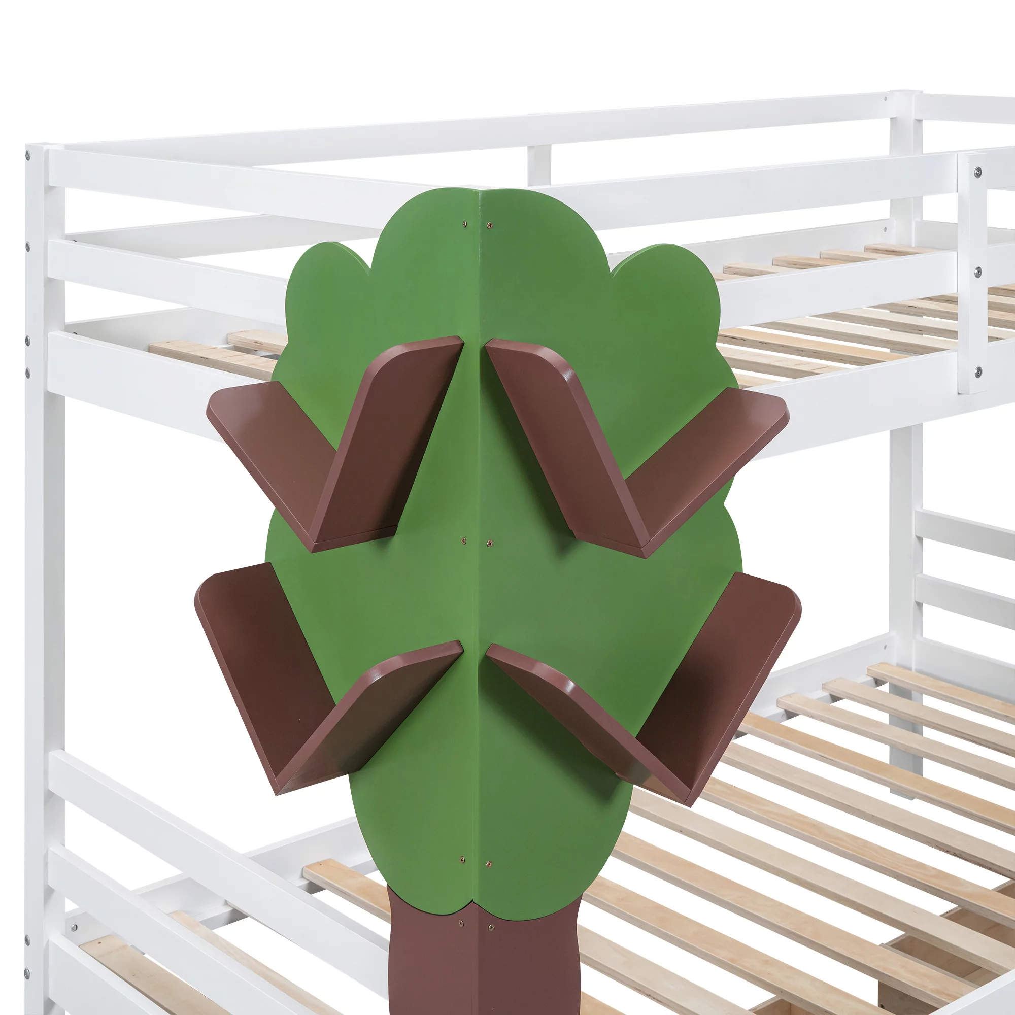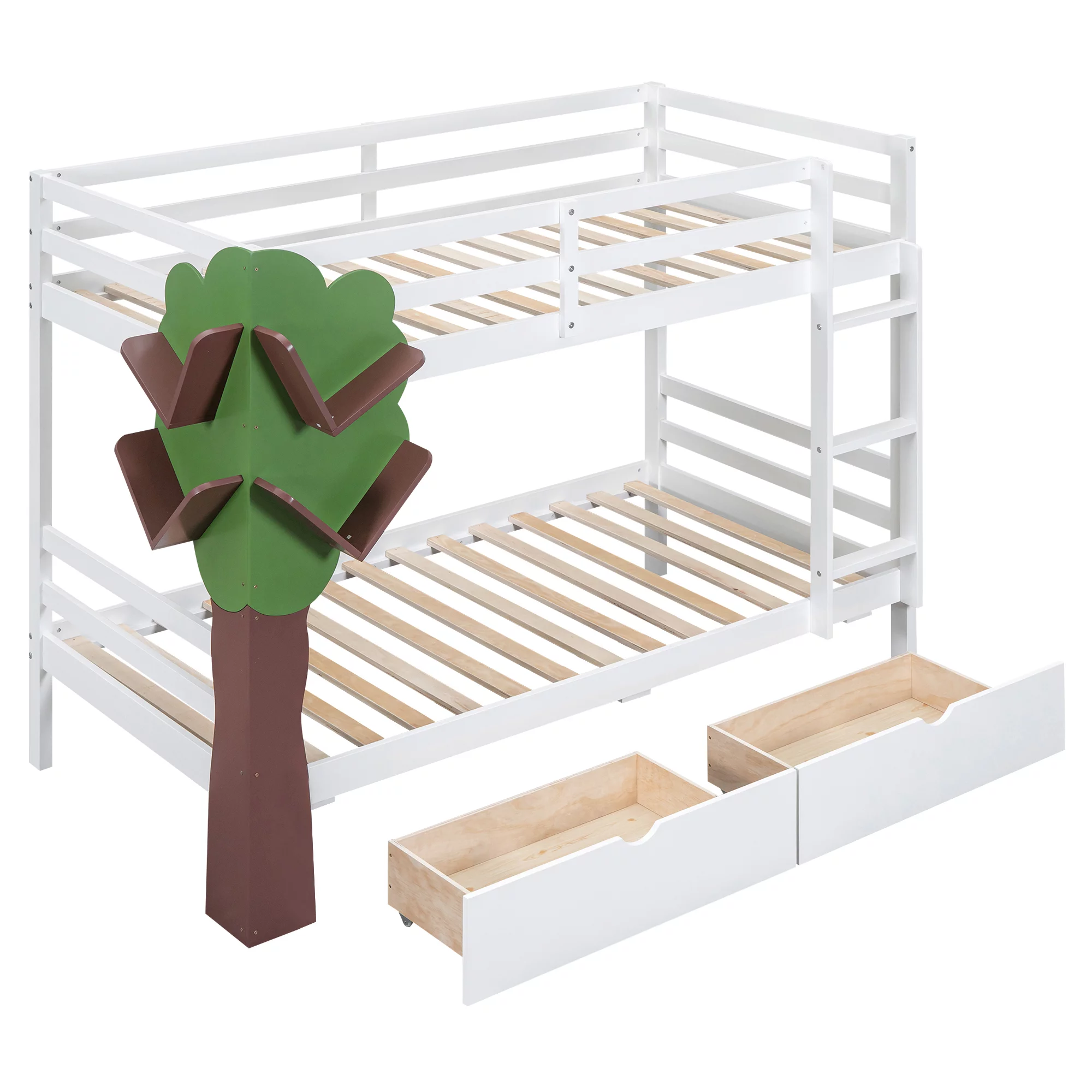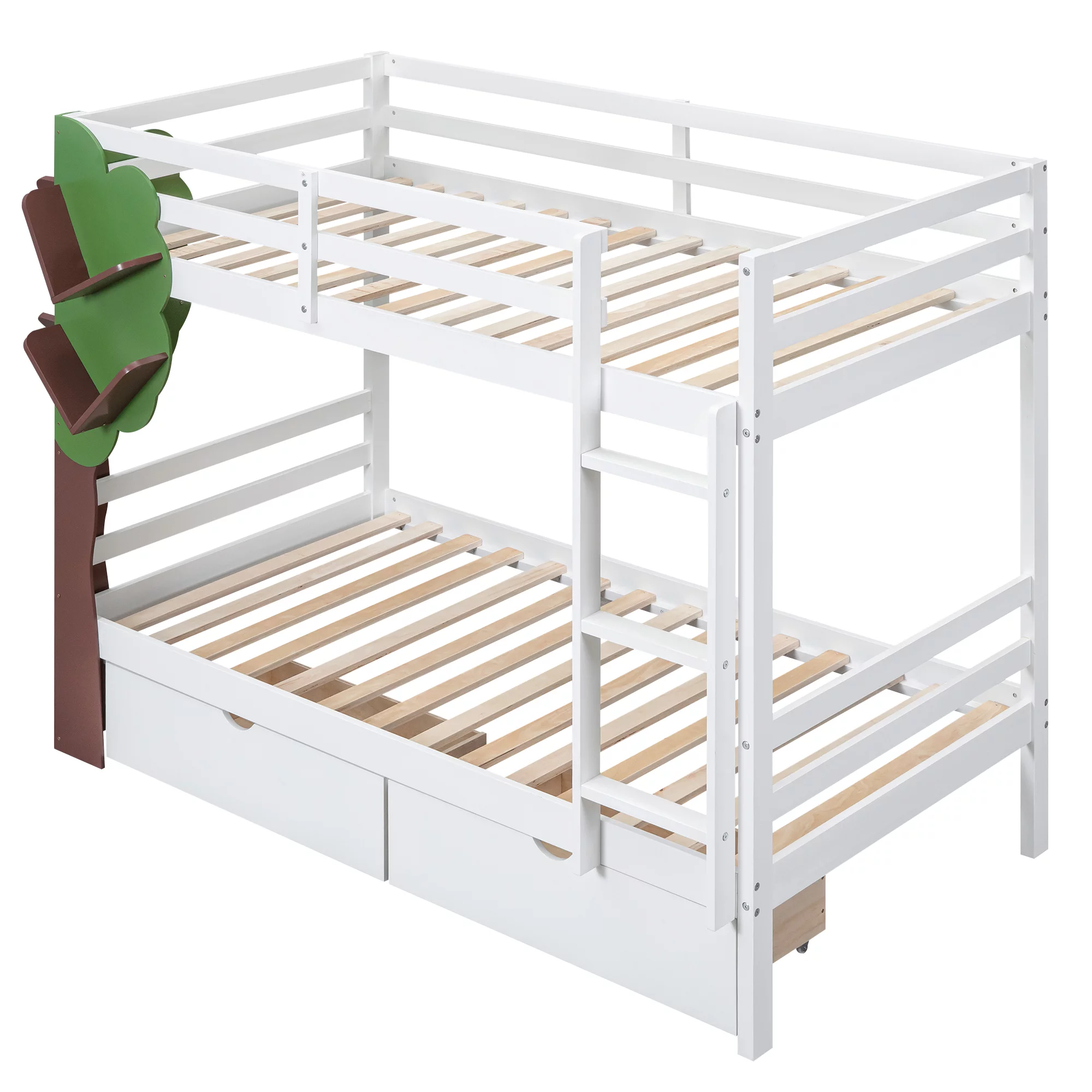 Modern Twin Over Twin Bunk Bed with Drawers, Wood Slat Bed Frame with Tree Decor Storage Shelves Rack for Child Kids