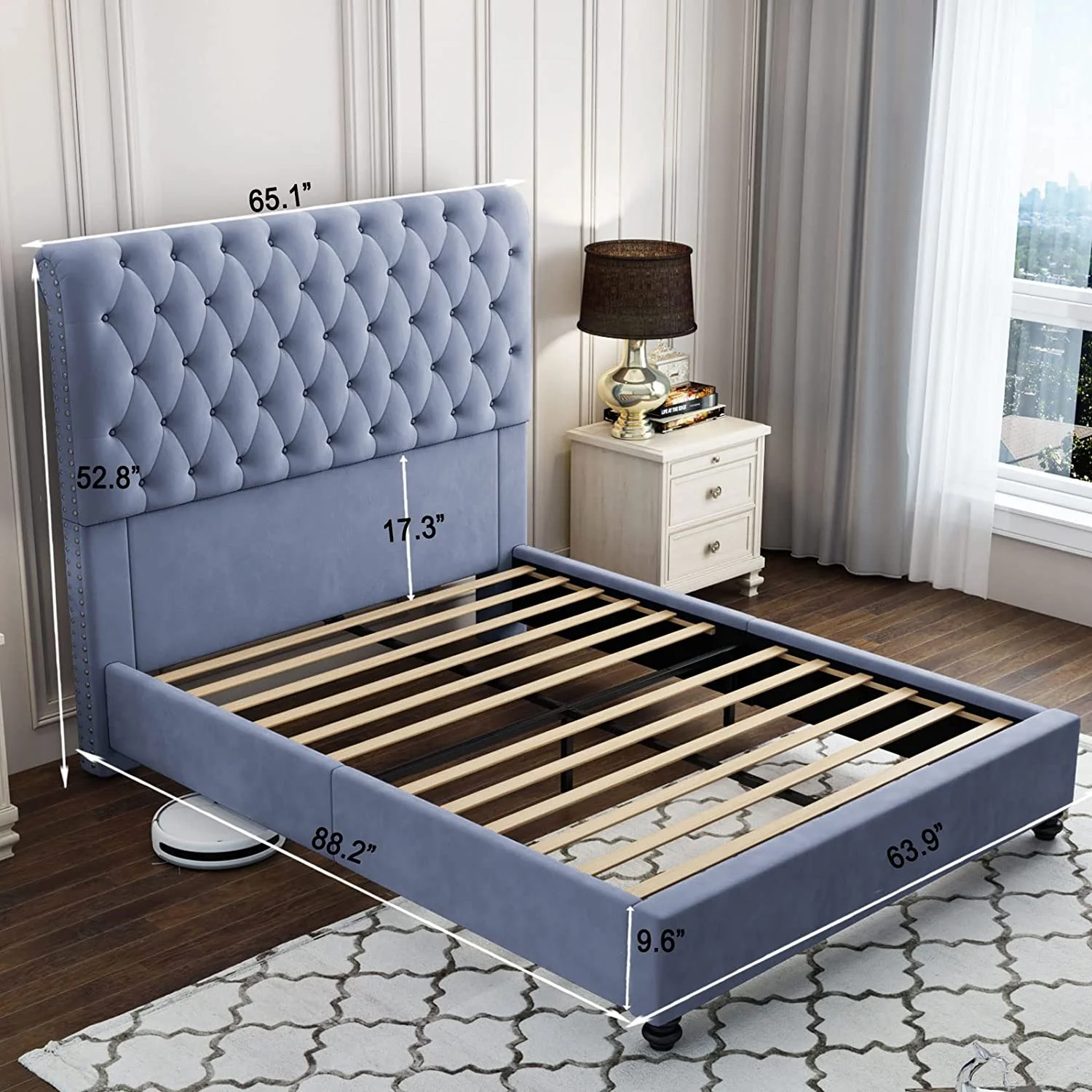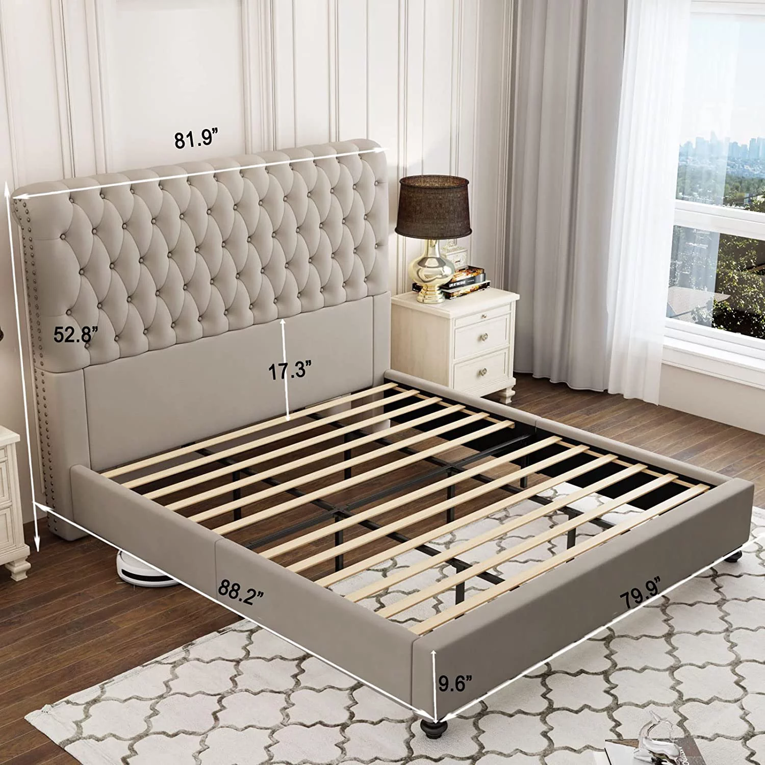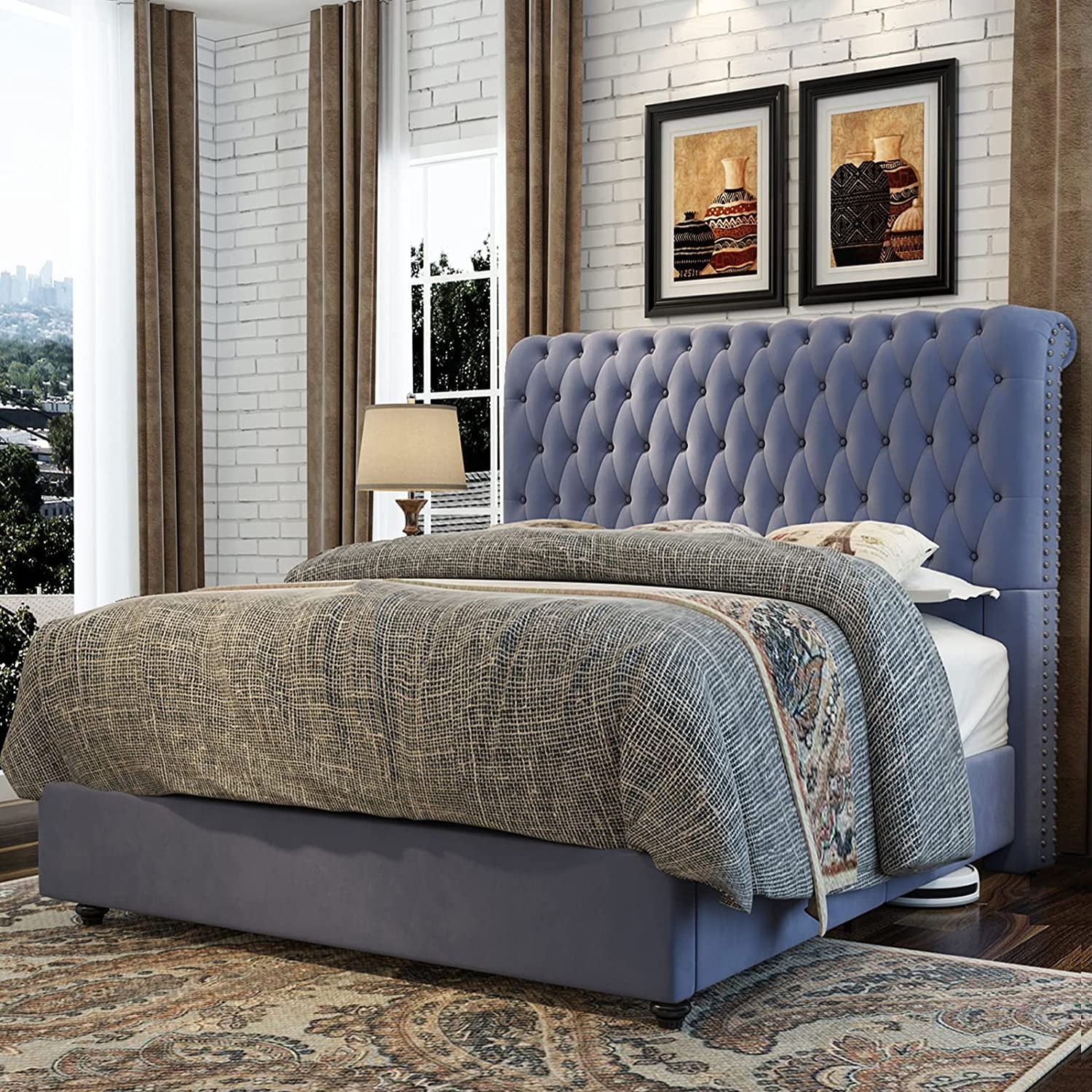 Platform Bed Frame King Size Velvet Upholstered Sleigh Bed Button Tufted Headborad/No Box Spring Needed/Gray