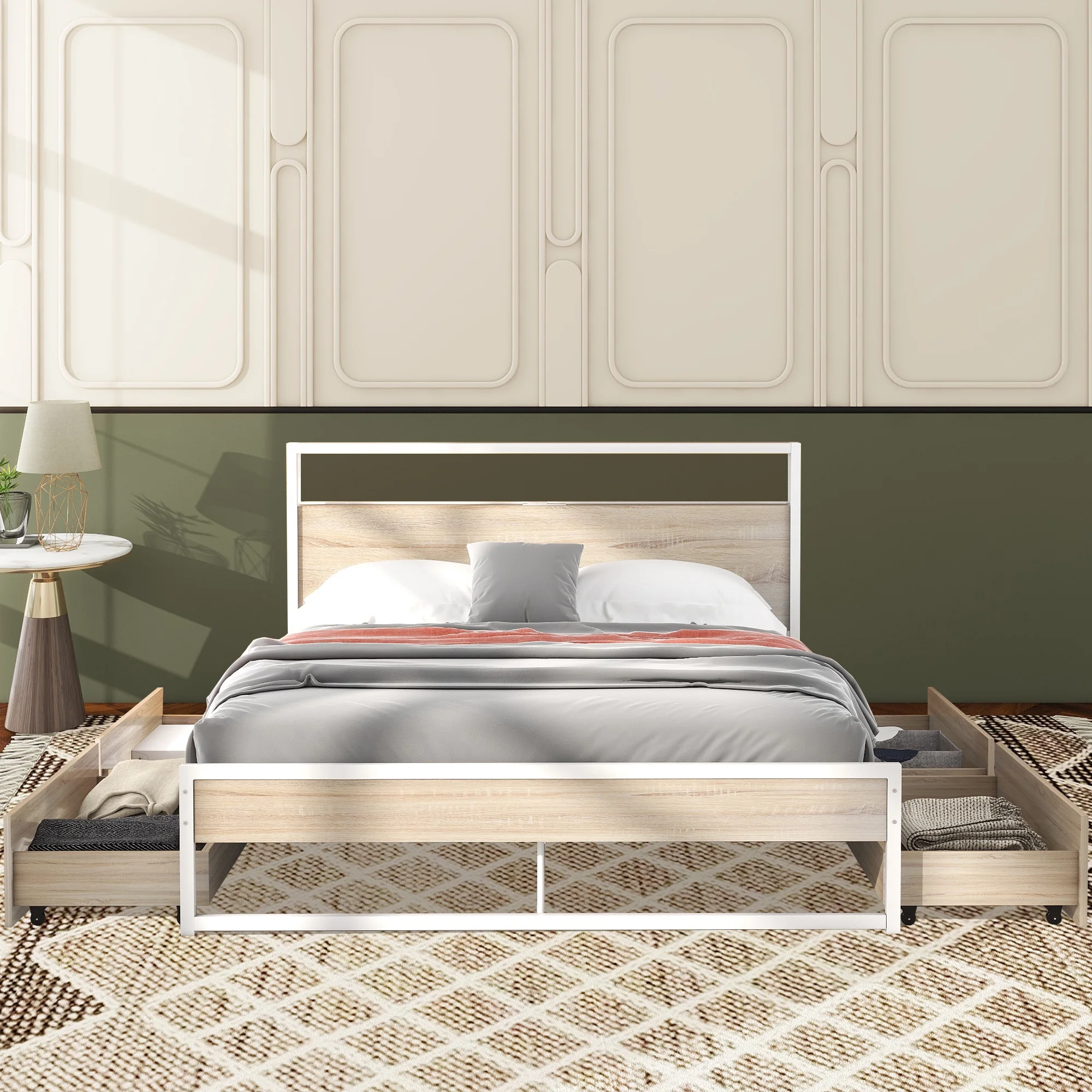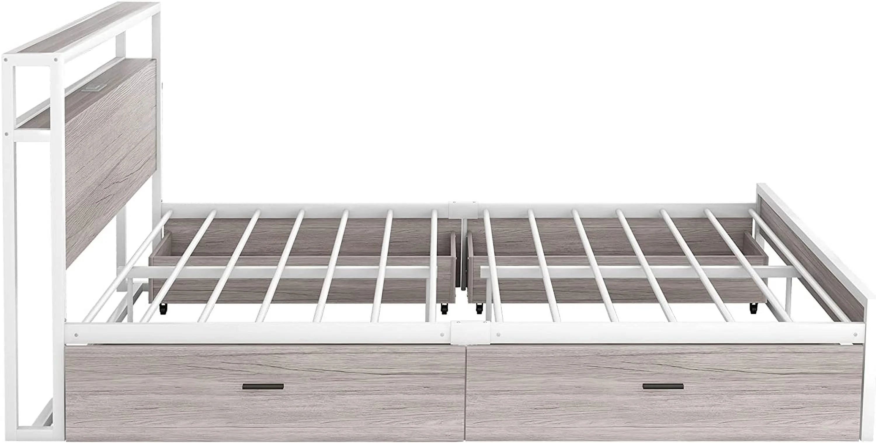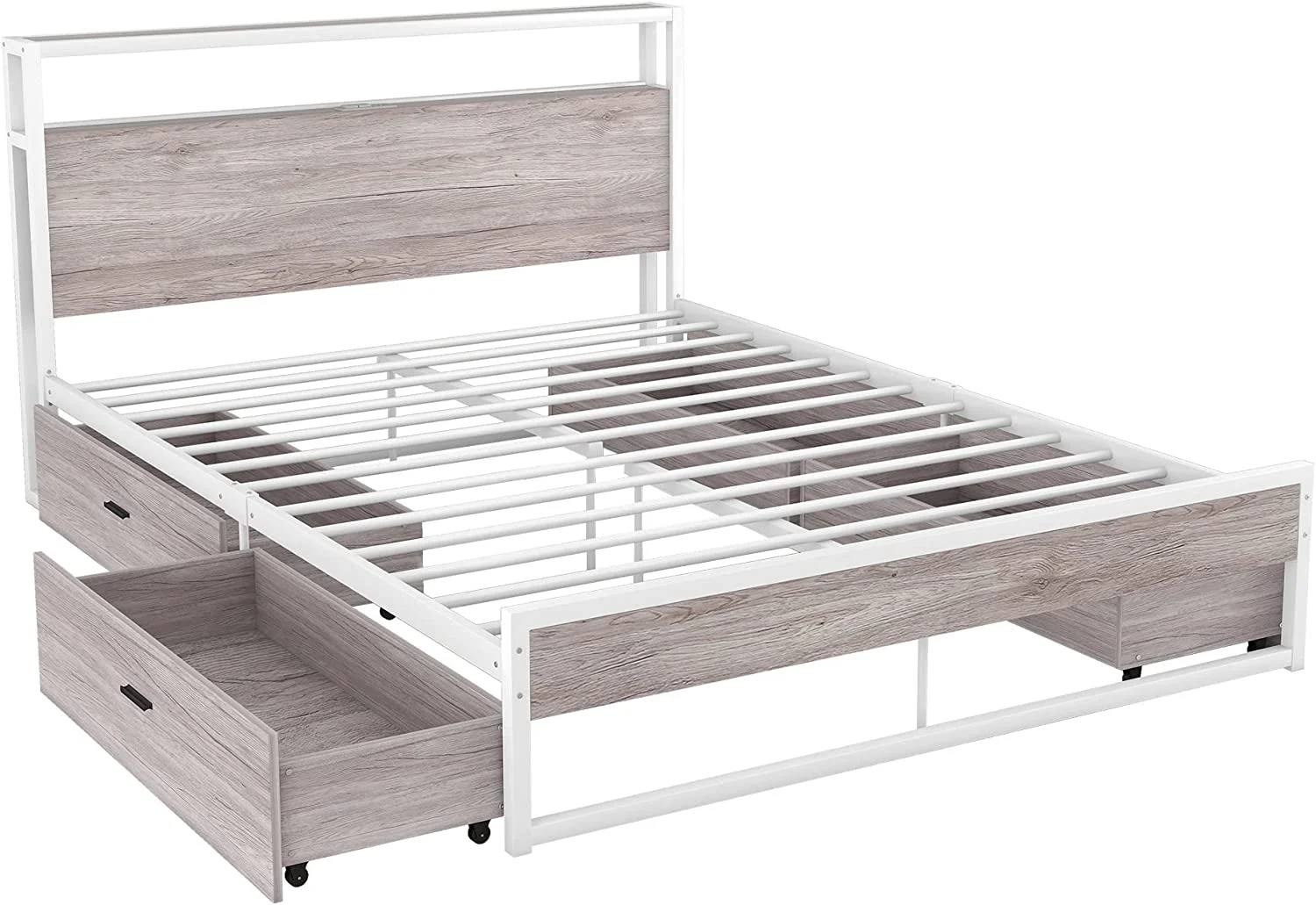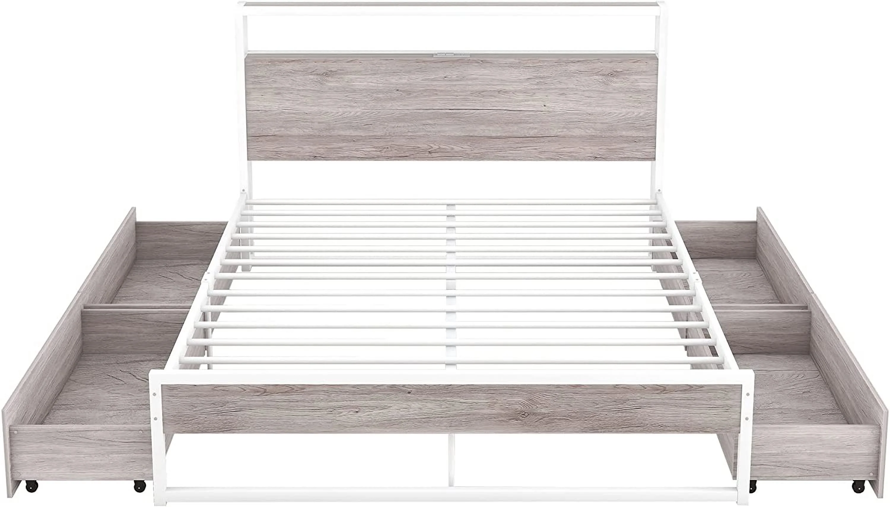 Queen Size Metal Platform Bed Frame with Four Drawers,Sockets and USB Ports,Slat Support No Box Spring Needed,White