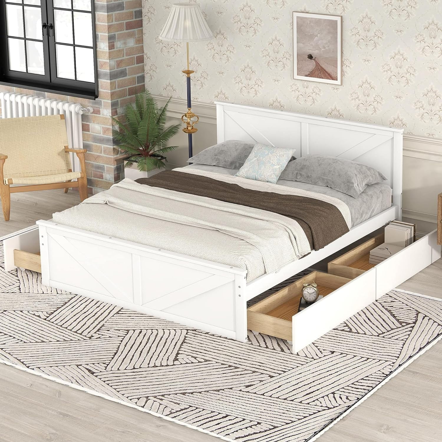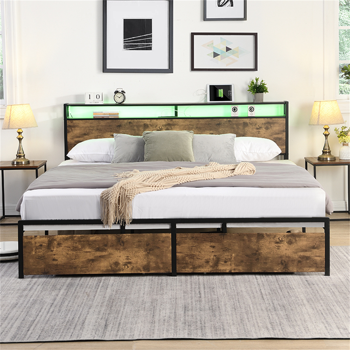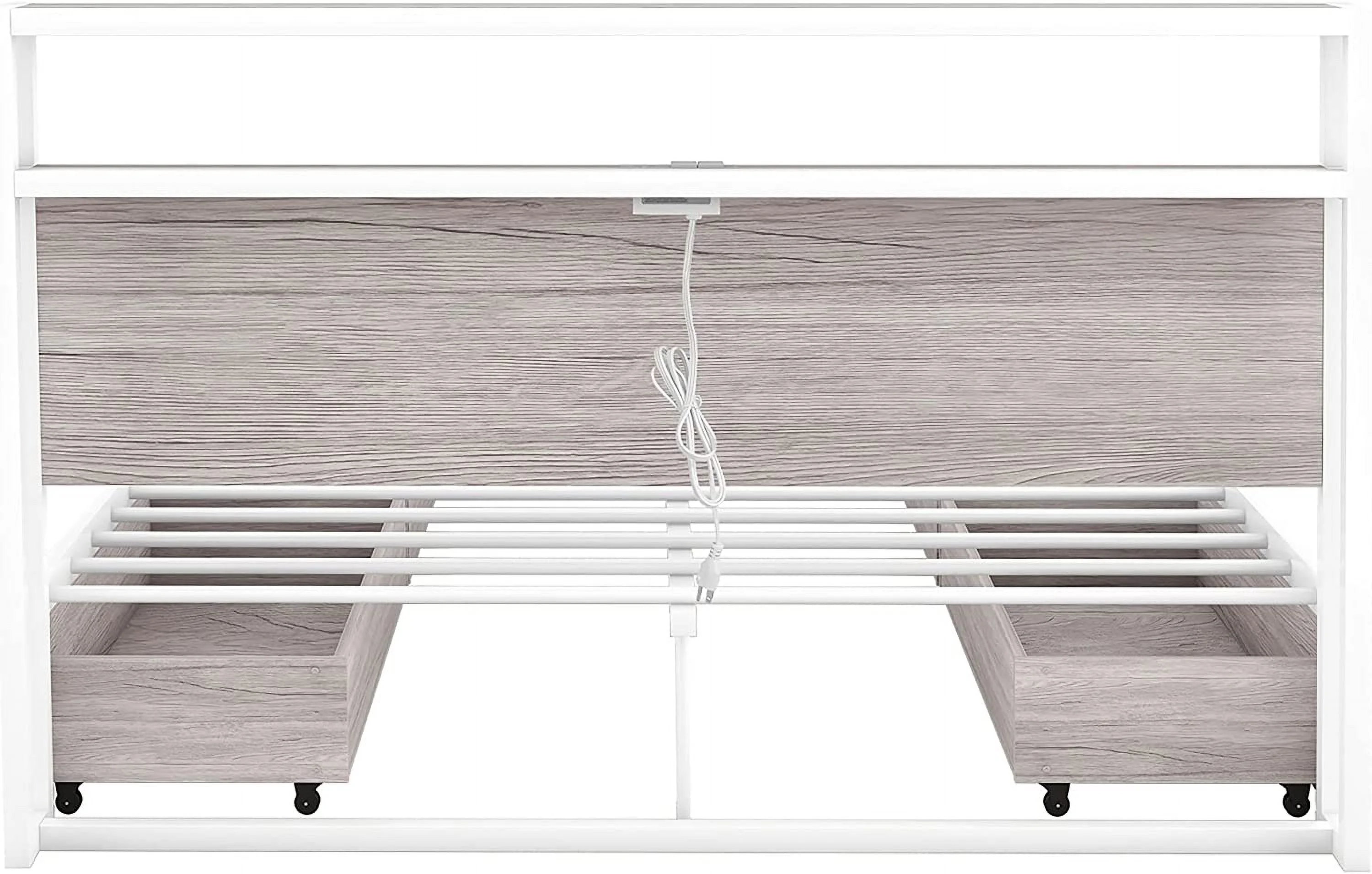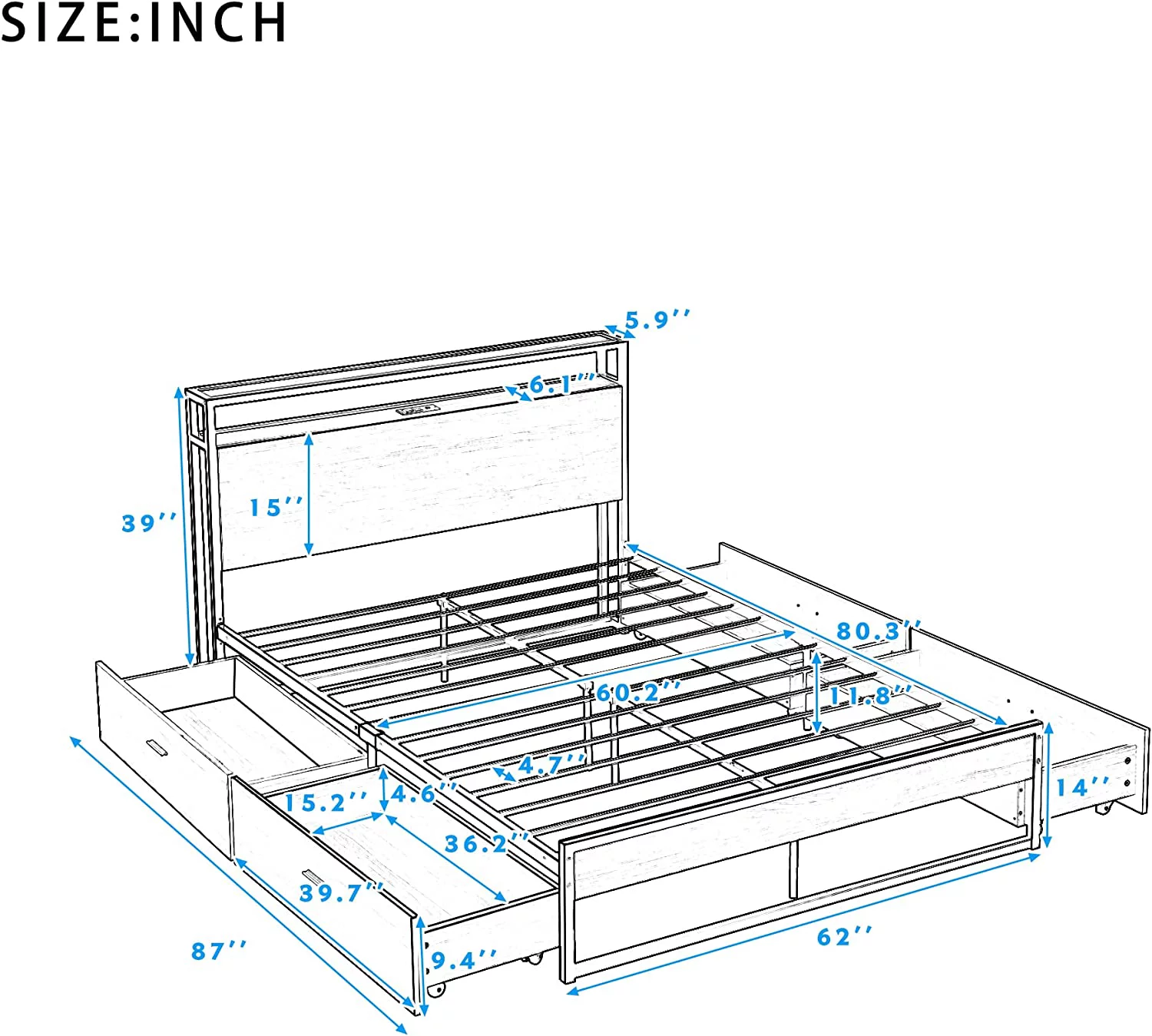 Queen Size Metal Platform Bed Frame with Four Drawers,Sockets and USB Ports,Slat Support No Box Spring Needed,White