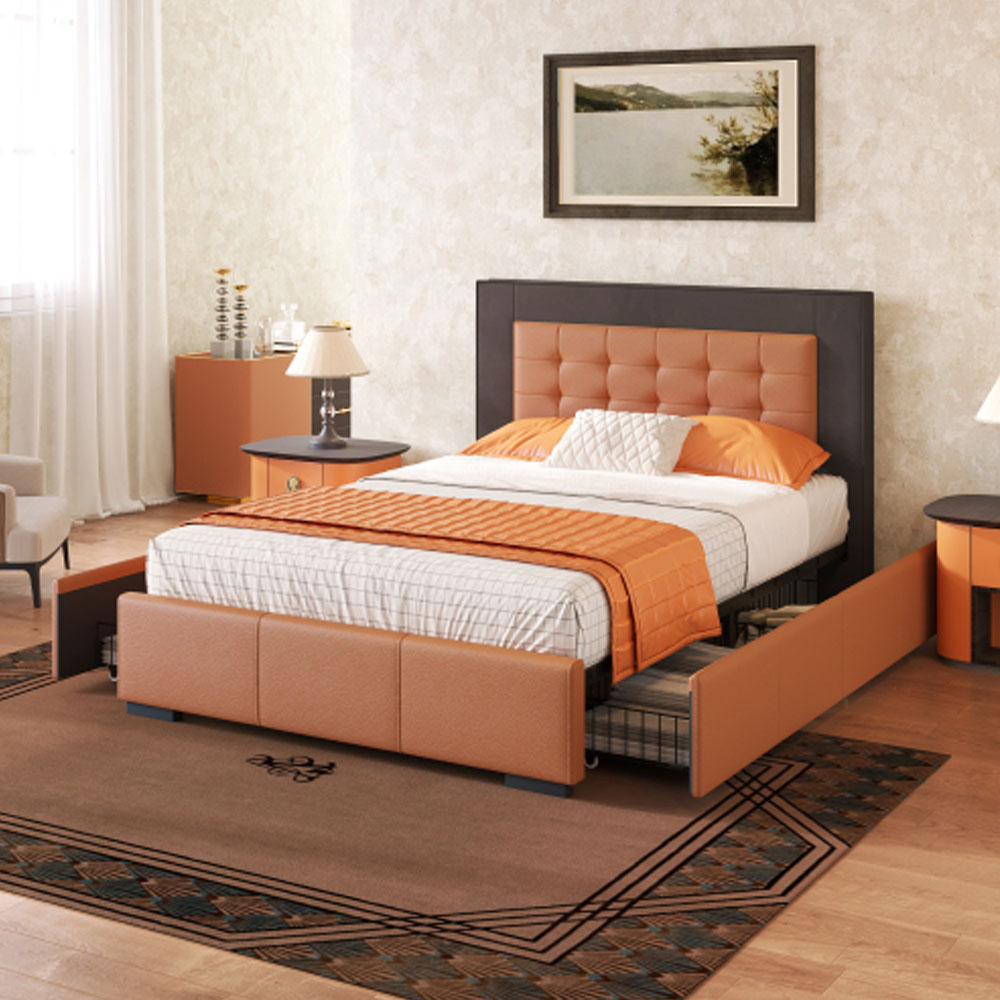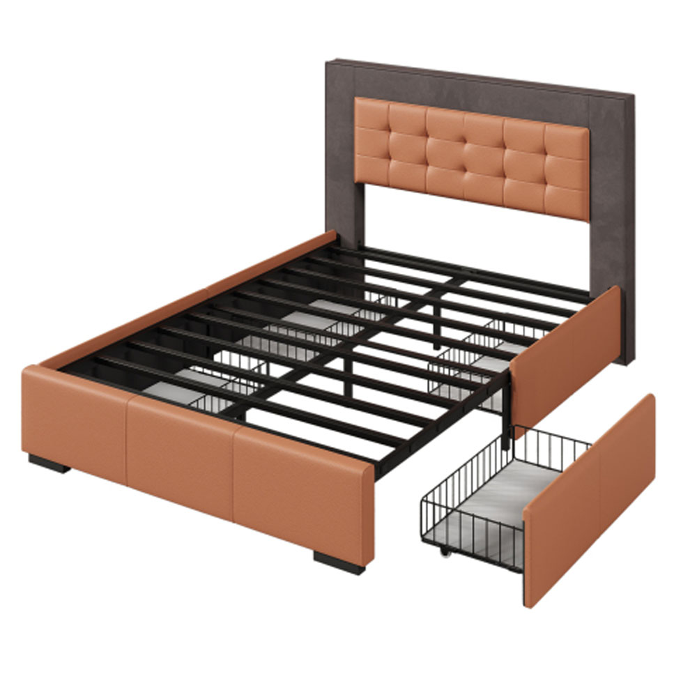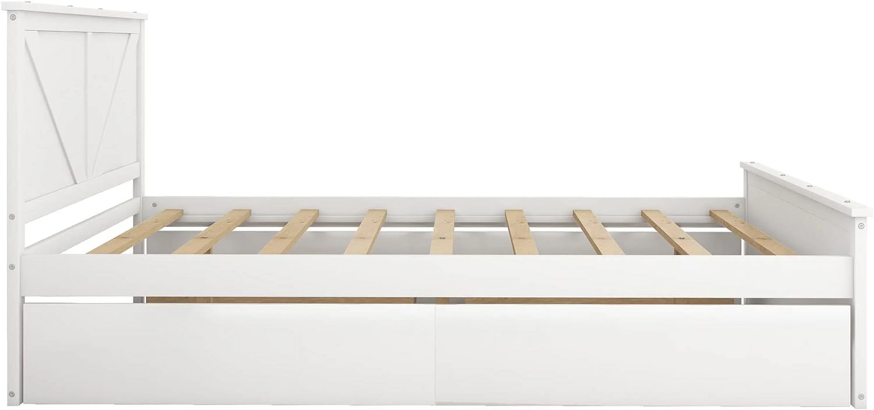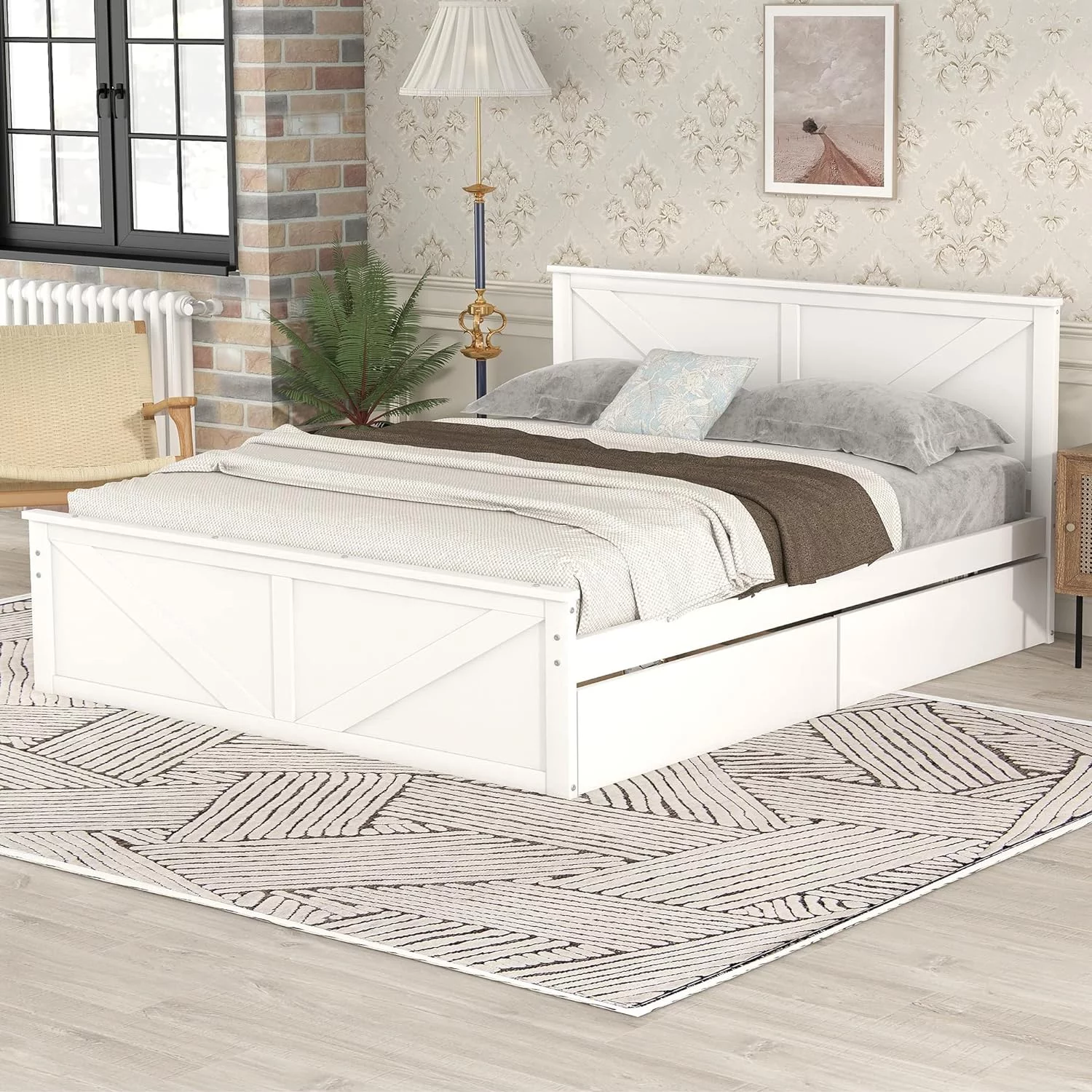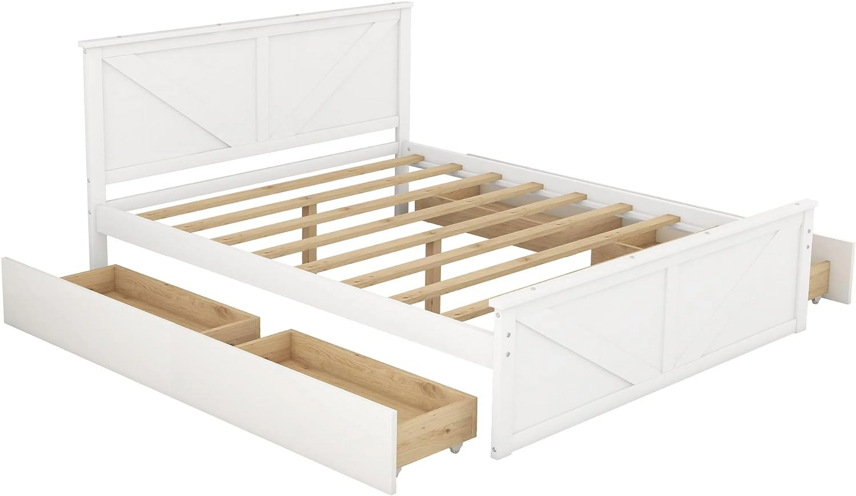 Queen Size Metal Platform Bed Frame with Four Drawers,Sockets and USB Ports,Slat Support No Box Spring Needed,White