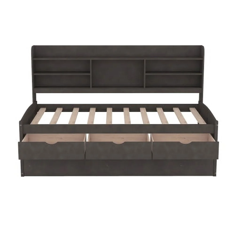 Motent Twin Size Wooden Captain Bed with Built-in Bookshelves,Three Storage Drawers and Trundle, Bedroom, Brown