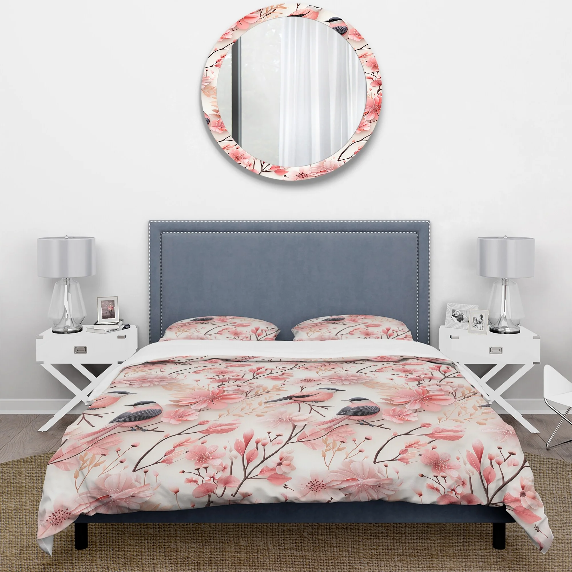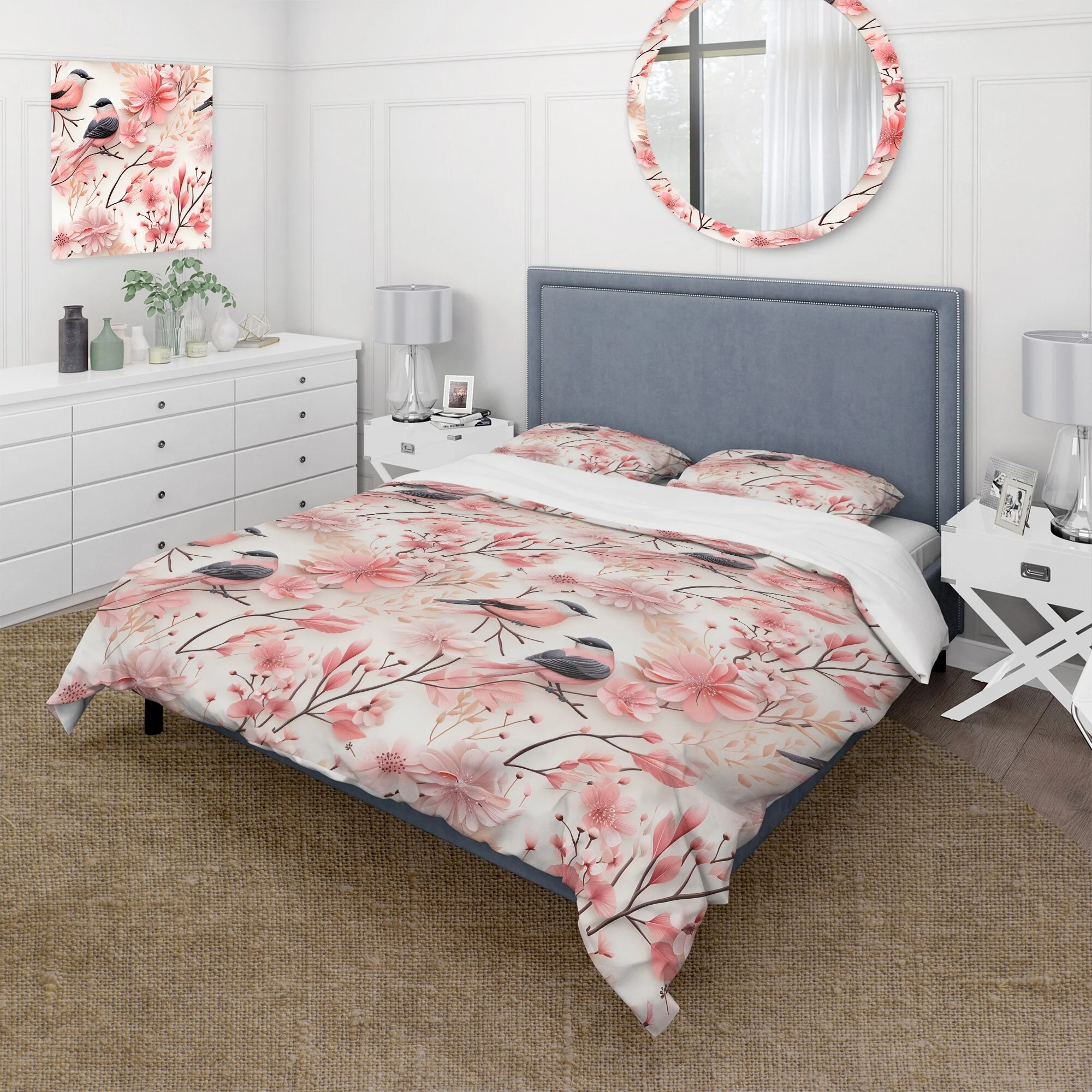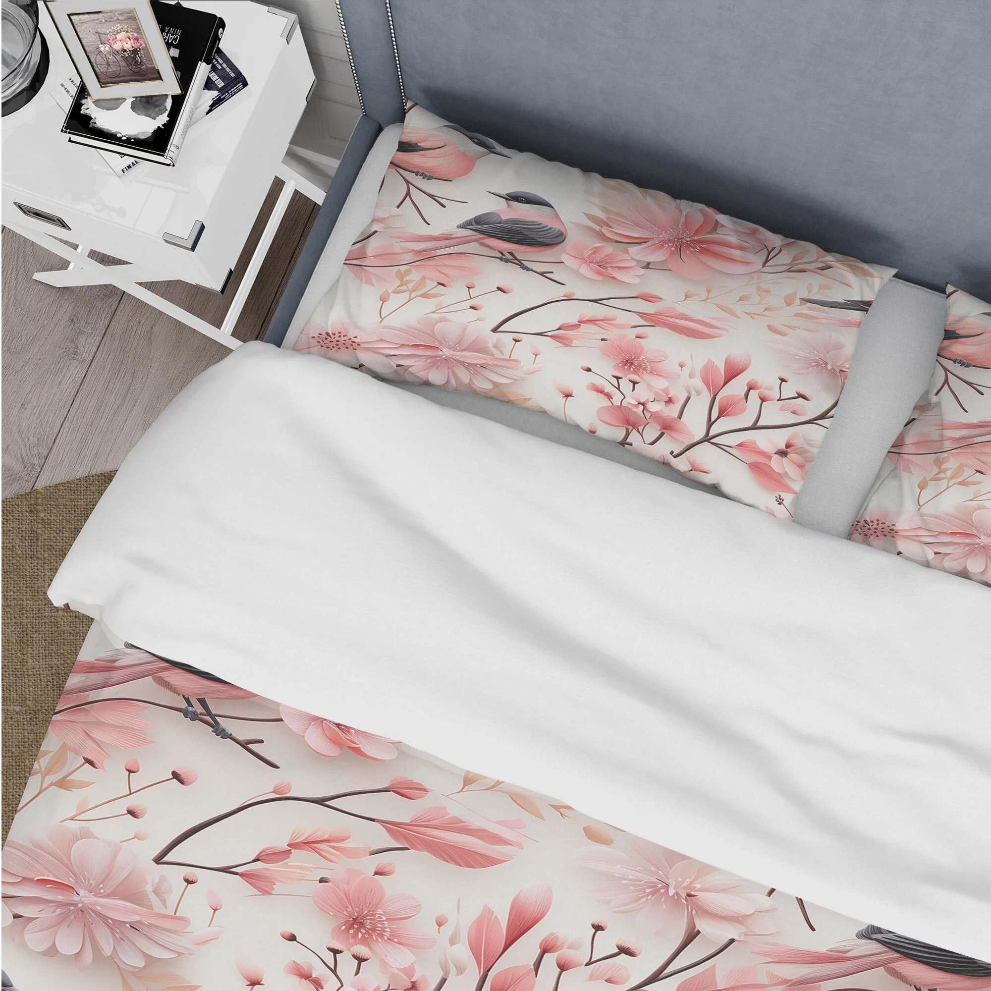 Designart "Pink Nordic Bird Grace" Floral Bedding Covert Set - Cottage Bed Set With 1 Sham