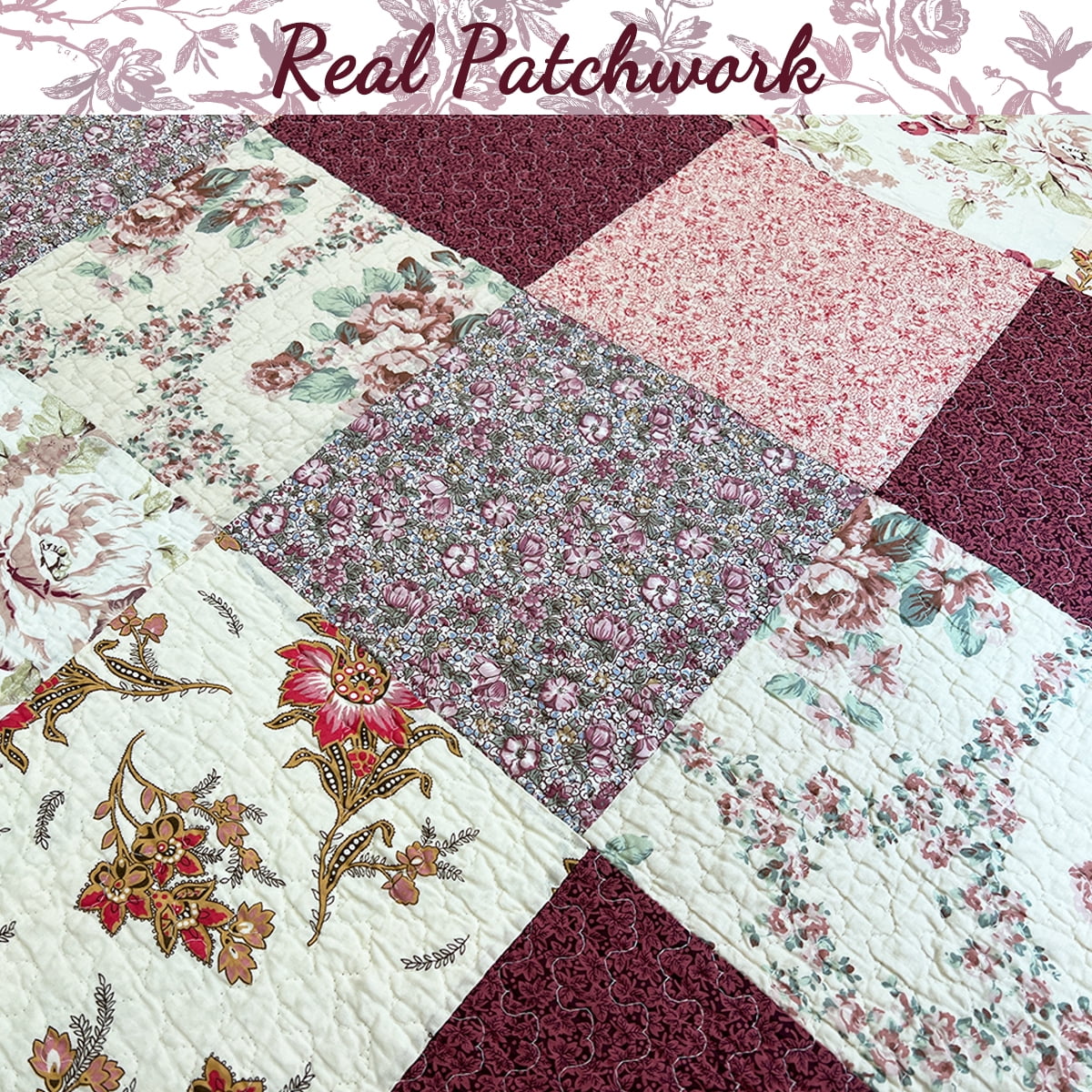 Cozy Line Grace Burgundy Red Real Floral Patchwork Cotton Quilt Set, Queen Set