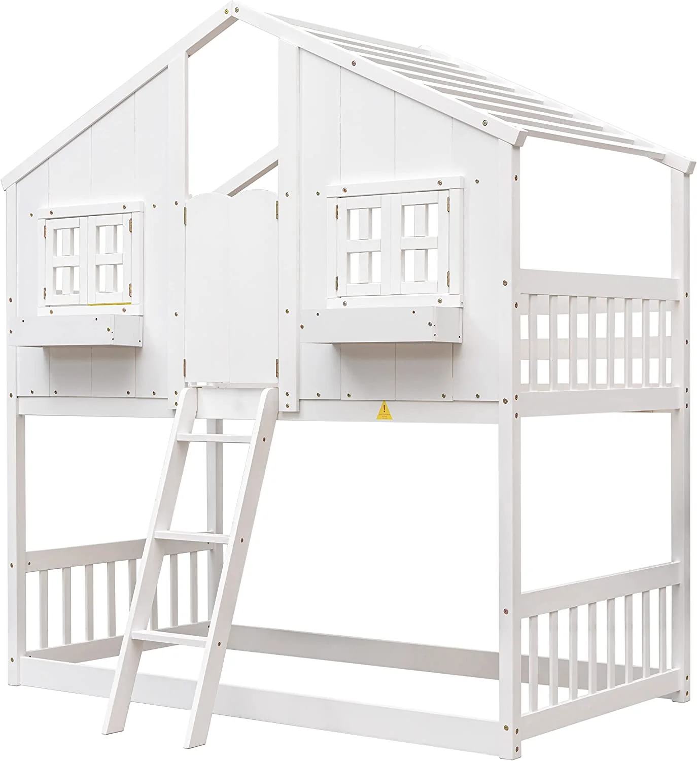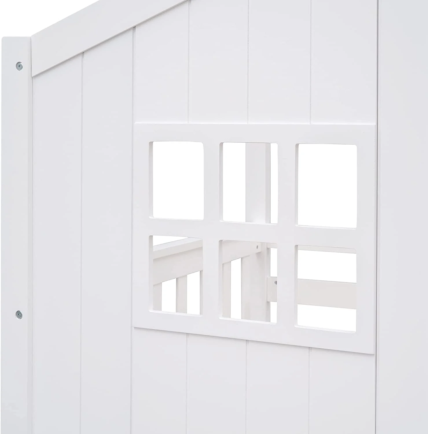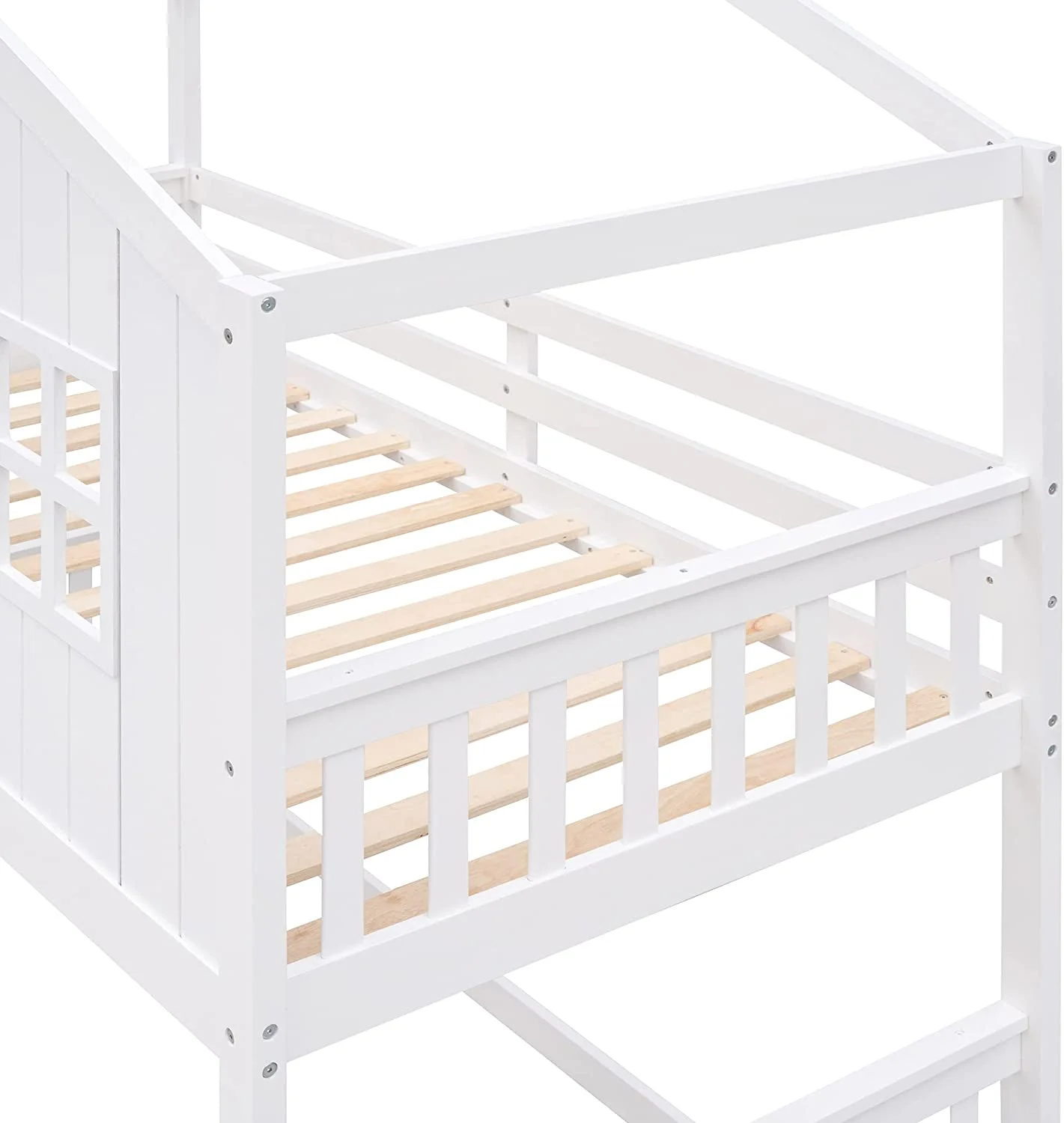 House Buk Bed Over Kids Buk Bed Wood Frame For Girls Boys, Roof Desig ( Size, White)