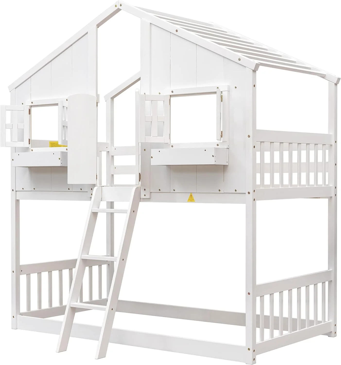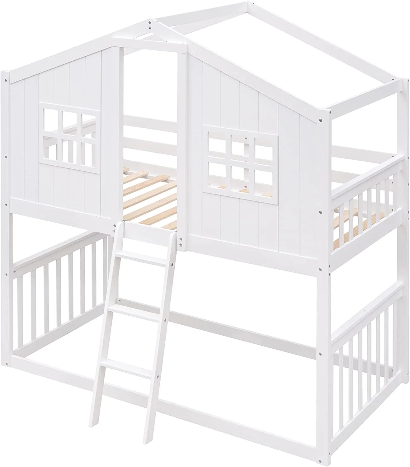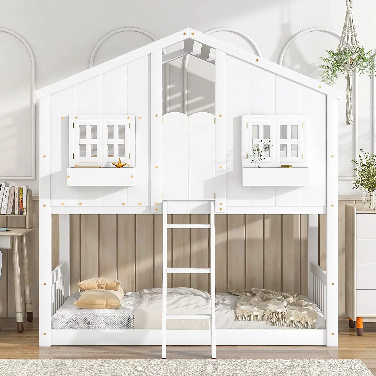 House Buk Bed Over Kids Buk Bed Wood Frame For Girls Boys, Roof Desig ( Size, White)