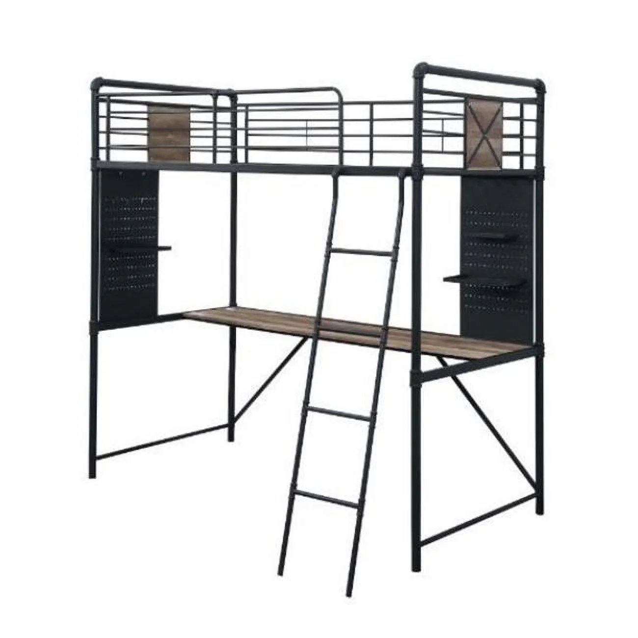 Miekor Furniture Cordelia Twin Loft Bed w/Desk in Antique Oak, Sandy Black & Dark Bronze Hand-Brushed Finish