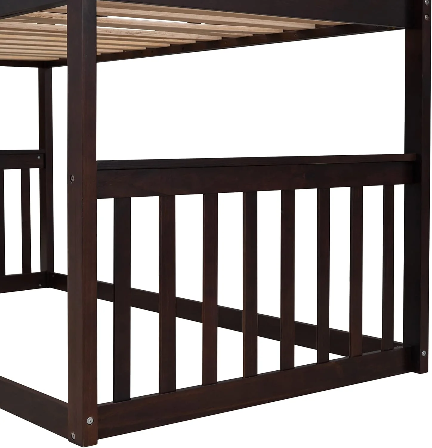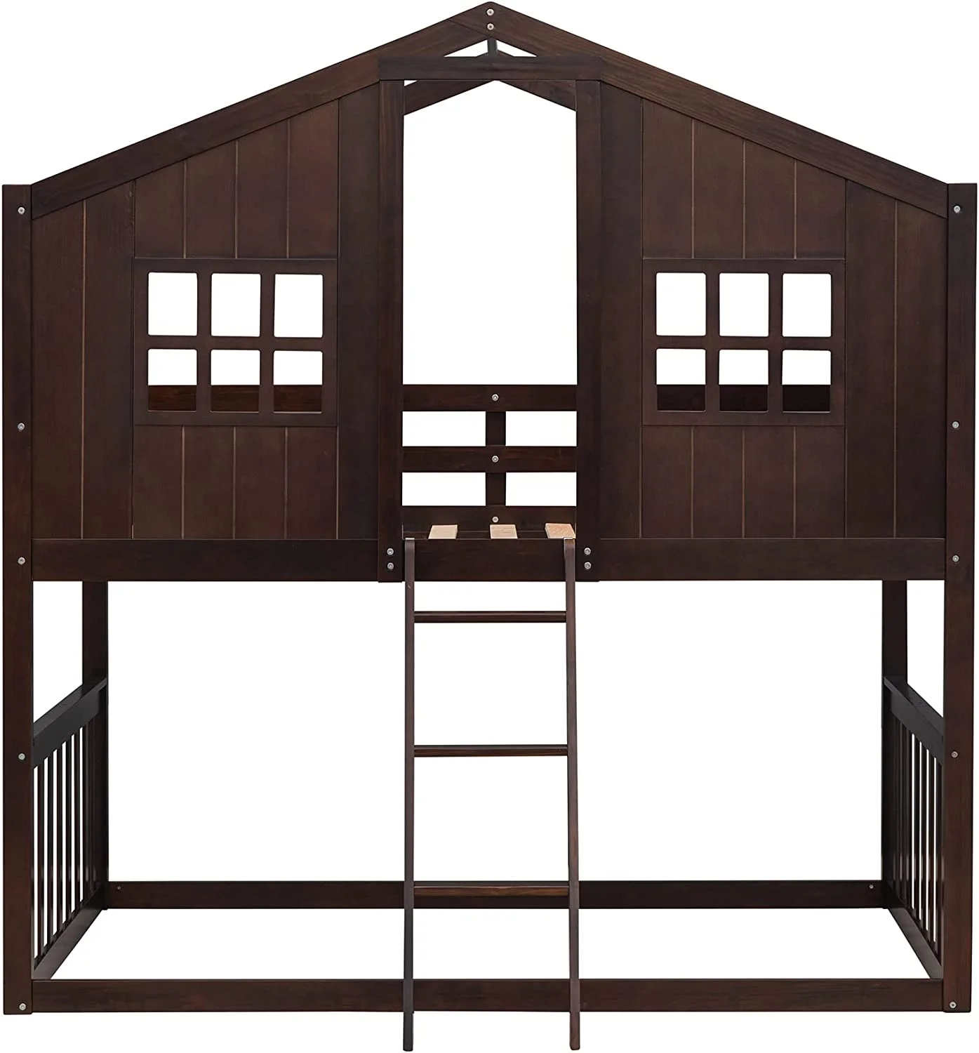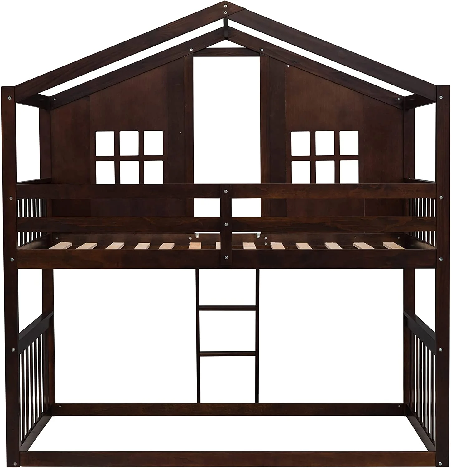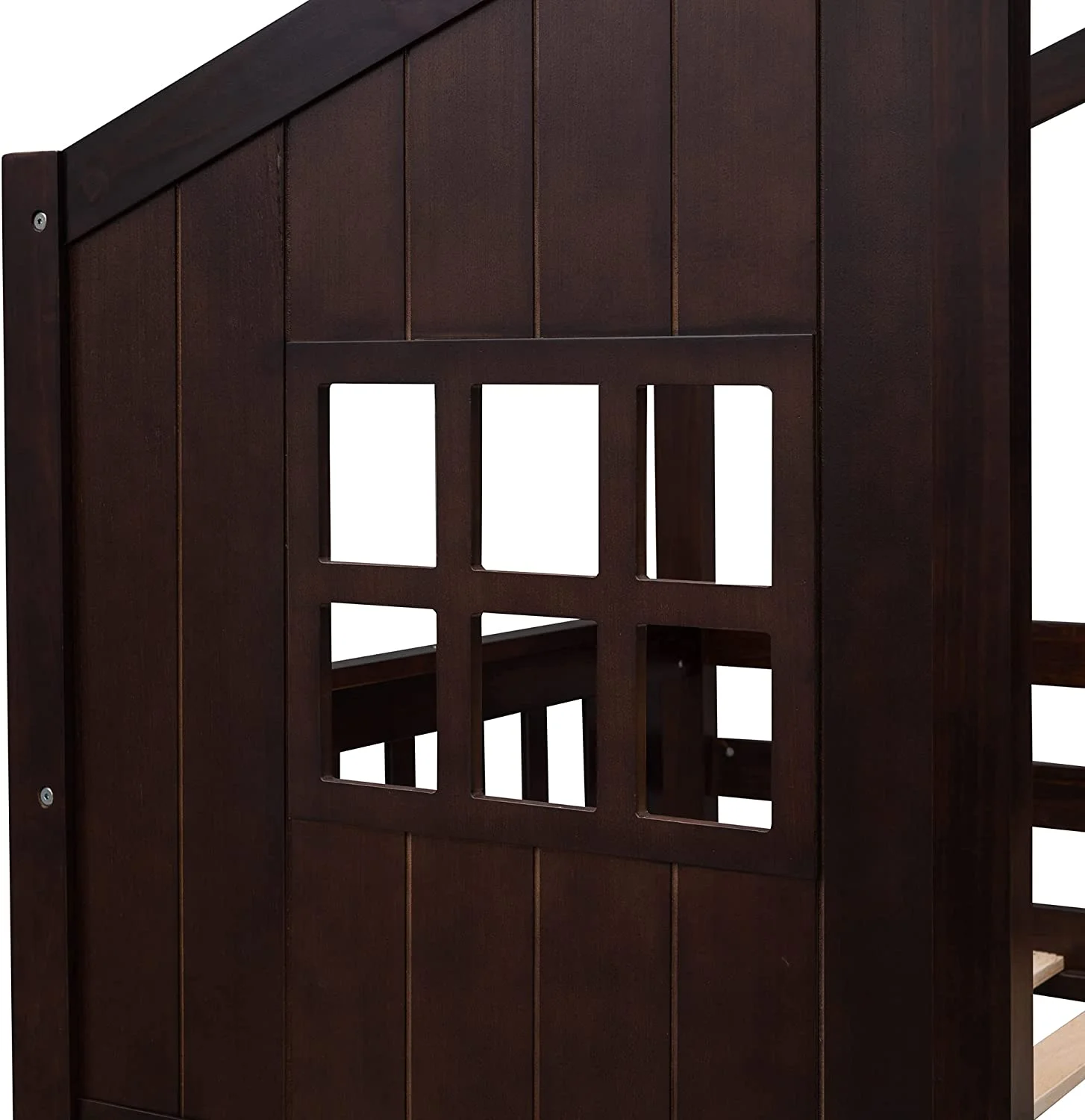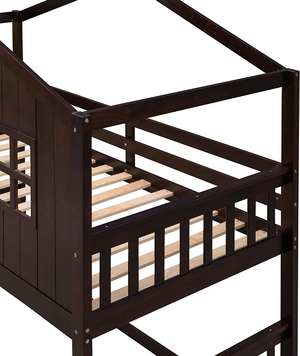 House Buk Bed Over Kids Buk Bed Wood Frame For Girls Boys, Roof Desig ( Size, Espresso)