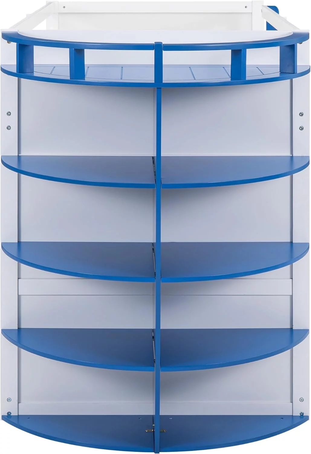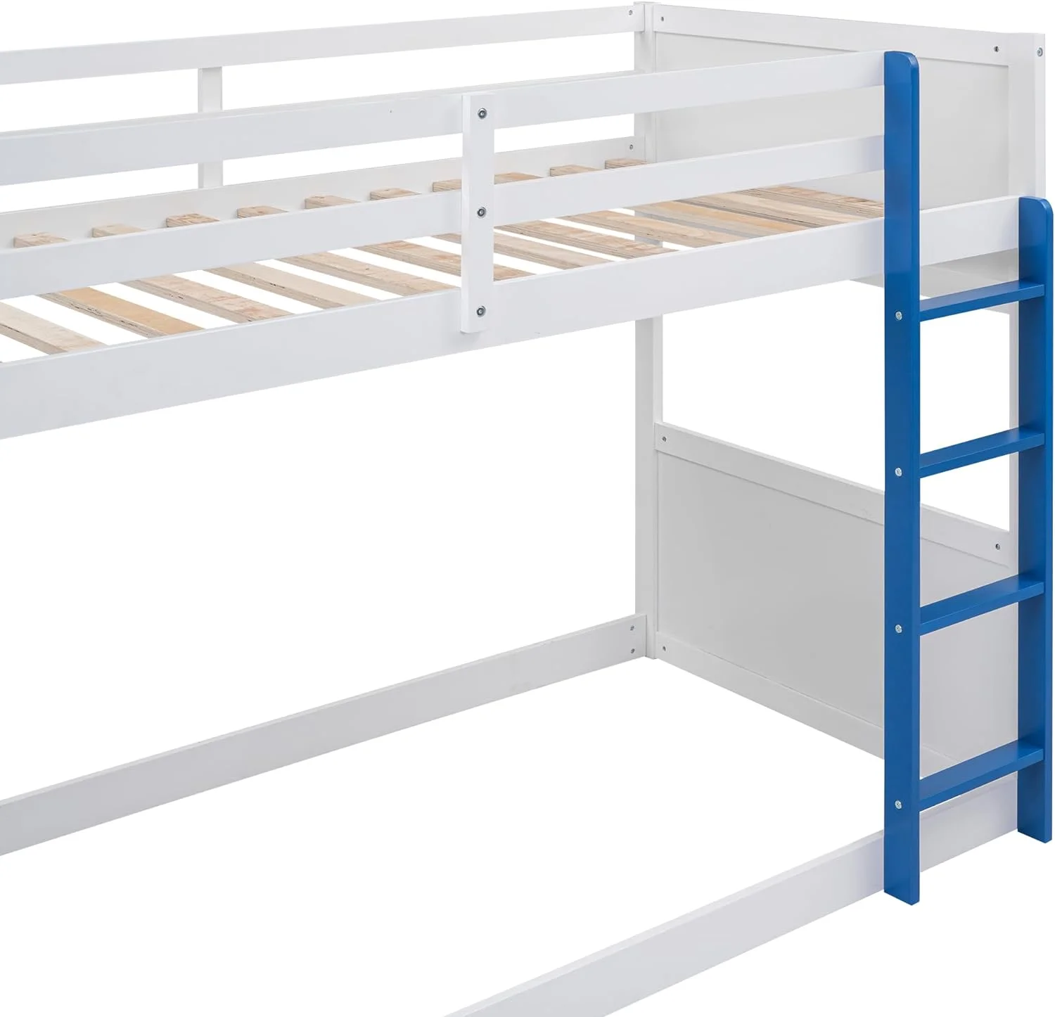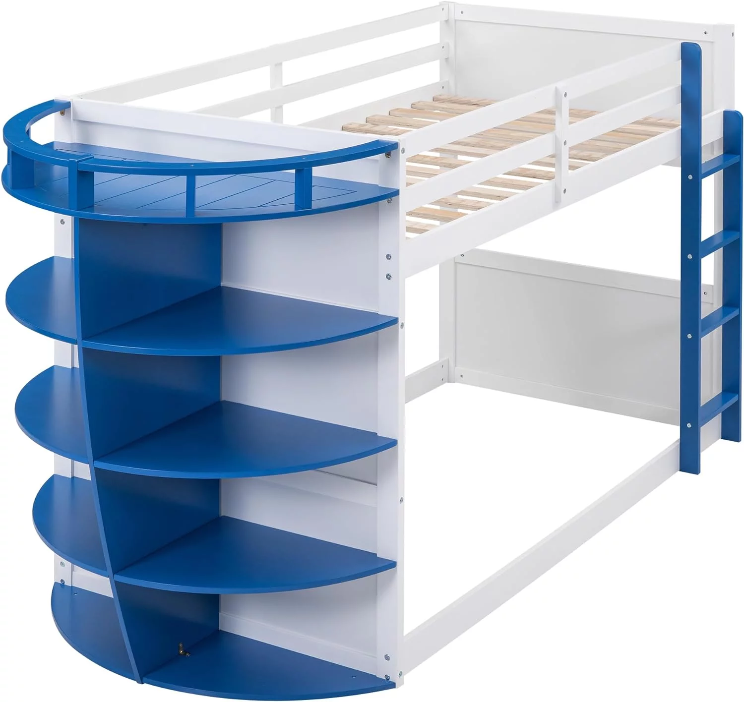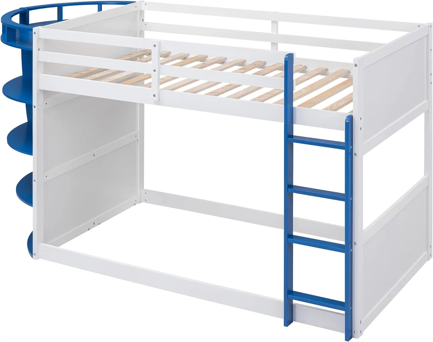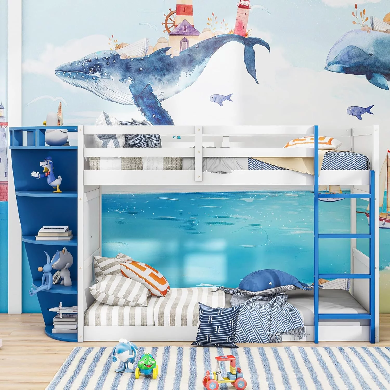 Over Buk Bed With Storage Shelves, Size Low Buk Bed With Ladder Ad Guardrails For Kids, o Box Sprig eeded, Blue Ad White