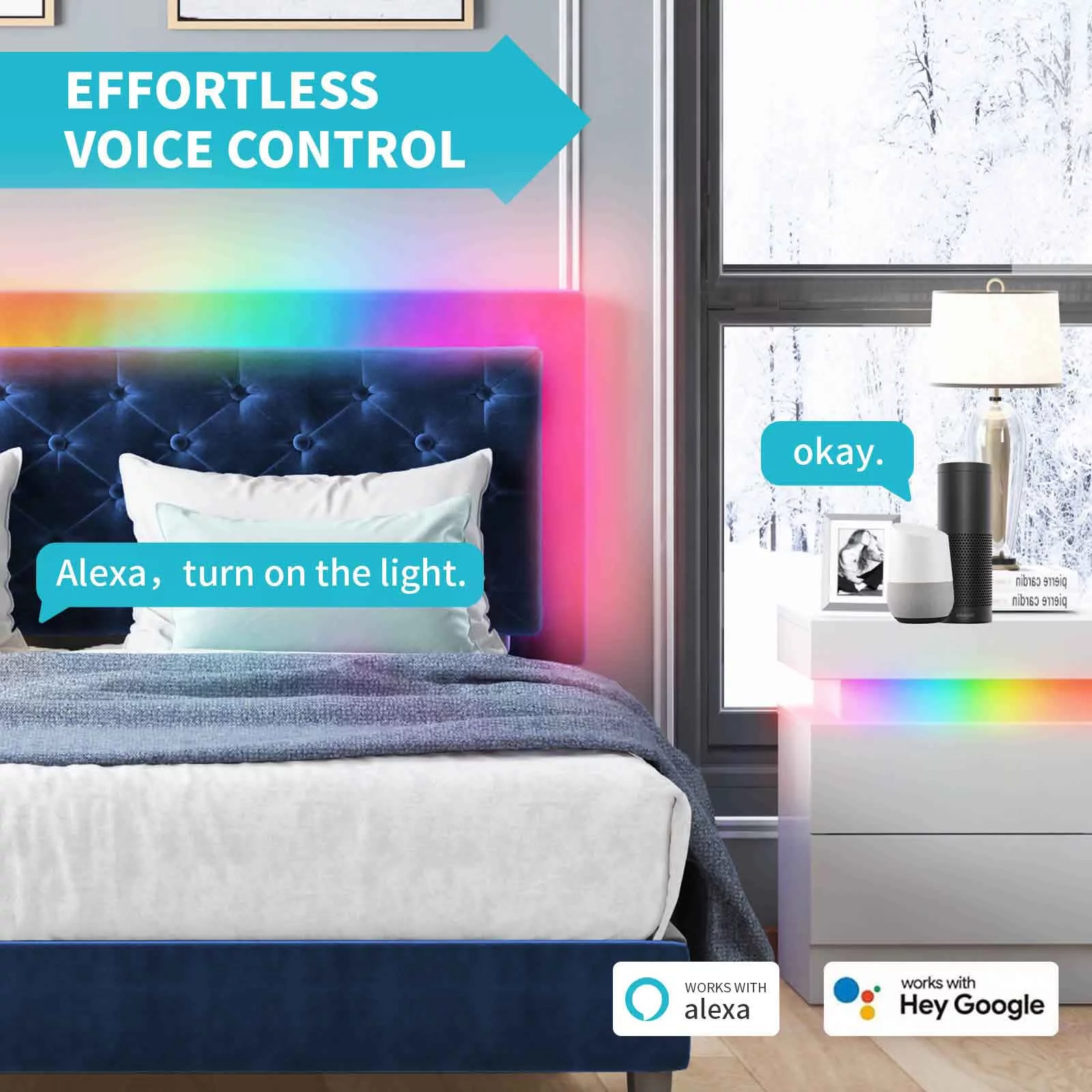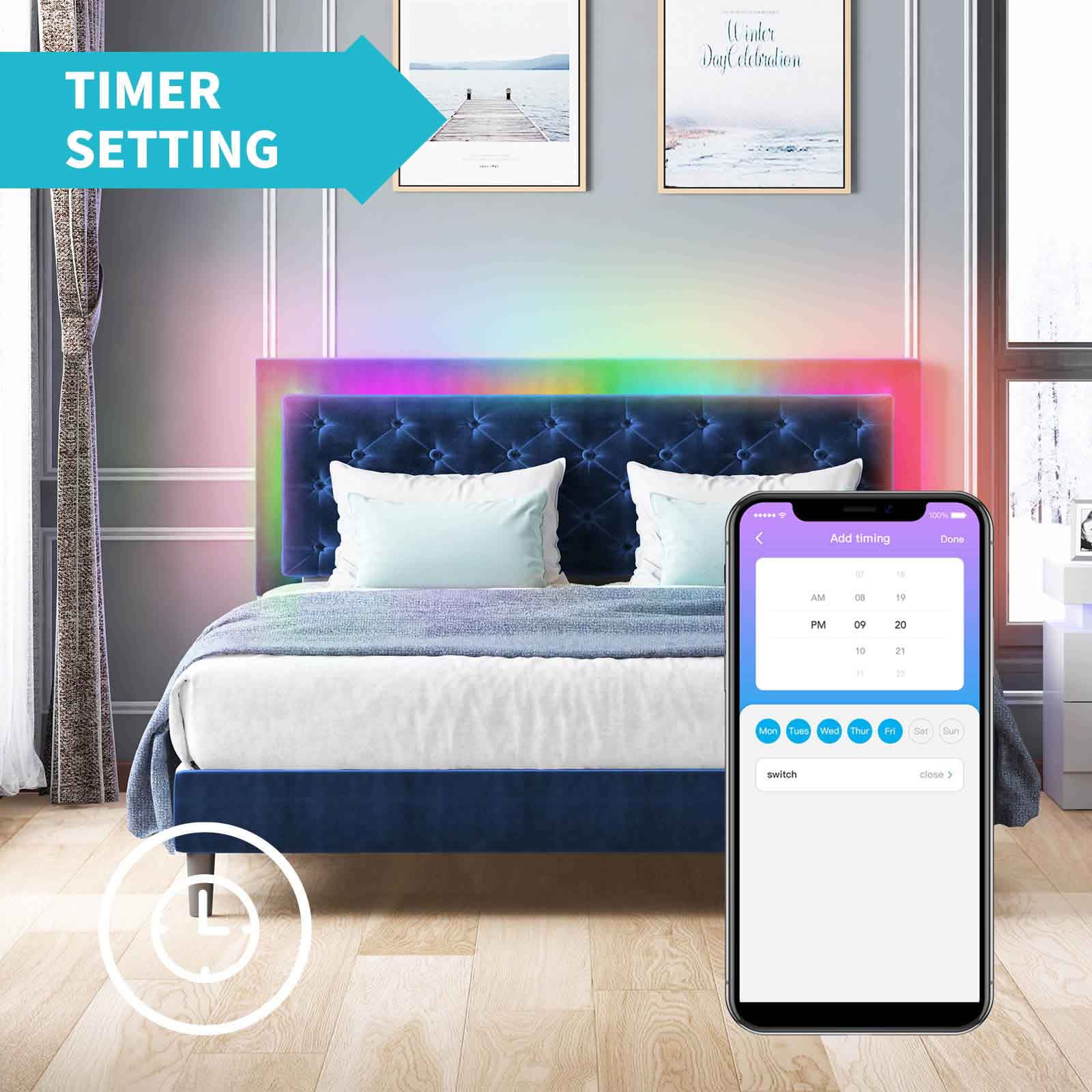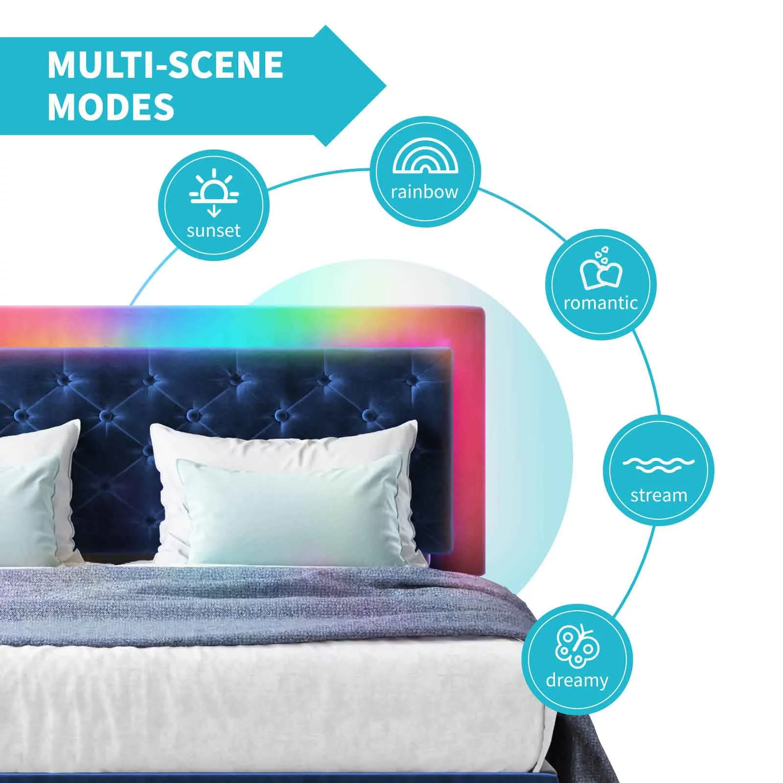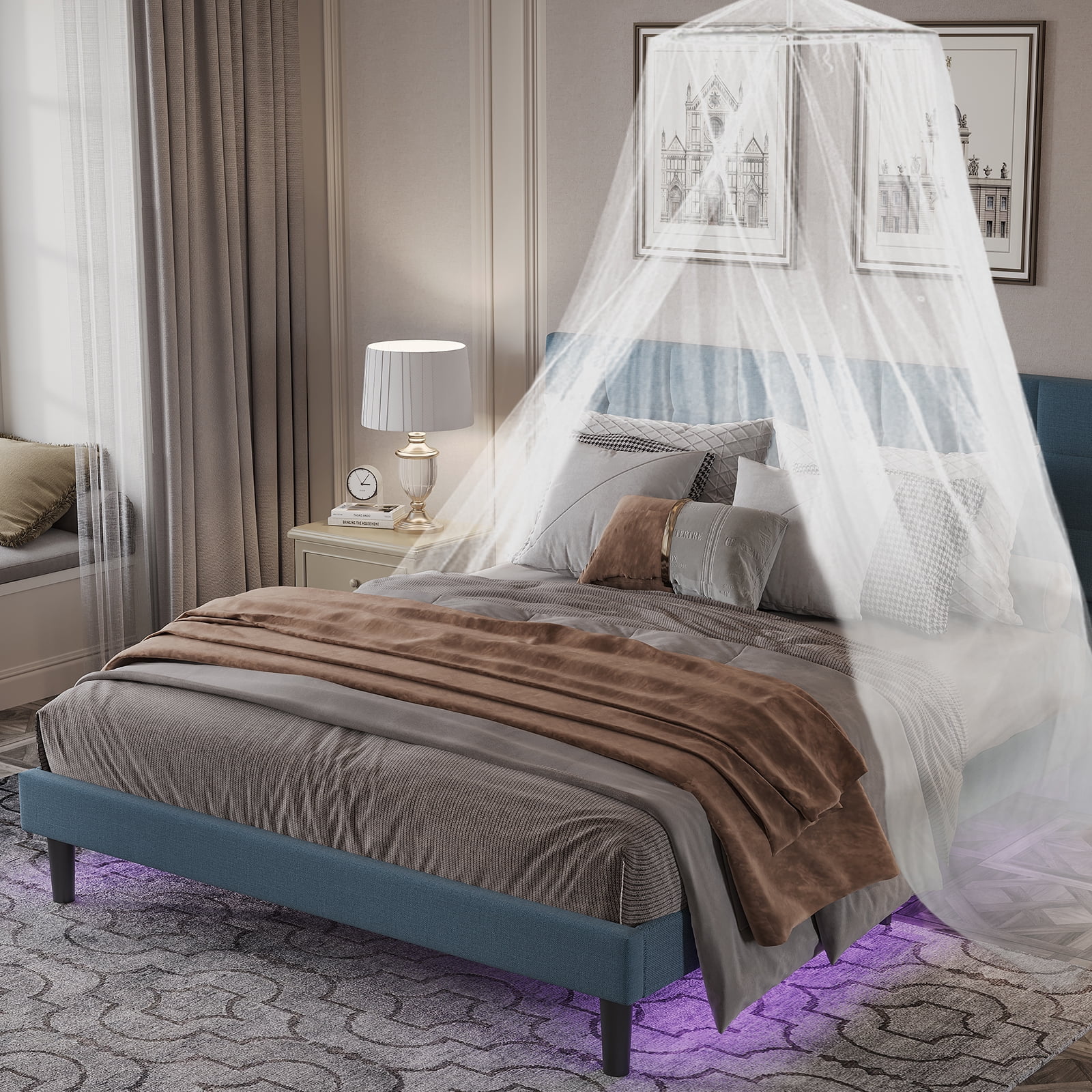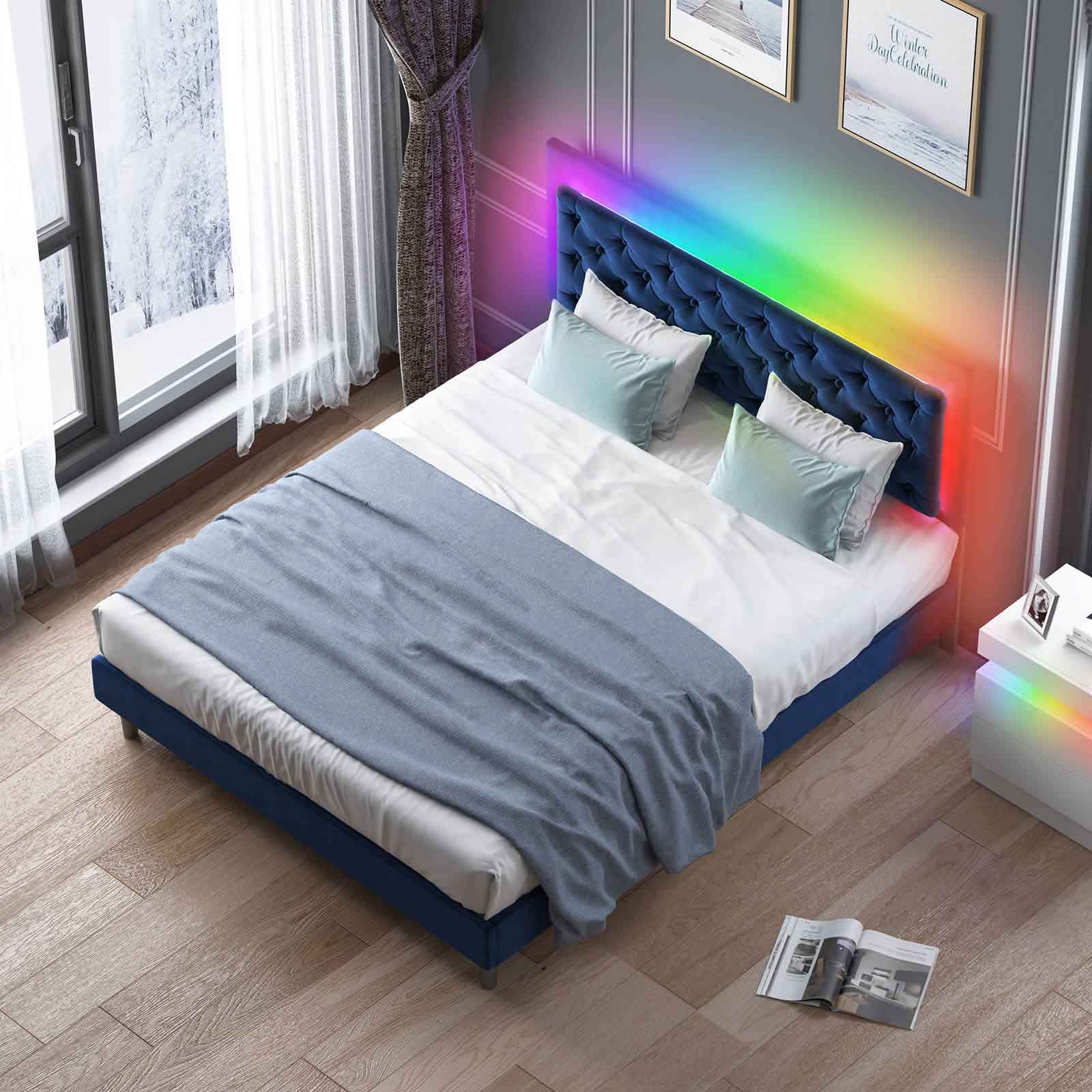 Queen Size Bed Frame with RGB LED Light Stripe, Linen Adjustable Headboard, Noise-Free, Easy Assembly, Blue